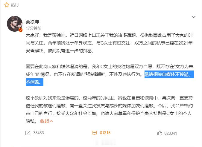 #蔡徐坤回应# 蔡徐坤还是虚啊,只是“恳请相关自媒体不传谣、不信谣”,可惜现在是官方媒体和协会在下场…回想当初吴亦凡就刚多了:“如果有这类行为,自己进监狱!”勿谓言之不预也!再看吴亦凡的粉丝,当初劫狱的劫狱,当狱警的当狱警,ikun们竟找不到能打的,唯一一个也只是“让国家失去了一个重点大学的高材生”…高下立判啊[允悲]