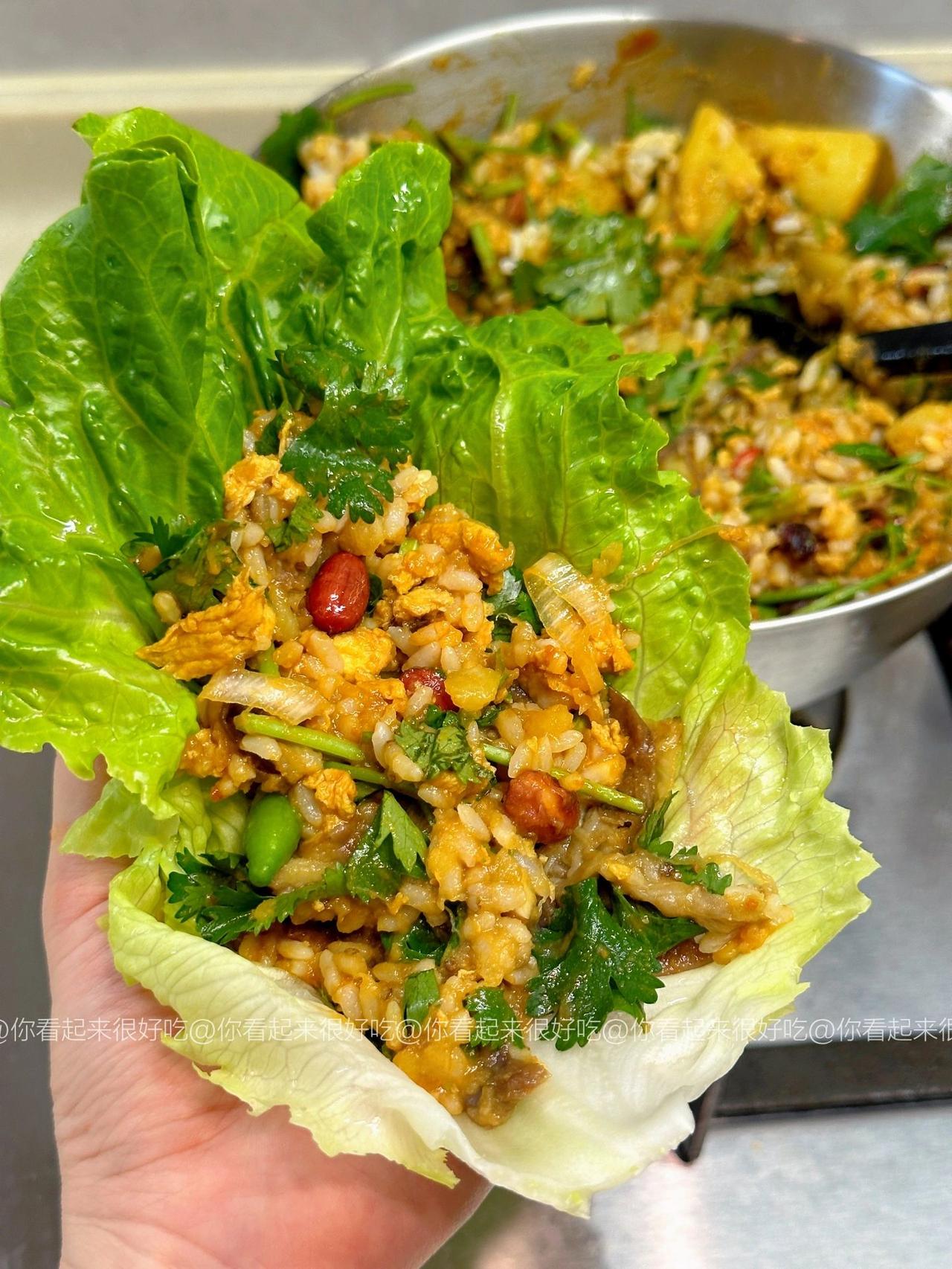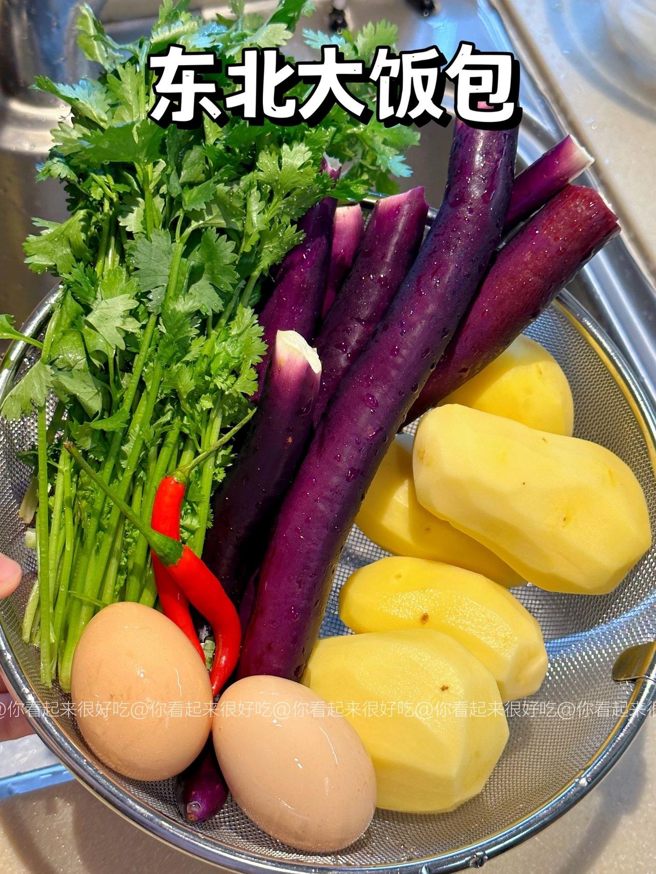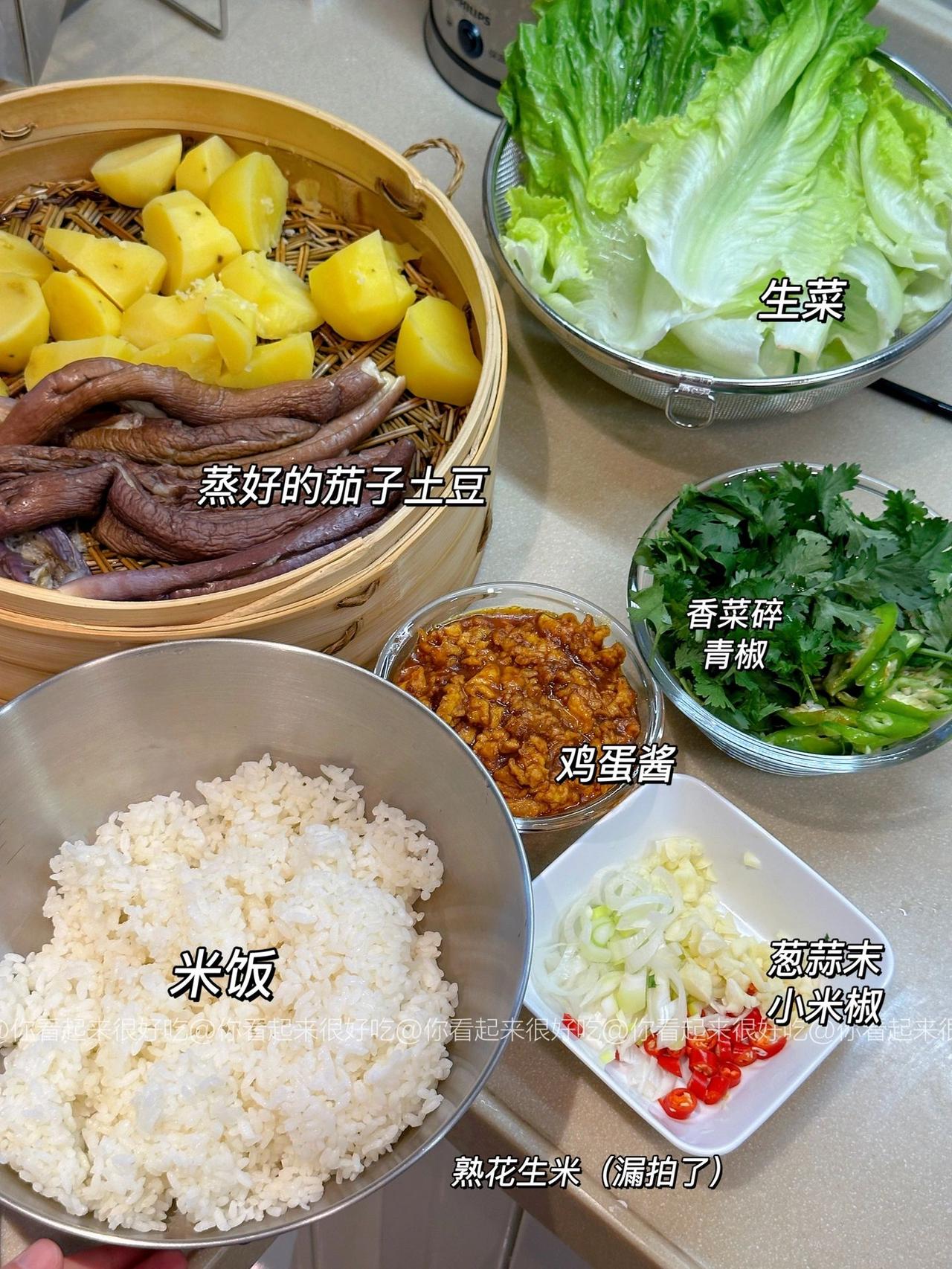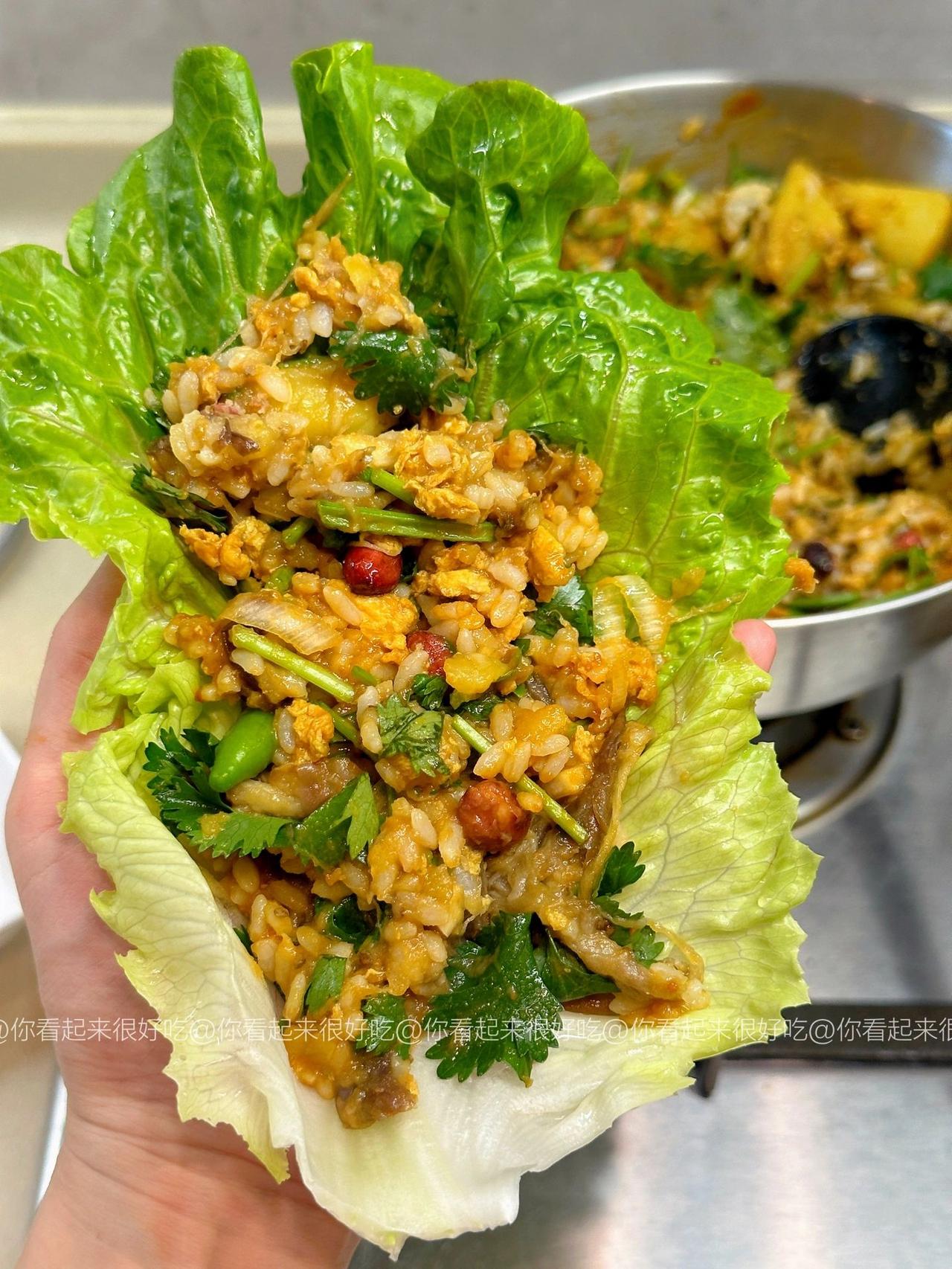 谁懂啊!!东北大饭包的快乐!! 东北大饭包我真的好爱啊啊啊!这个做法是我朋友教我的~ 嗷嗷好吃!!不过她说东北都是大菜叶子,杭州根本买不到,所以就用生菜代替了!! 做法贼简单,只要简单拌一拌,再卷个生菜!啊…绝!!集美们可以马住试试! 食材:土豆、茄子、香菜碎、鸡蛋3个、青椒少许,葱蒜小米椒少许,生菜! 做法:1、土豆茄子洗净后上锅蒸15分钟,用筷子能穿透就行! 2、鸡蛋酱:油热下打散的鸡蛋,用锅铲快速炒散,然后加入3大勺黄酱,1勺白糖,少许老抽上色,炒均匀后来少许清水炒至粘稠就好啦!就靠这个给饭包入味啦! 3、米饭上码上土豆、茄子、香菜、花生米,以及青椒碎、葱蒜小米椒、再淋上鸡蛋酱,直接用大勺子摁压,拌匀就好啦!! 我爱吃辣所以吃了小米椒,大家看需加哦!直接卷个生菜,就可以开造啦!!香!!