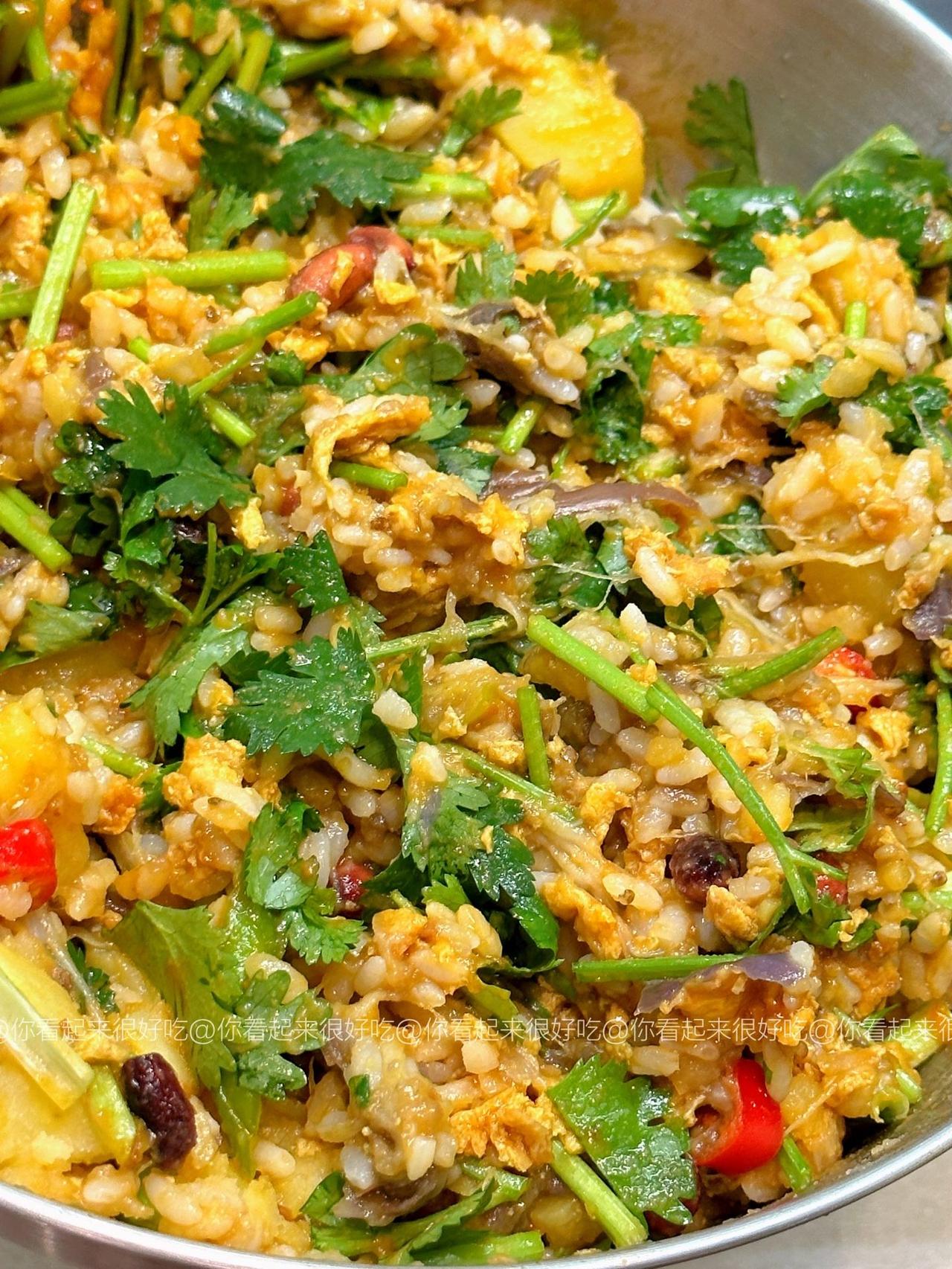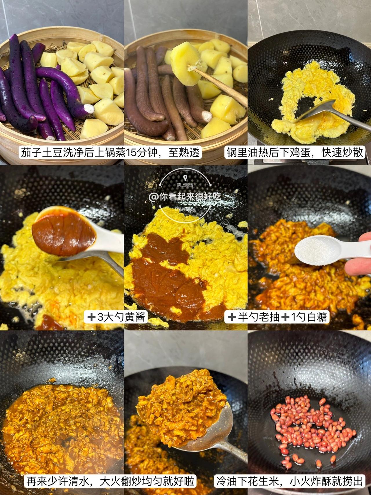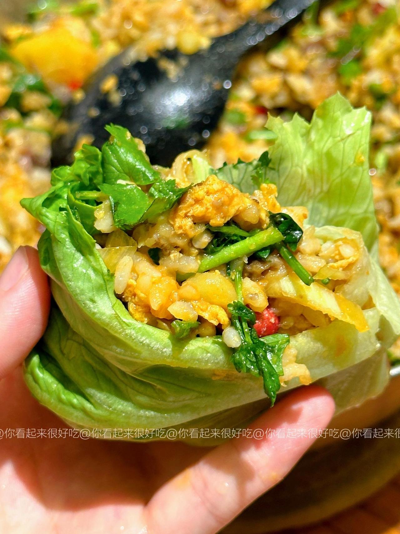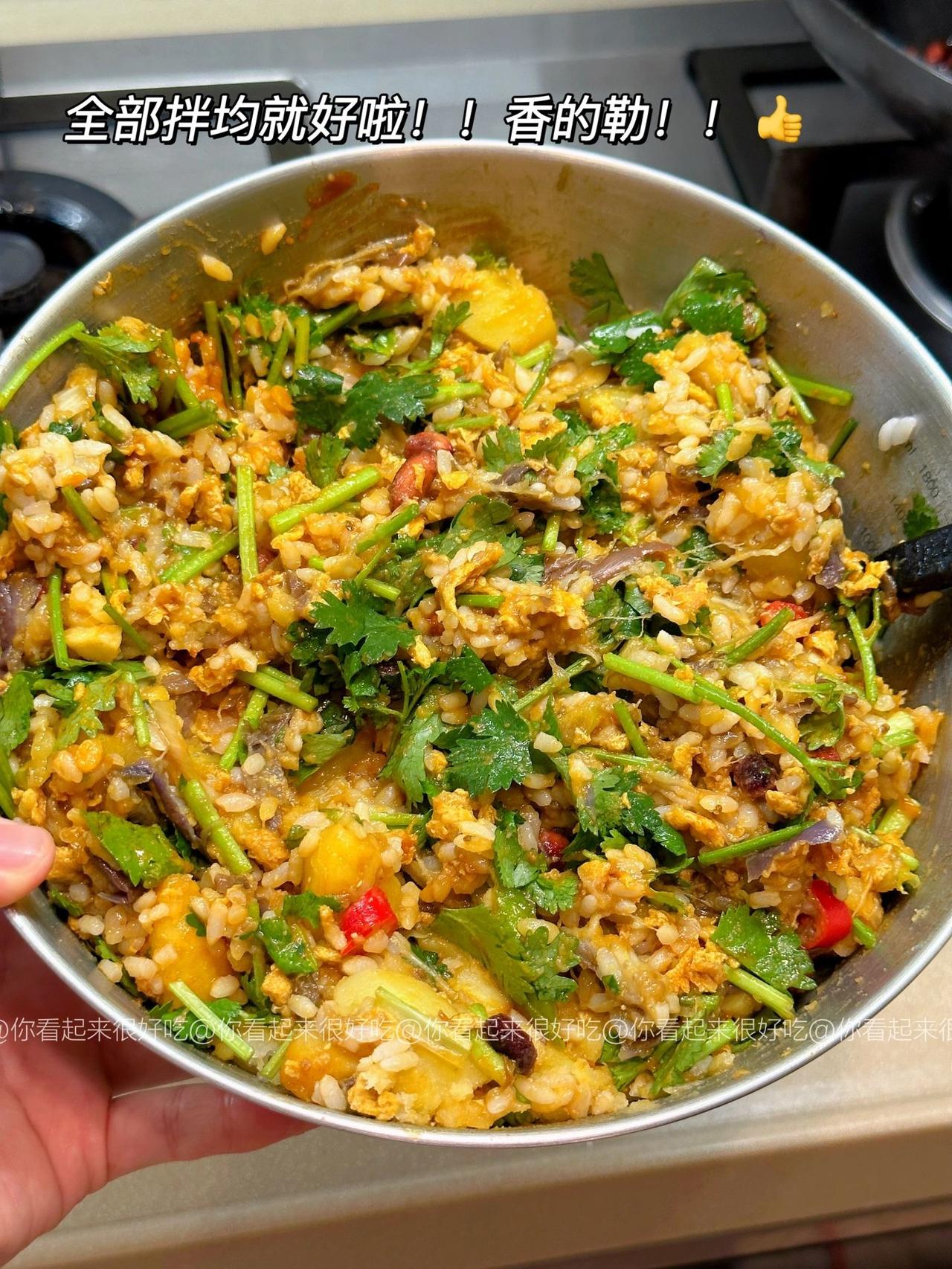 谁懂啊!!东北大饭包的快乐!! 东北大饭包我真的好爱啊啊啊!这个做法是我朋友教我的~ 嗷嗷好吃!!不过她说东北都是大菜叶子,杭州根本买不到,所以就用生菜代替了!! 做法贼简单,只要简单拌一拌,再卷个生菜!啊…绝!!集美们可以马住试试! 食材:土豆、茄子、香菜碎、鸡蛋3个、青椒少许,葱蒜小米椒少许,生菜! 做法:1、土豆茄子洗净后上锅蒸15分钟,用筷子能穿透就行! 2、鸡蛋酱:油热下打散的鸡蛋,用锅铲快速炒散,然后加入3大勺黄酱,1勺白糖,少许老抽上色,炒均匀后来少许清水炒至粘稠就好啦!就靠这个给饭包入味啦! 3、米饭上码上土豆、茄子、香菜、花生米,以及青椒碎、葱蒜小米椒、再淋上鸡蛋酱,直接用大勺子摁压,拌匀就好啦!! 我爱吃辣所以吃了小米椒,大家看需加哦!直接卷个生菜,就可以开造啦!!香!!