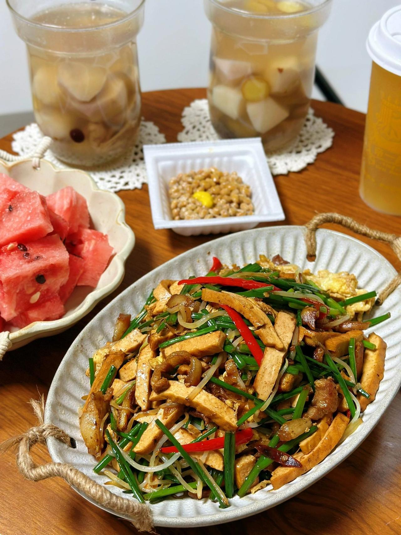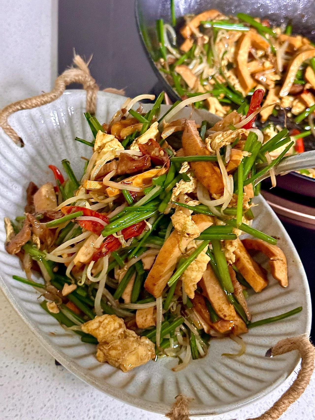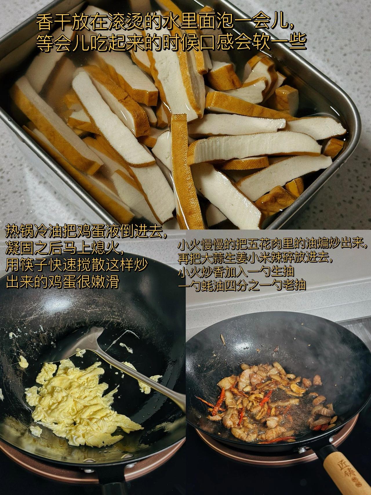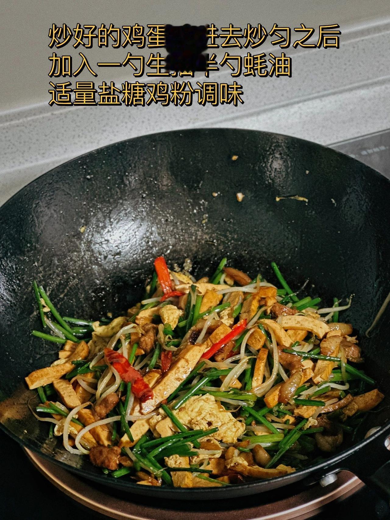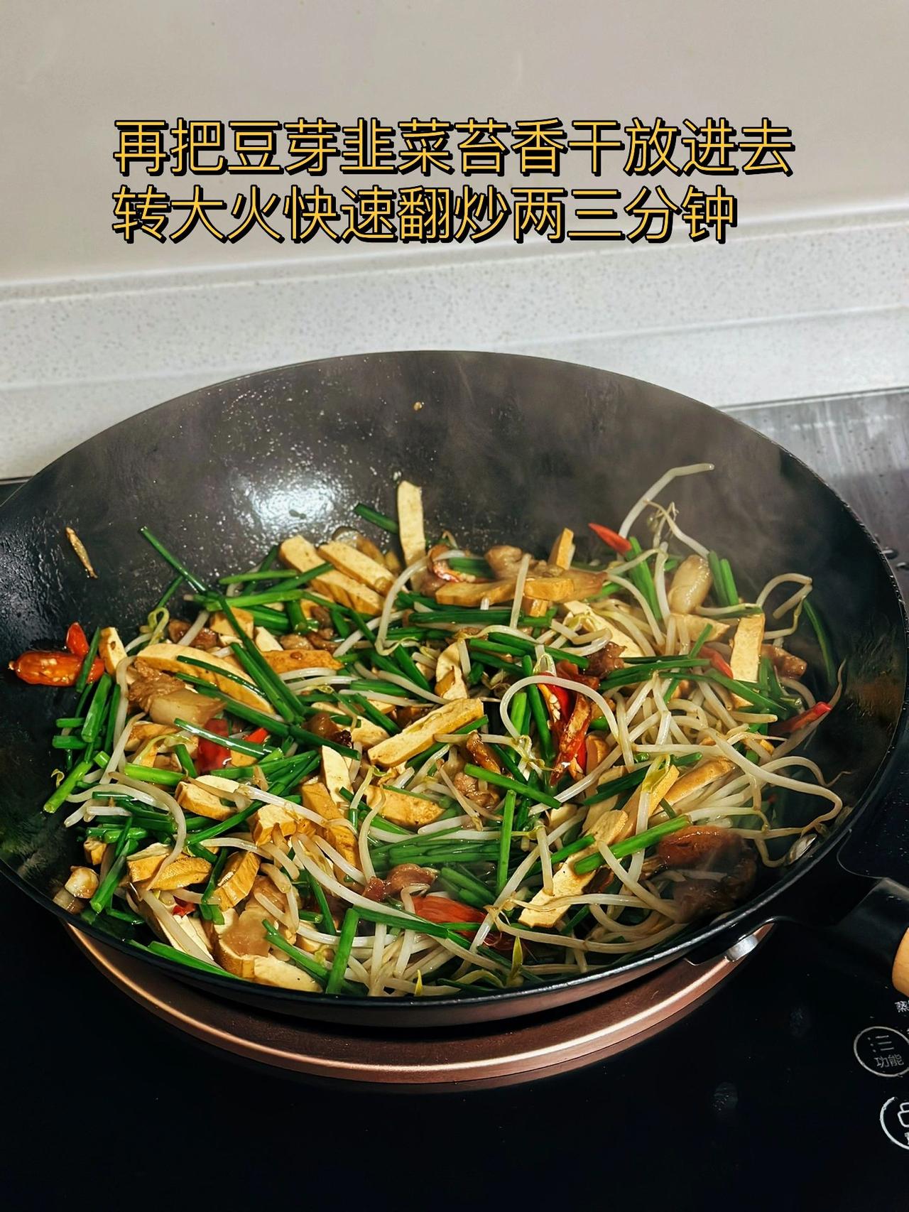 韭菜苔炒香干/下饭家常菜 昨天偶然间在网上看到别人烧这道菜,觉得感觉应该挺好吃的,旁边超市卖的那个韭菜台有点太老了,那天晚上在网上买菜的时候看见有顺便买了一点,没想到还挺嫩配着香干和五花肉炒了一大盘吃的挺香,就是有点费饭 1. 这次买的韭菜苔还挺嫩的,所有的材料都准备好,本来是可以不用放豆芽的,家里刚好有我就放了但是没想到炒在一起脆脆的挺好吃 2. 香干放在滚烫的水里面泡一会儿,等会儿吃起来的时候口感会软一些 3. 热锅冷油把鸡蛋液倒进去,凝固之后马上熄火,用筷子快速搅散这样炒出来的鸡蛋很嫩滑 4. 小火慢慢的把五花肉里的油煸炒出来,再把大蒜生姜小米辣碎放进去,小火炒香加入一勺生抽一勺蚝油四分之一勺老抽 5. 再把豆芽韭菜苔香干放进去转大火快速翻炒两三分钟 6. 炒好的鸡蛋放进去炒匀之后加入一勺生抽半勺蚝油适量盐糖鸡粉调味 7. 这道菜用五花肉炒是灵魂腊肉也可以比普通的油炒起来要香很多,超级下饭的一道菜,因为韭菜苔很提味