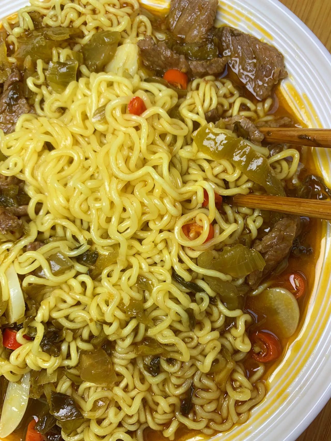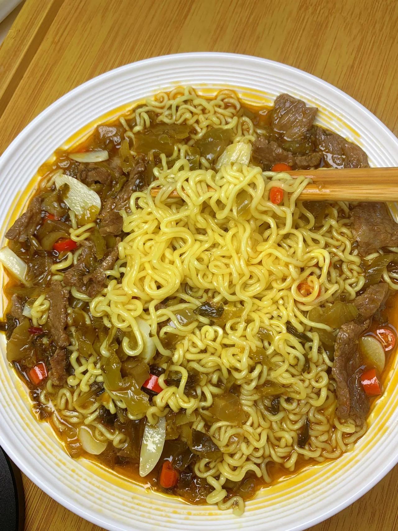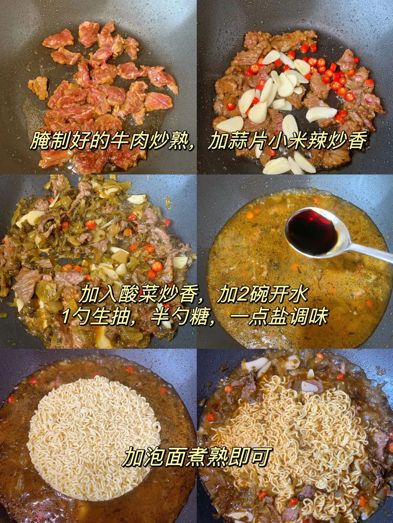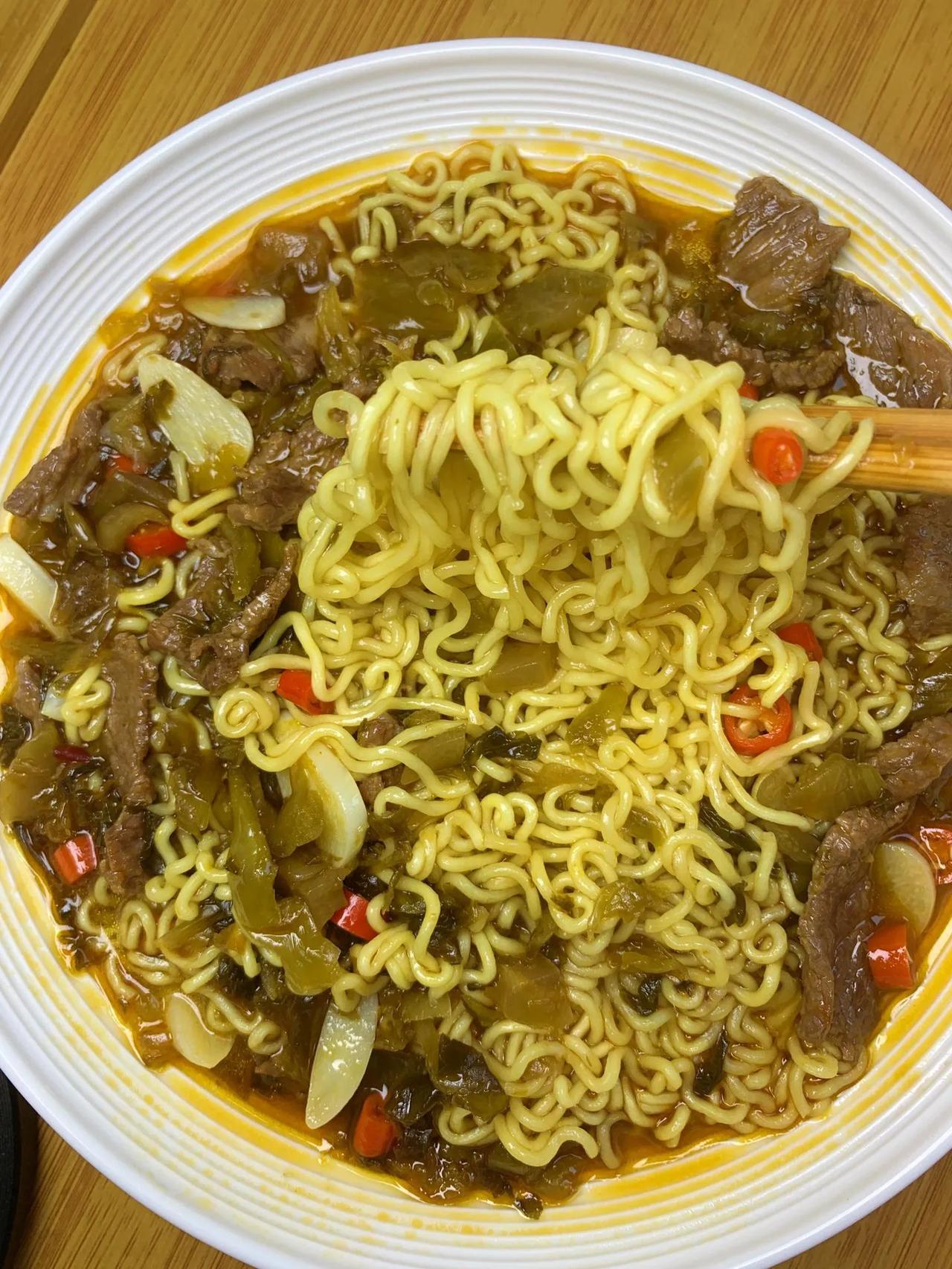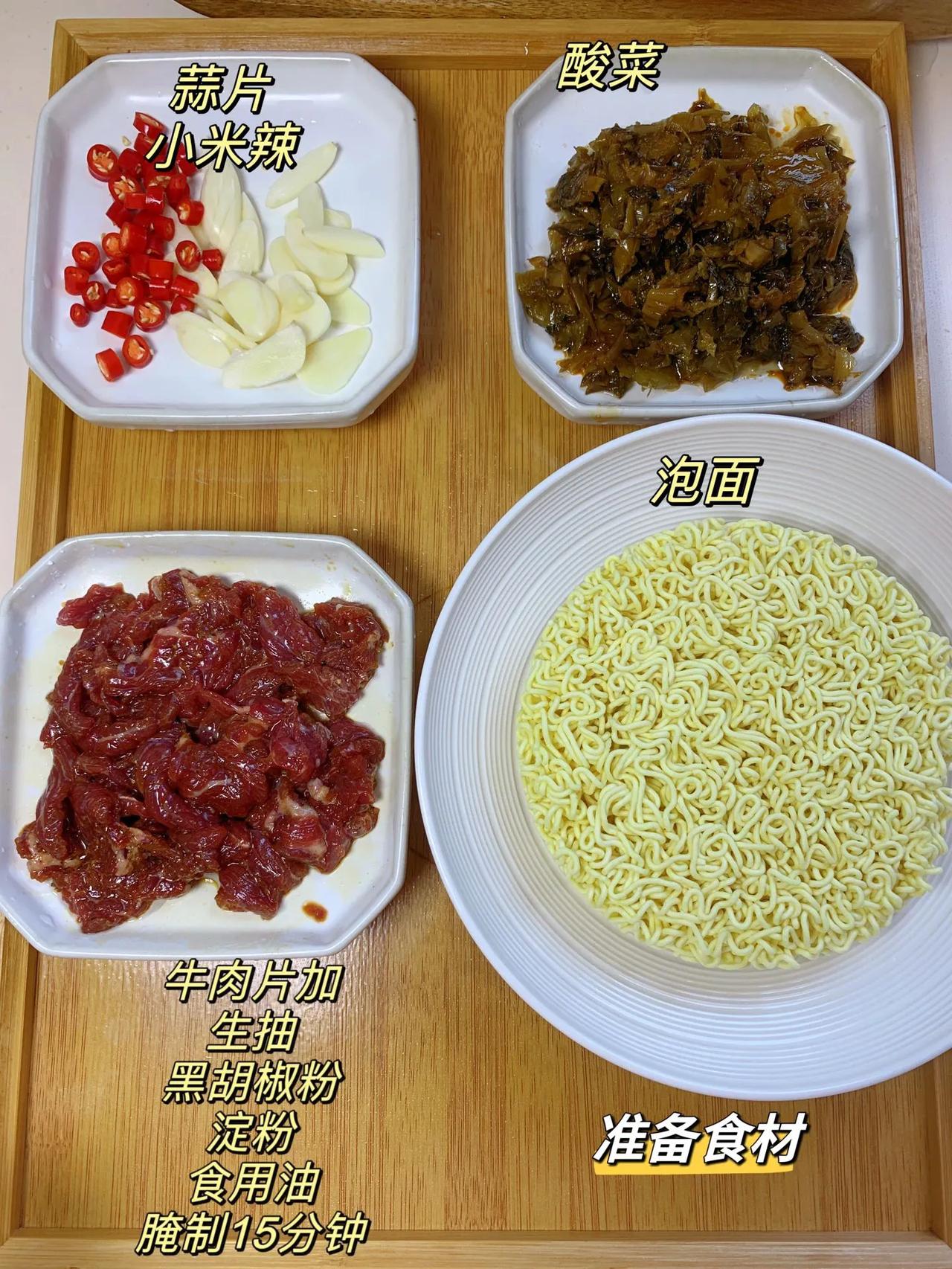 一定要试试这个面条!真的巨好吃! 今天我们吃酸菜牛肉面牛肉滑嫩,酸菜解腻,好吃到可以去开店了! 做法: 1、牛肉片加生抽、黑胡椒粉、淀粉、食用油腌制15分钟; 2、腌制好的牛肉炒熟,加蒜片、小米辣炒香,加入酸菜炒香,加2碗开水、1勺生抽、半勺糖、一点盐调味,加泡面煮熟即可。
