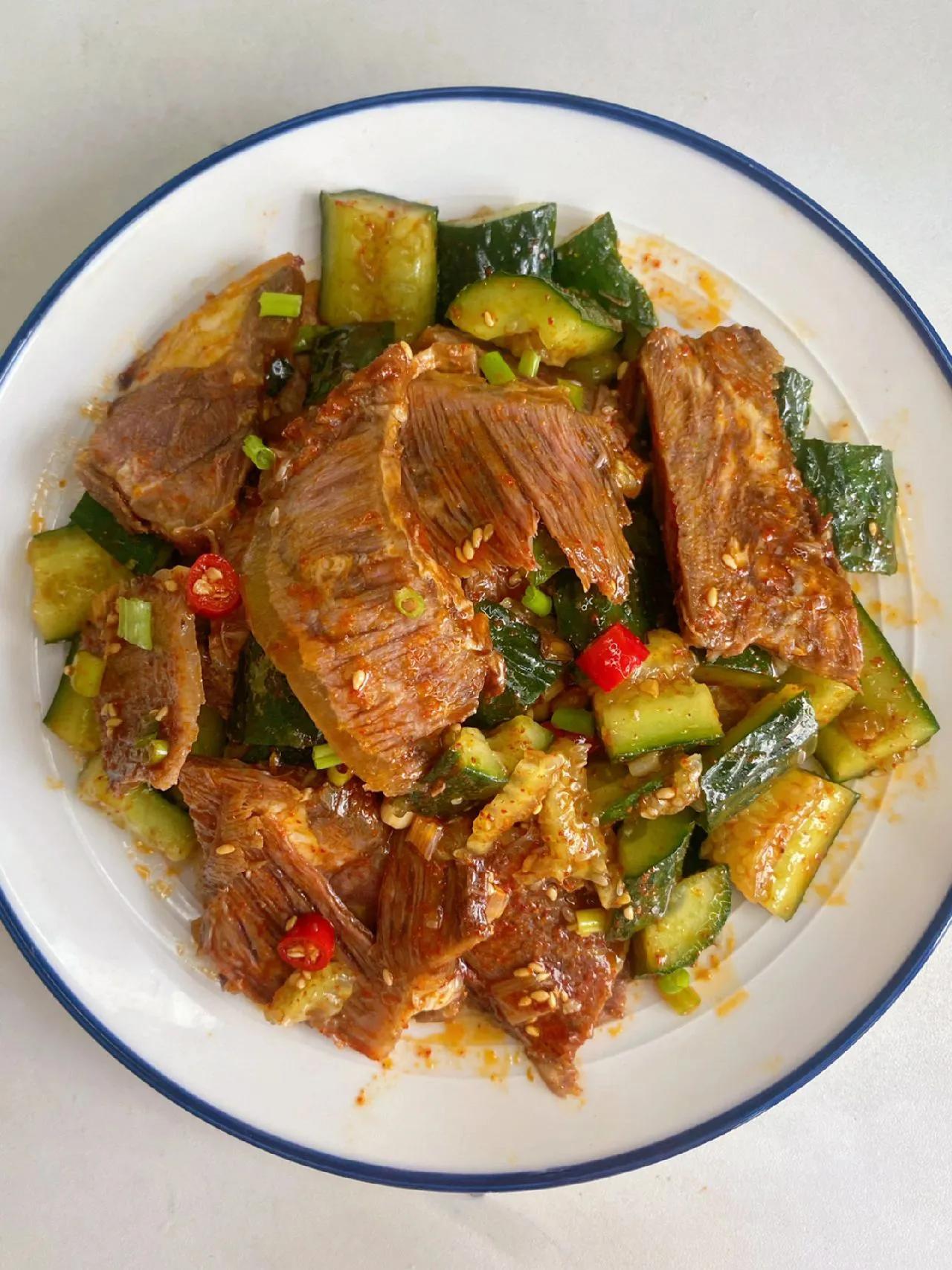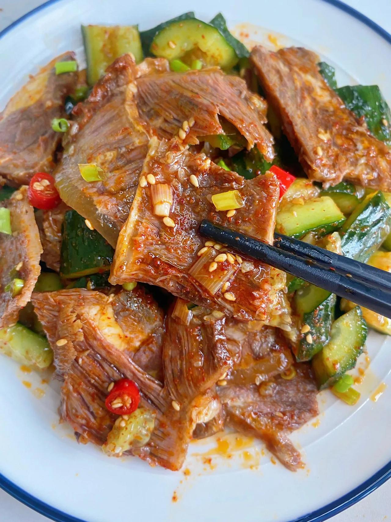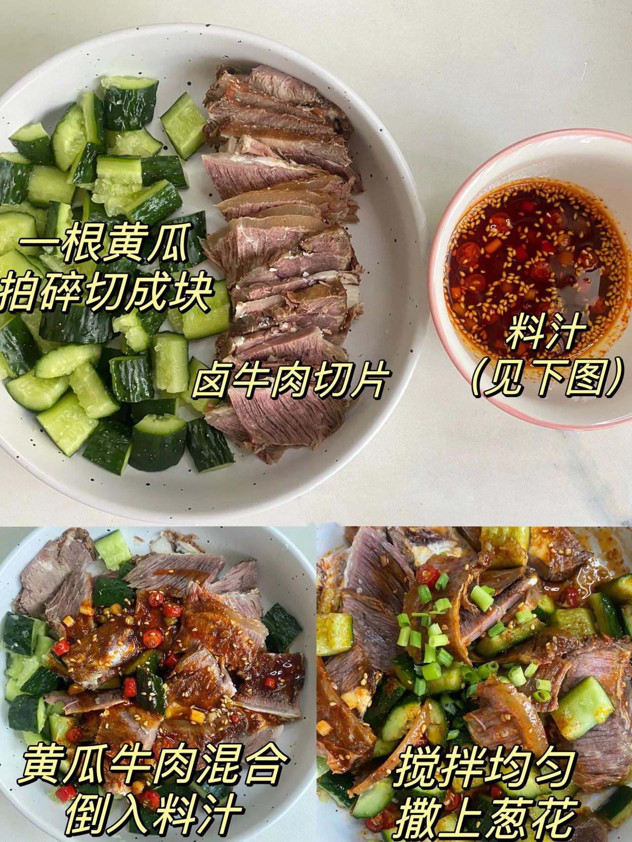 连吃一星期,不愧是我妈! 今天分享一道凉拌牛肉哦…这样做出来的牛肉真的是太嫩啦,香香辣辣的,配上点黄瓜清脆解腻! 做法: 1、调料汁:碗中放葱花、辣椒粉、小米辣、白芝麻淋入热油激发出香味后,再加生抽2勺、蚝油半勺、香醋2勺、白糖、盐搅拌均匀备用; 2、一根黄瓜拍碎切成块,卤牛肉切片; 3、黄瓜和牛肉混合,倒入料汁搅拌均匀,最后撒上葱花即可。