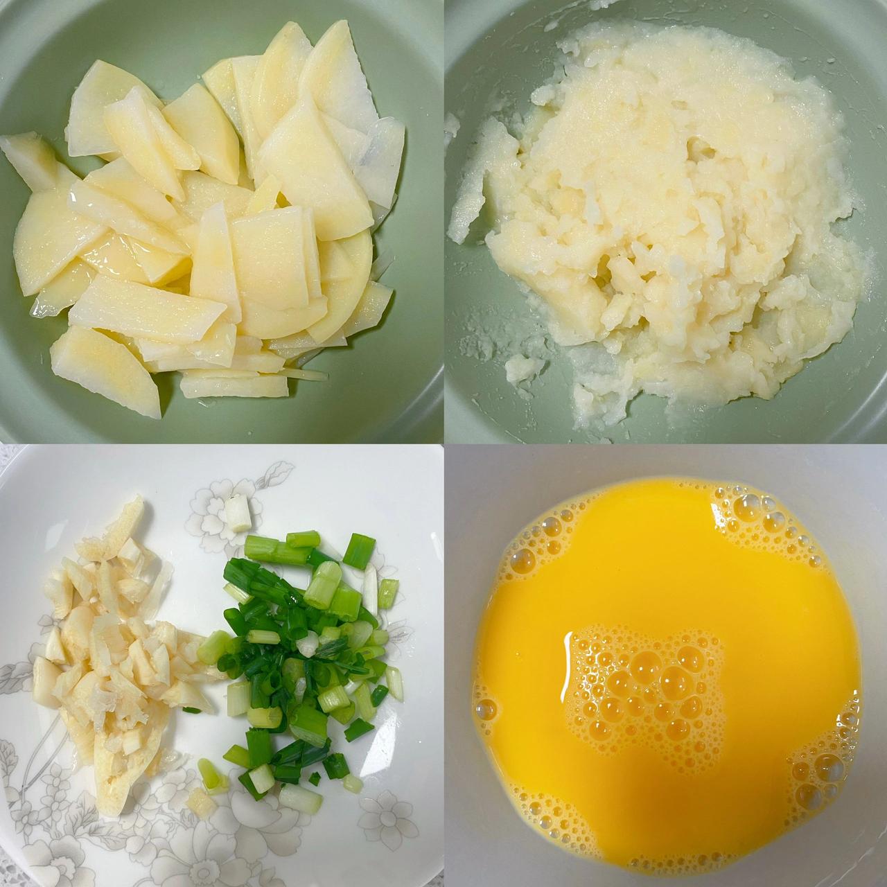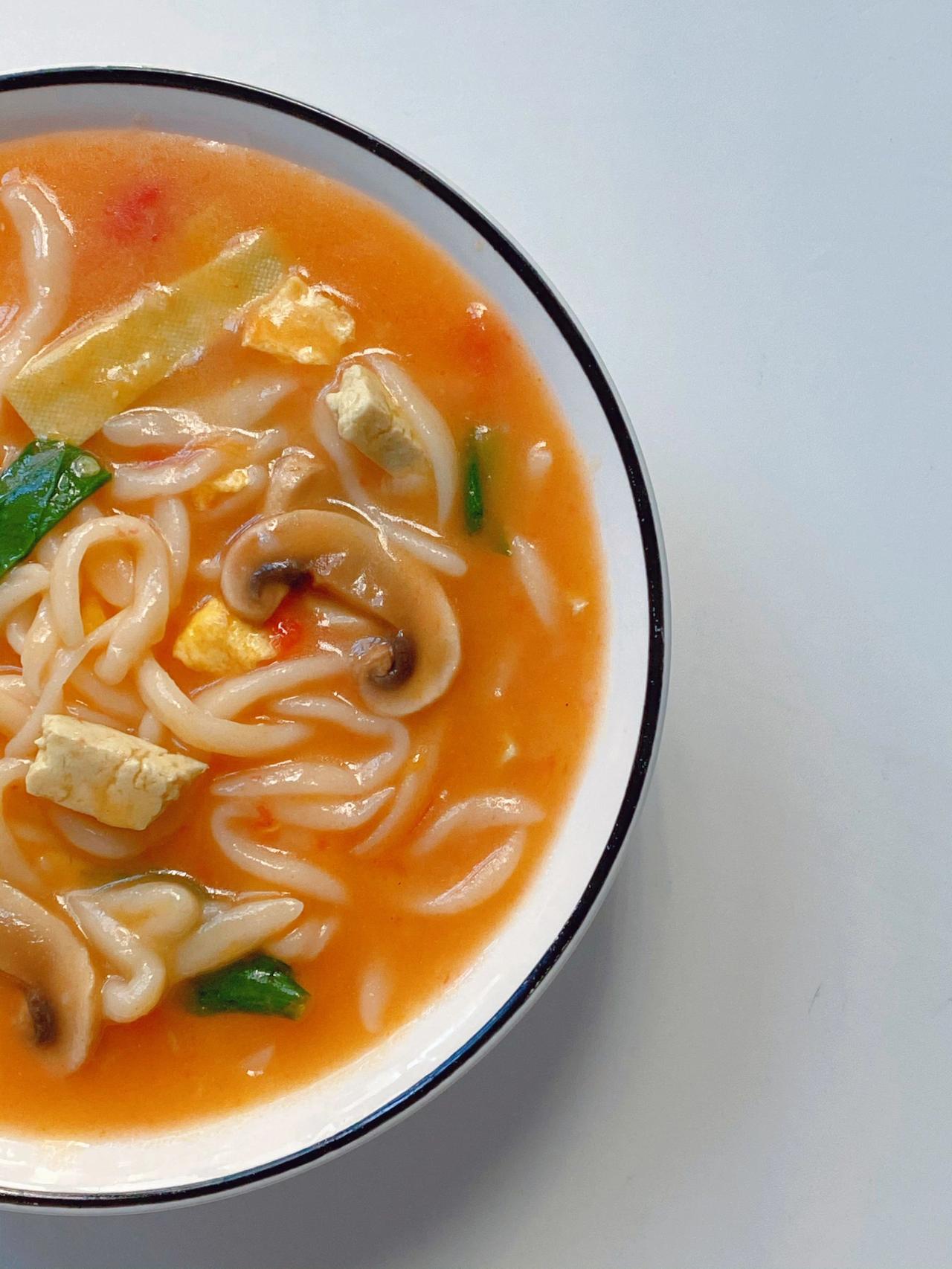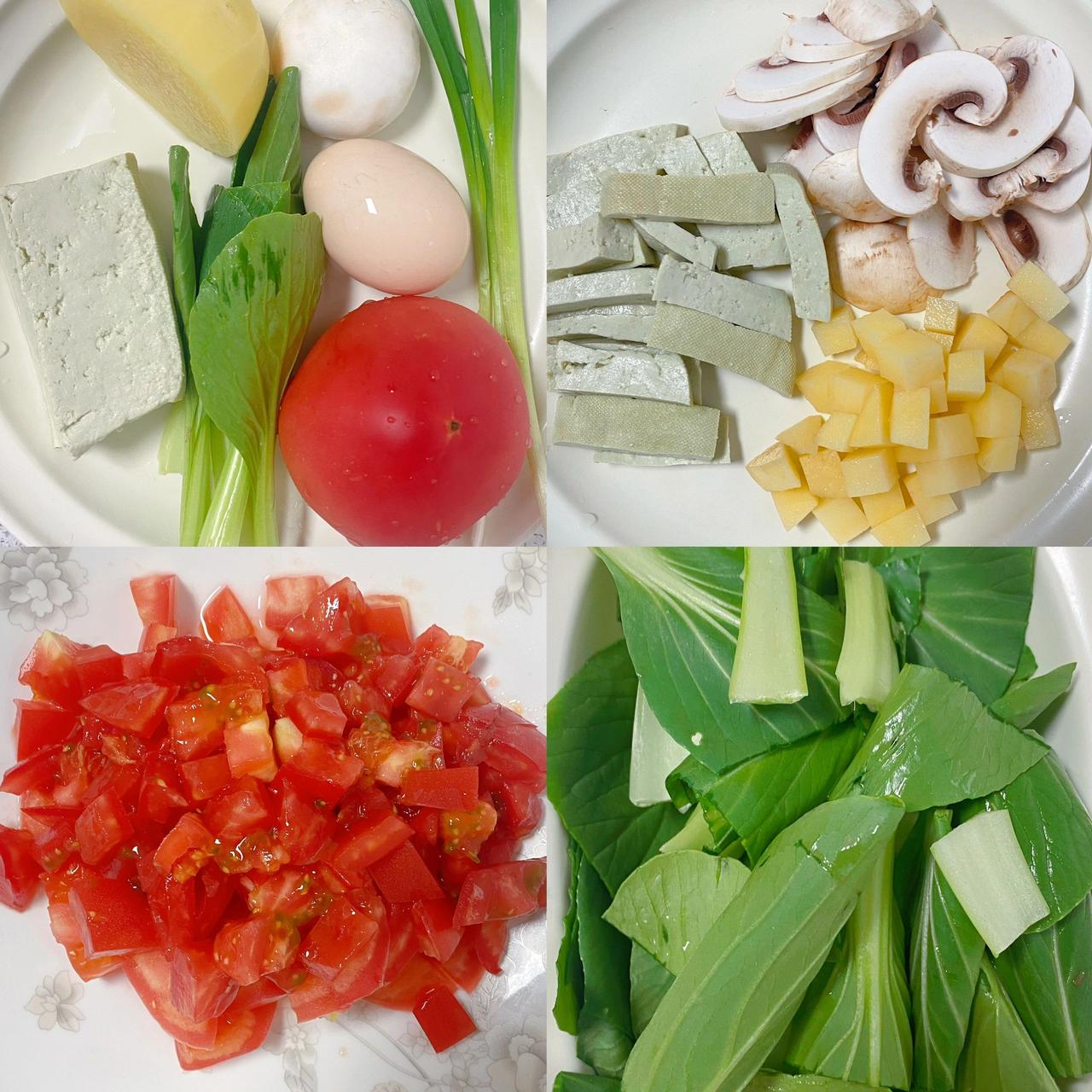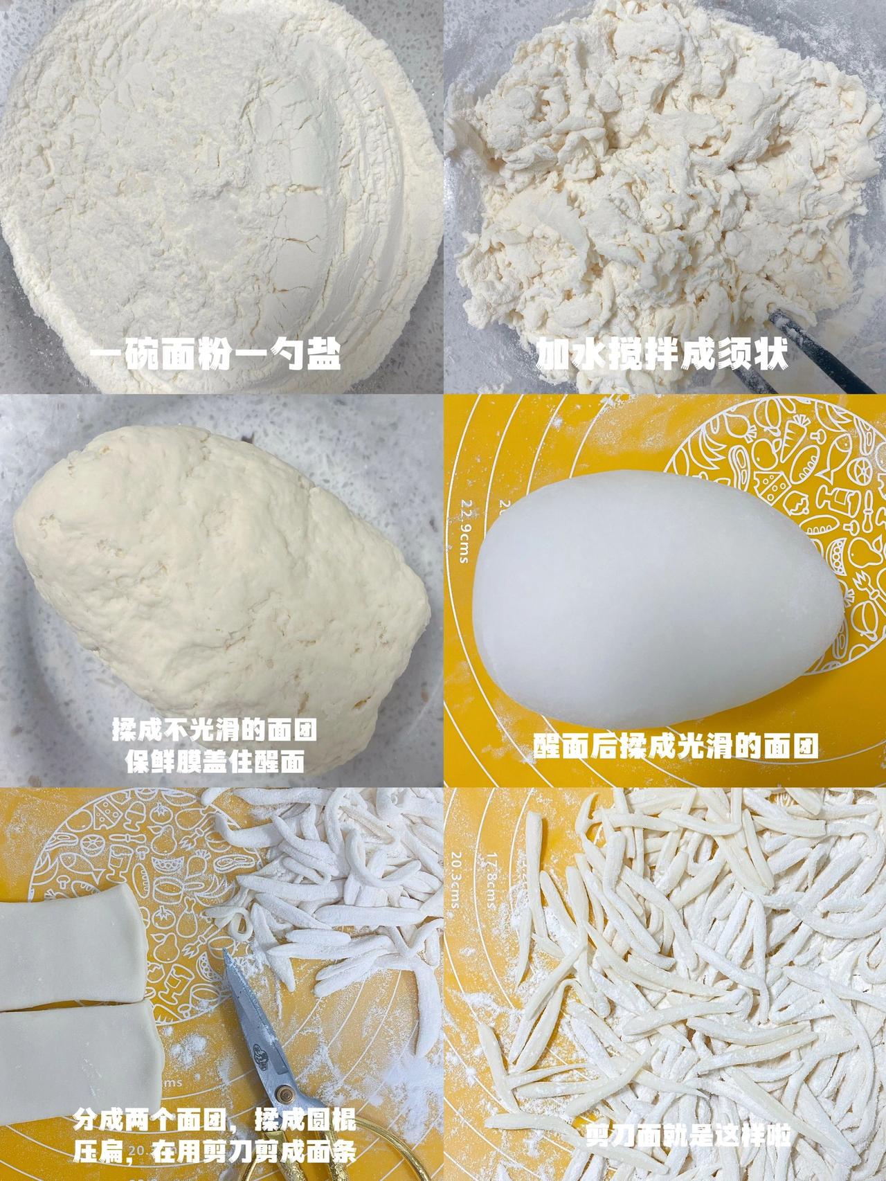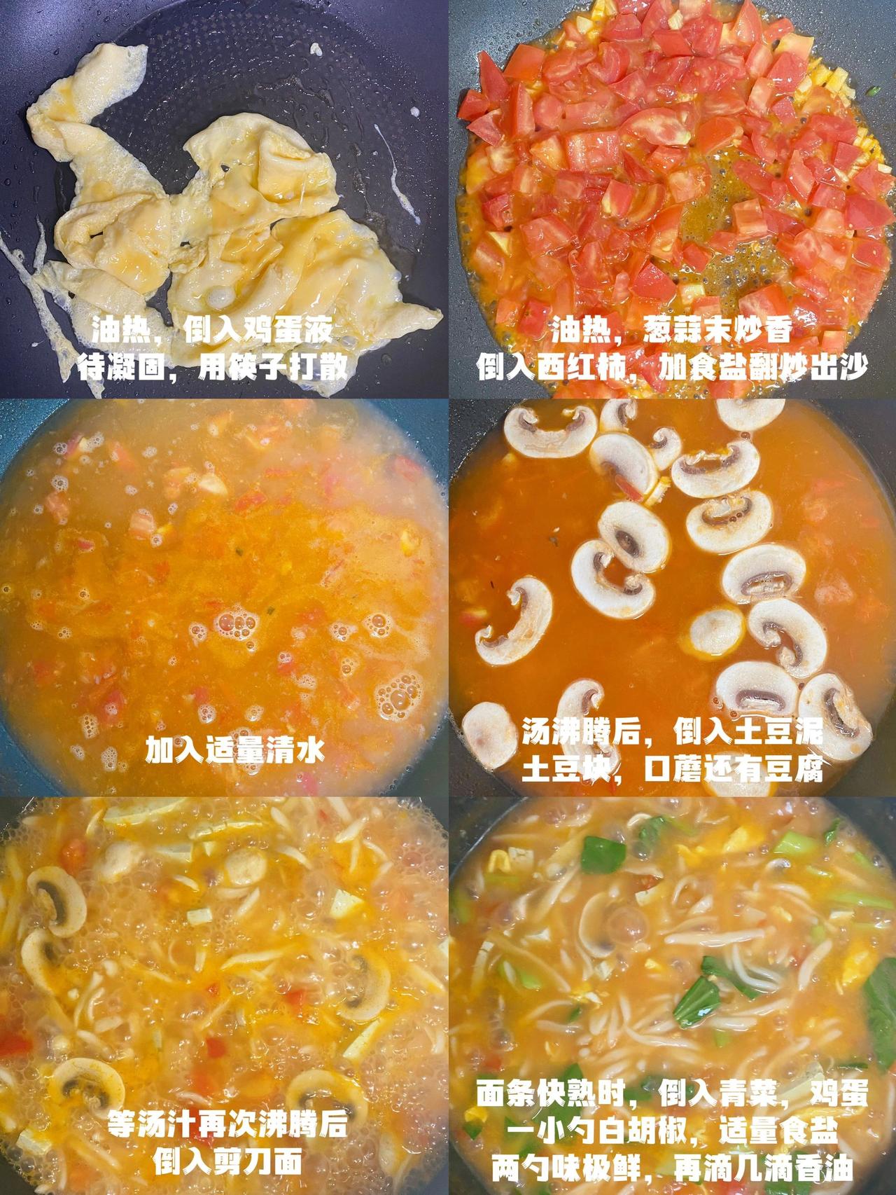 小朋友的番茄土豆浓汤剪刀面 食材:剪刀面,土豆,番茄,口蘑,豆腐,小青菜,小葱,大蒜 调味料:食盐,白胡椒粉,味极鲜,香油 步骤:1、准备工作:所有蔬菜都清洗干净,土豆一半切成如图所示的小块,一半切成片;口蘑切片,豆腐切条,西红柿切块,小青菜切段,小葱切成如图所示的小段,大蒜切成末。备用。 2、剪刀面:一碗面粉,一勺食盐,加入适量水,搅拌成须状,揉成不光滑的面团,盖上保鲜膜醒面。醒面后先揉成光滑的面团,在分成两个小剂子,揉成圆棍状,压扁,用剪刀剪成面条。如图所示 3、蒸土豆:土豆切成片状的,放进蒸锅,蒸到可以用筷子夹烂就行。出锅后,压成泥。 4、炒鸡蛋:鸡蛋液中加入少许清水,少许食盐,搅拌均匀,锅热倒油,油热倒入鸡蛋液,蛋液凝固时,用筷子打散。备用 5、熬浓汤:锅热倒油,油热倒入蒜末葱香炒出香味,加入西红柿块,一勺食盐,炒出沙,加清水,煮至沸腾,将土豆泥和蔬菜蔬菜倒入汤汁中。 6、煮面条:汤汁再次沸腾后,倒入剪刀面,煮至5分钟后,在加入小青菜和鸡蛋碎。煮至面条熟。 7、调味:加入适量食盐,两勺味极鲜,一小勺白胡椒粉,几滴香油,搅拌均匀即可。 好吃到,浓浓的汤汁都不剩