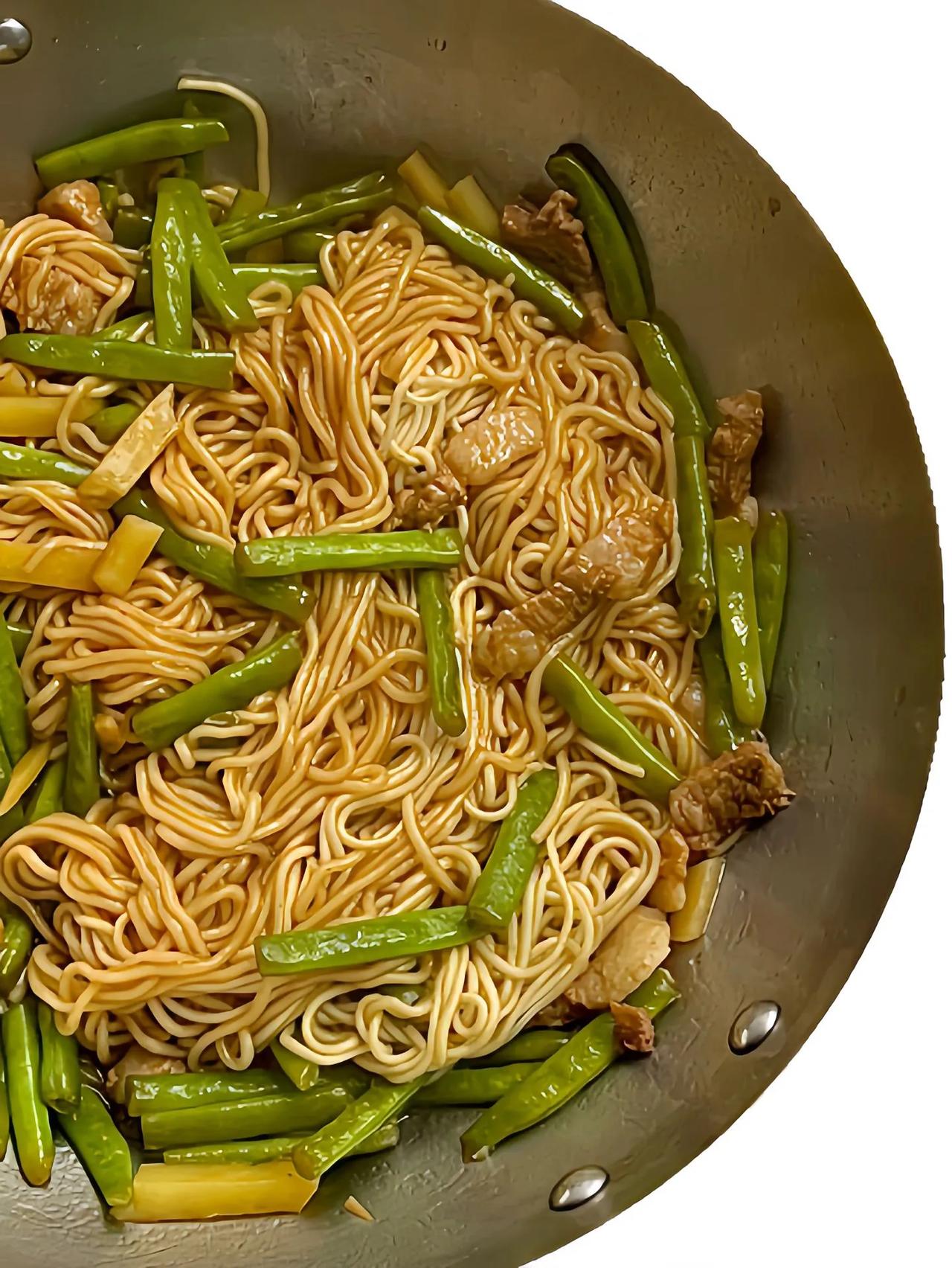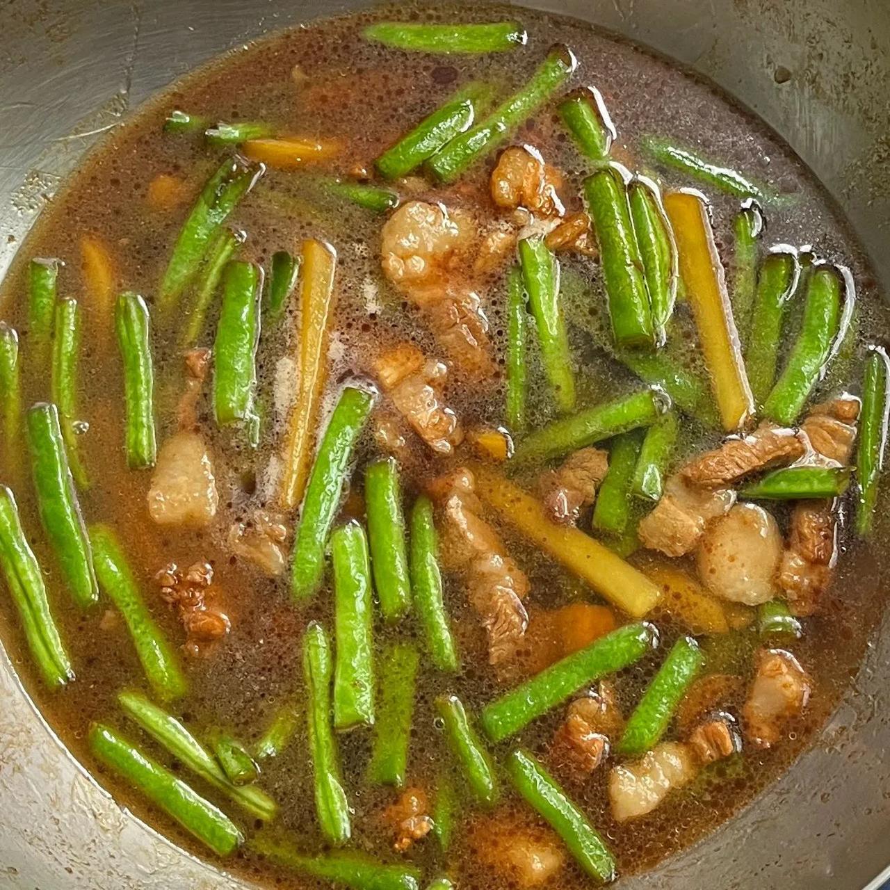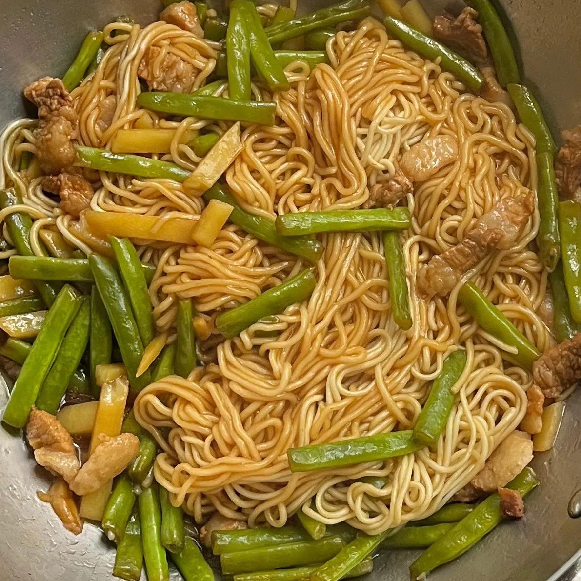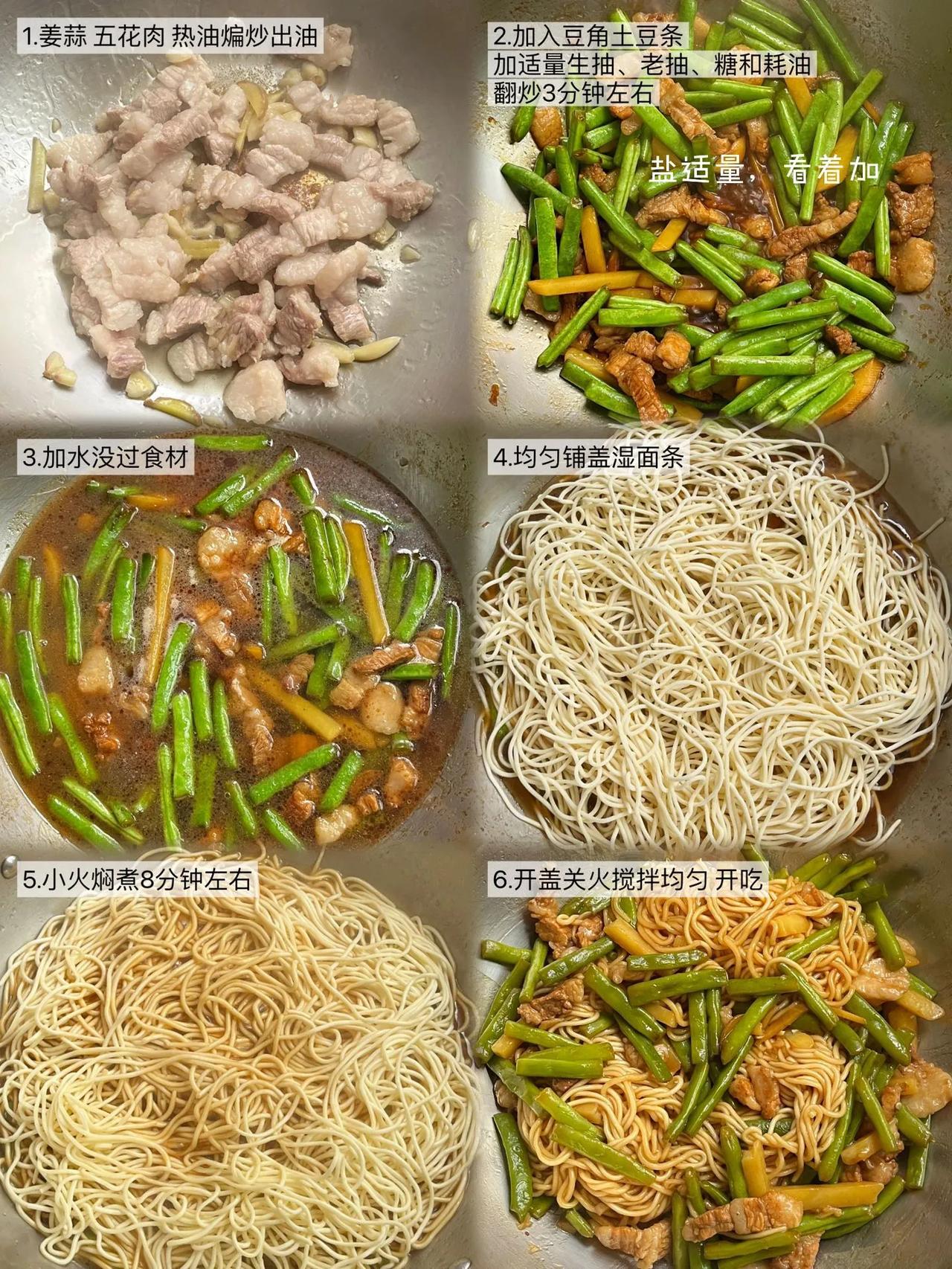 信我!!豆角焖面真的好吃哭! 豆角焖面在我心里的地位不可撼动是真的好吃!油脂香味包裹着每一根筋道的面条,混合着软烂的豆角!一筷子下去真的超级满足! 做法: 1、姜蒜、五花肉热油煸炒出油; 2、加入豆角、土豆条翻炒一下,加适量生抽、老抽、糖和蚝油翻炒3分钟左右; 3、加水没过食材,均匀铺盖湿面条; 4、小火焖煮8分钟左右,开盖关火搅拌均匀即可。