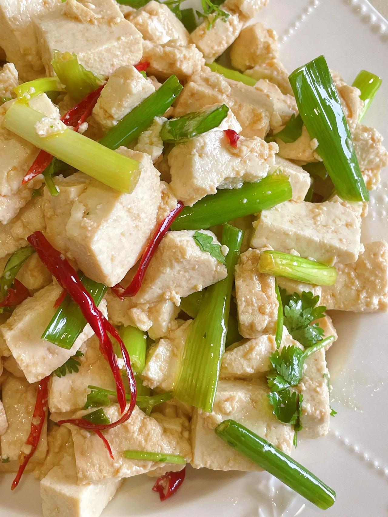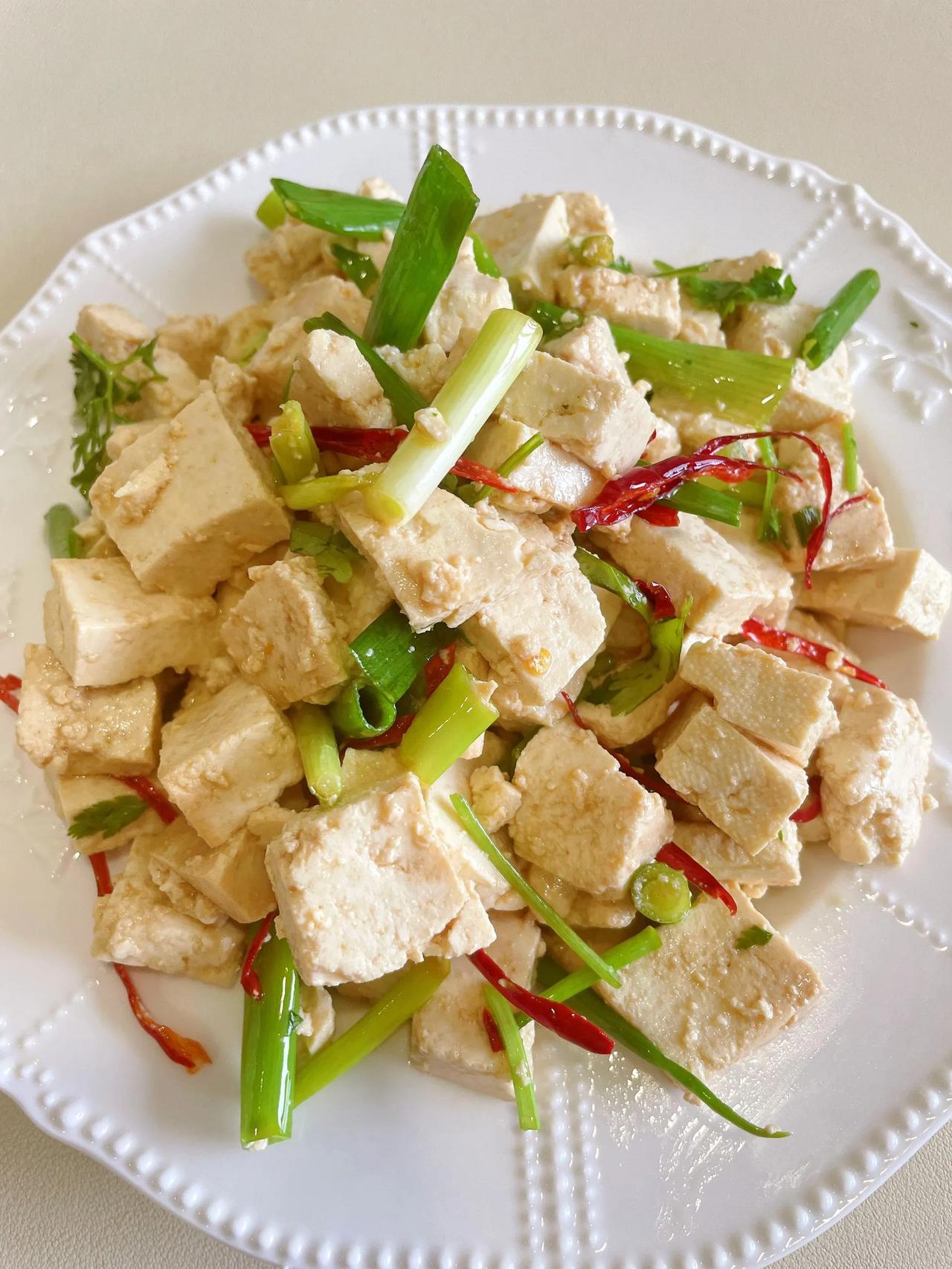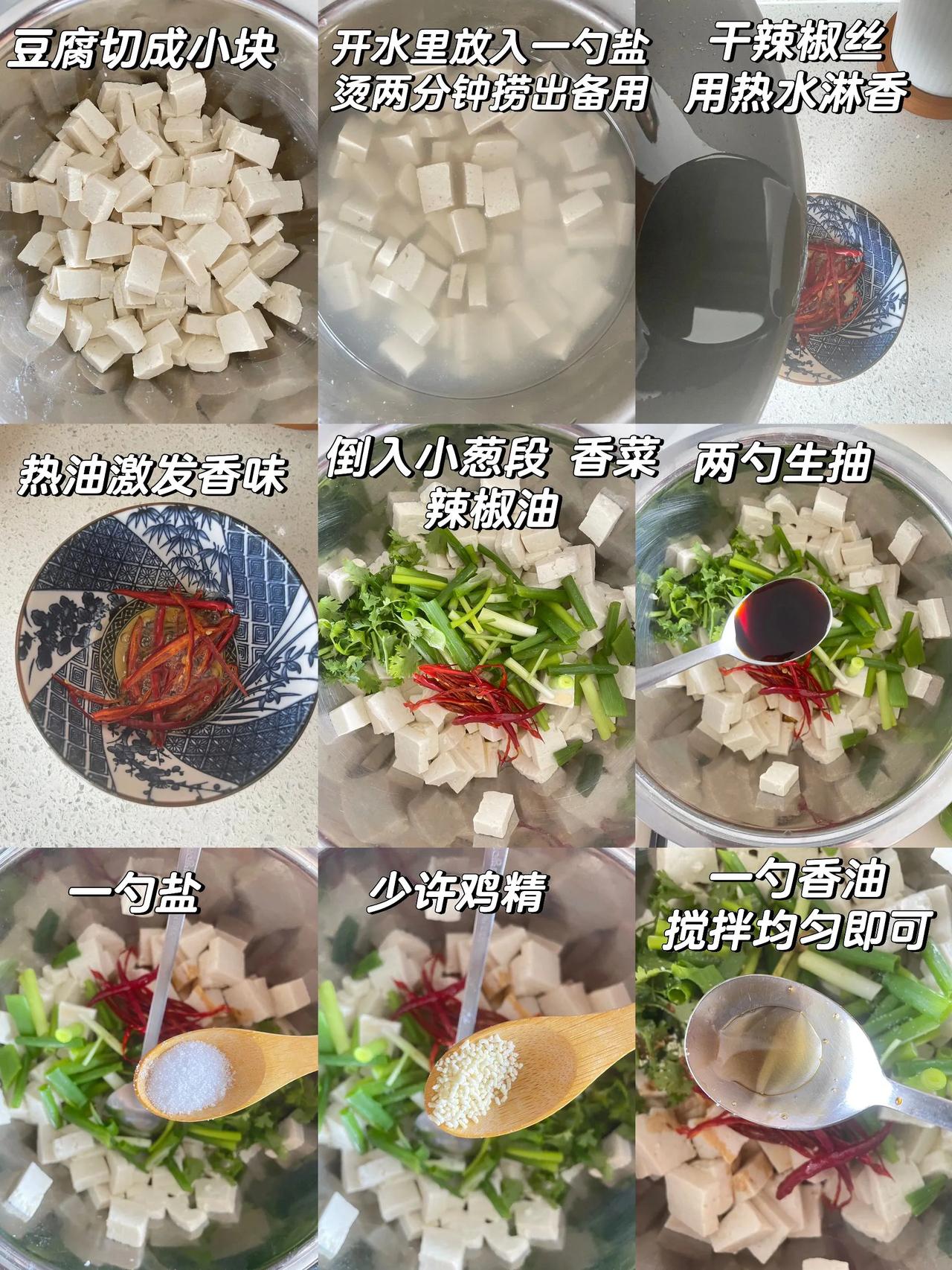 家里有豆腐的试试这个做法!好好吃的凉拌豆腐~ 做法简单,开胃低脂高蛋白,香辣过瘾还下饭,喜欢吃豆腐一定要试试这个! 做法: 1、豆腐切成小块 ,开水里放入一勺盐,烫两分钟捞出备用; 2、干辣椒丝用热油激发香味,碗中放入豆腐,加辣椒油、小葱段、香菜、两勺生抽、一勺盐、少许鸡精、一勺香油搅拌均匀即可。