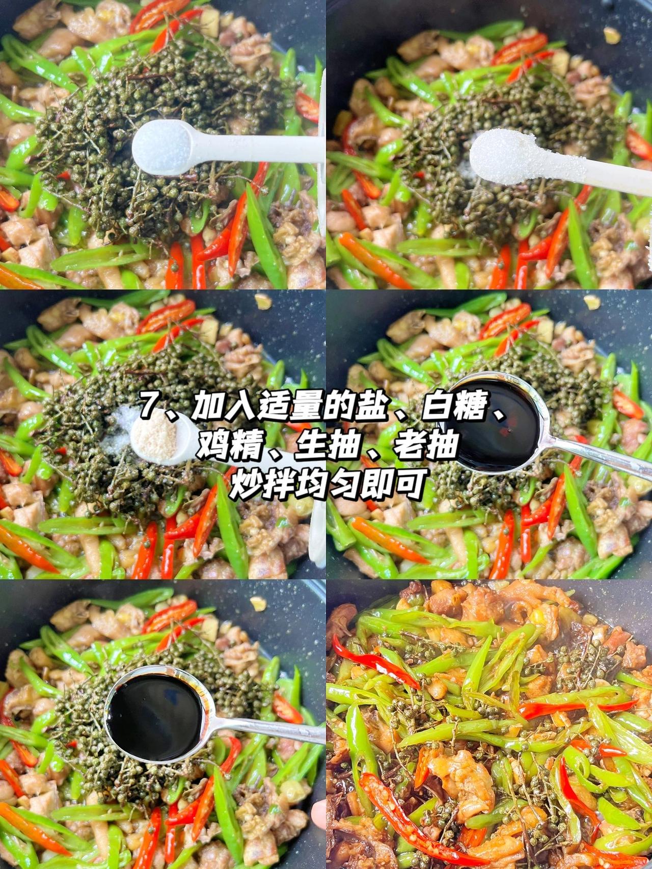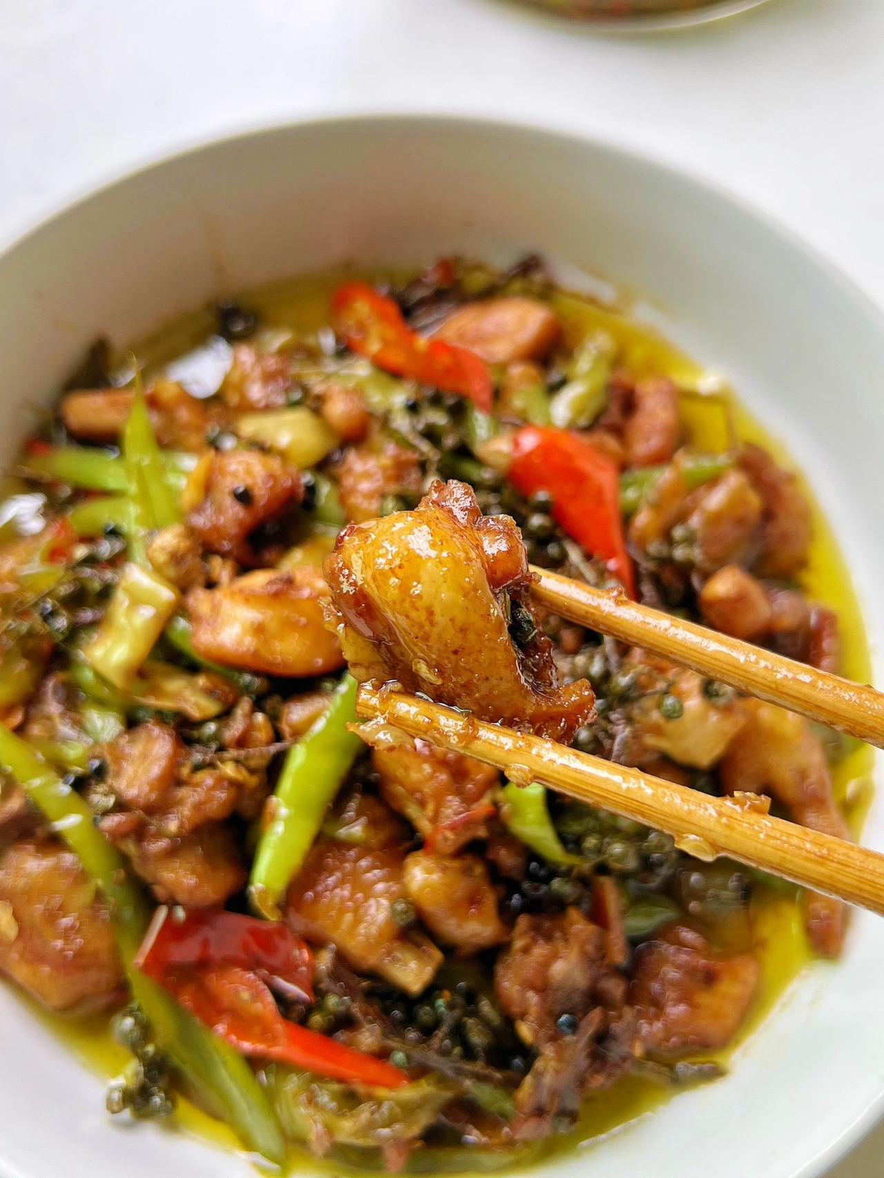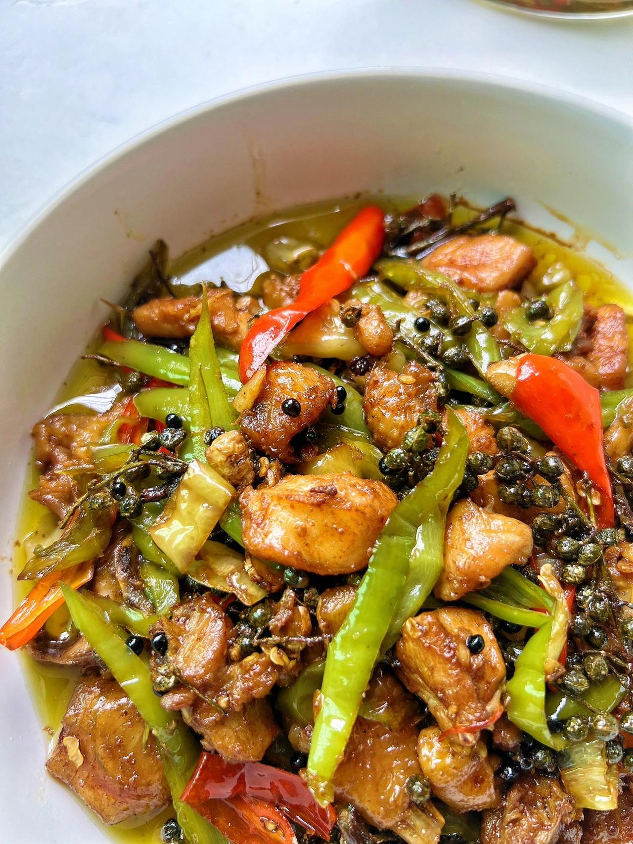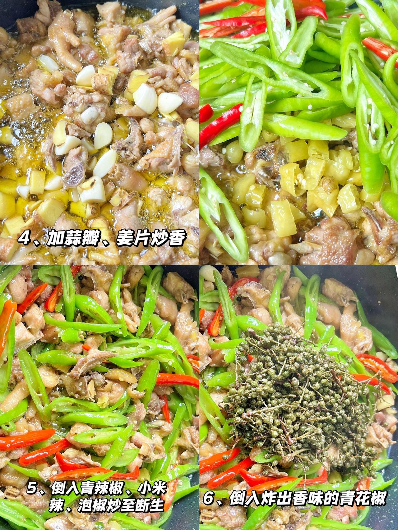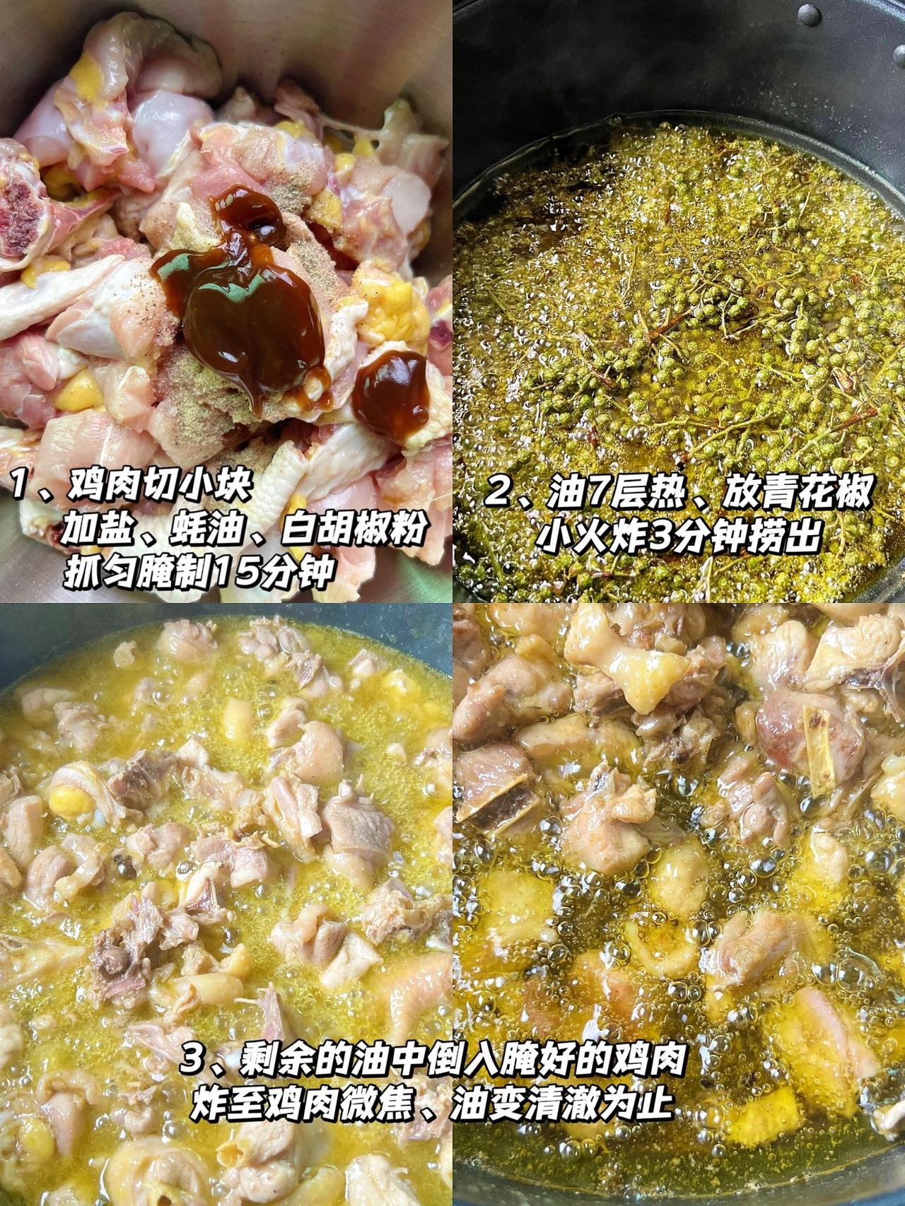 闻着都流口水的鸡肉做法,同事以为外面买的 这个青花椒还是去年处理好后冻冰箱的,解冻后还是鲜辣的青花椒味,这个菜同事都说这不就是外面买的吗 食材: 鸡肉切块、青椒切丝、小米辣切段、姜蒜切小瓣、泡椒、青花椒、生抽、老抽、盐、鸡精、蚝油、白糖、胡椒粉、菜籽油。 教程:1、鸡肉剁成小块,加蚝油、胡椒粉、盐腌制15分钟。 2、油7成热,先下青花椒炸香捞出(2-3分钟)。然后用这个油继续炸鸡肉,把鸡肉炸至脱水微焦,油变清澈为止(8-10分钟)。 3、下姜蒜炒香,然后放入所有辣椒炒至断生,倒入炸好的青花椒,加生抽、老抽、盐、鸡精、白糖调味即可。 炸鸡肉后,如果油多,可舀出一些做其他菜。 辣椒换成更辣的青小米辣,味道更足更安逸。