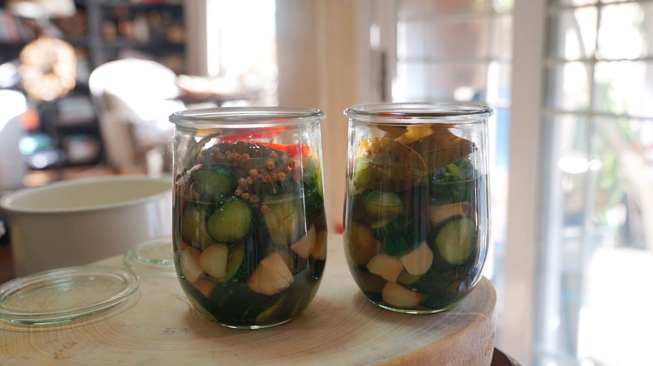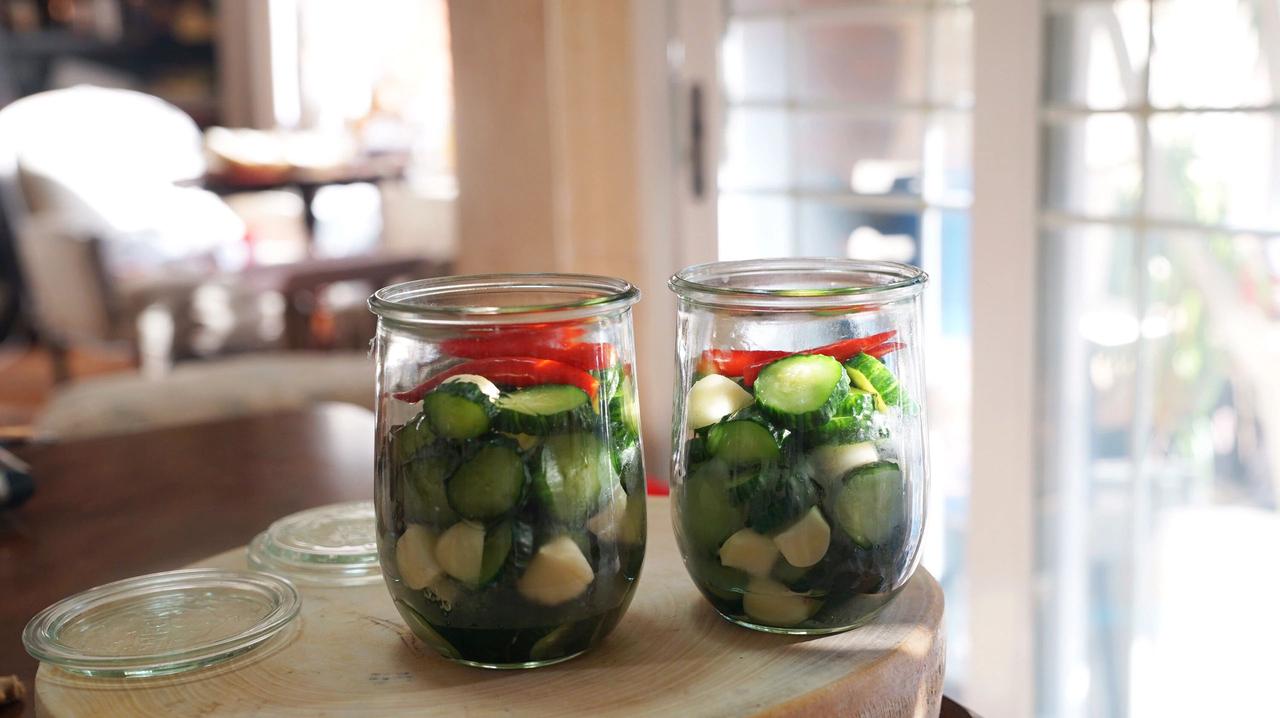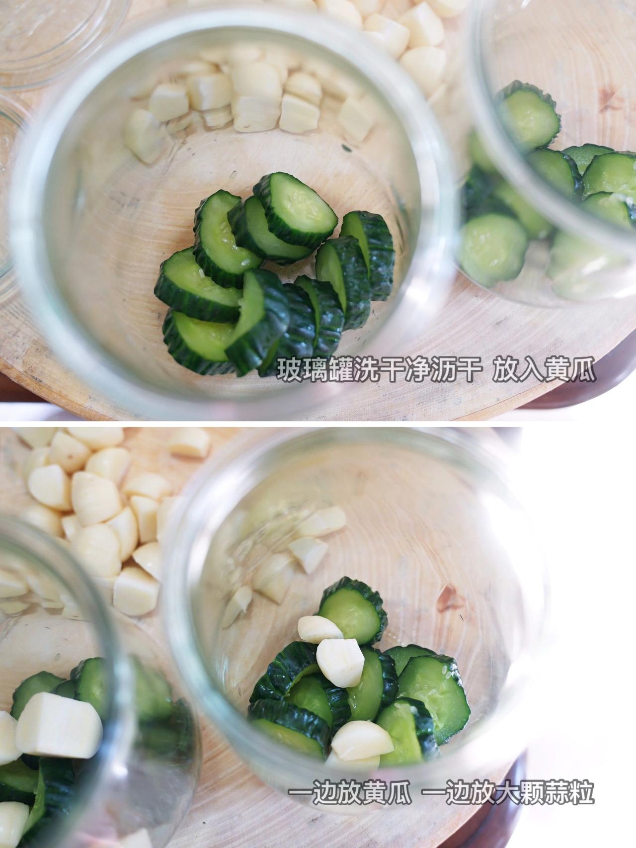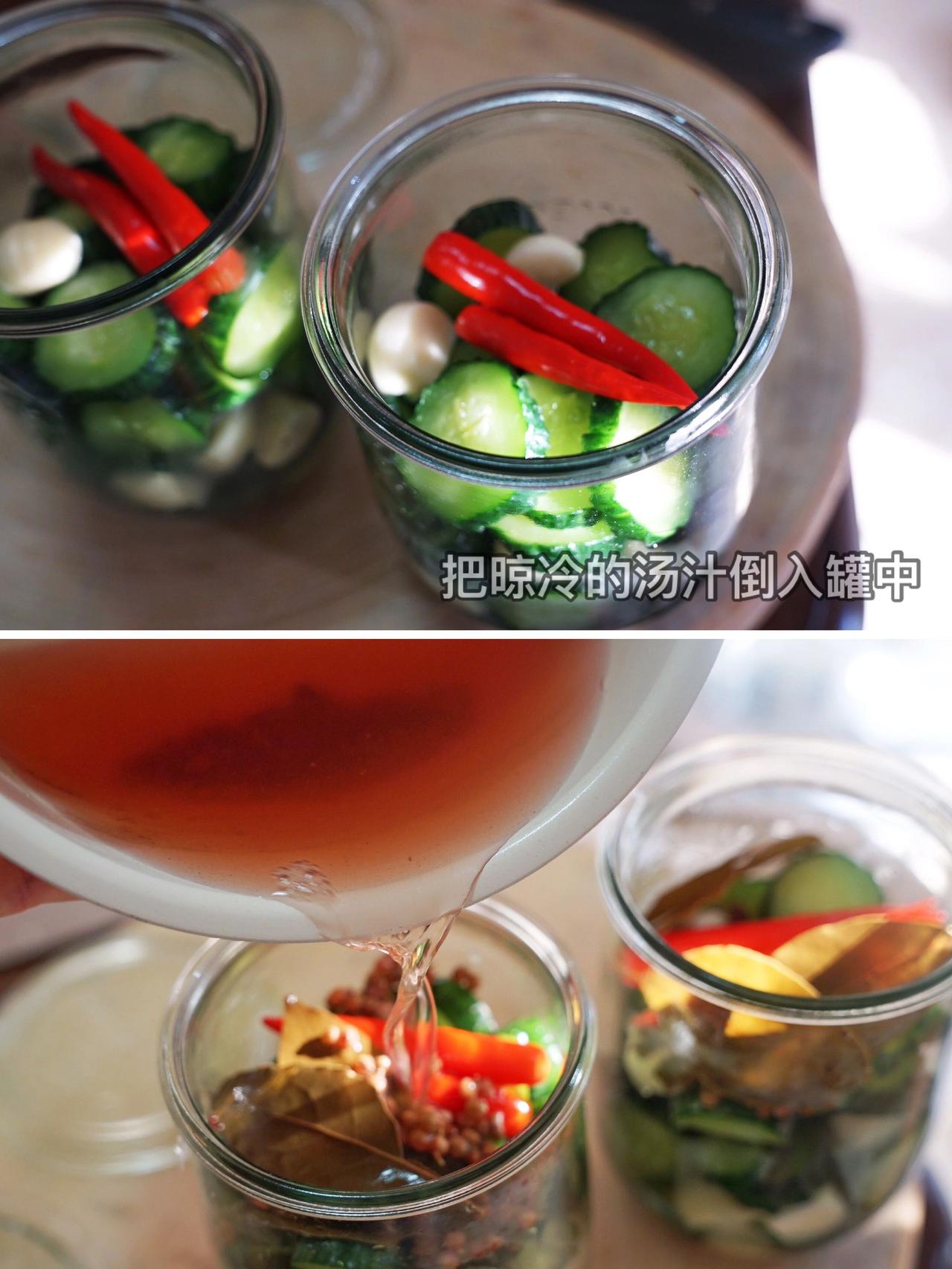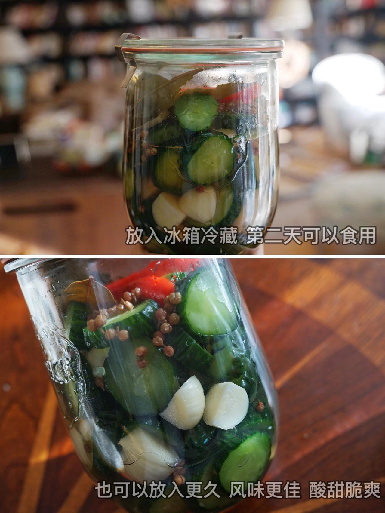夏日餐桌上的开胃小菜, 酸脆甜爽的酱黄瓜 在夏天,终究绕不过黄瓜,到了它得宠的季节。 酱、呛、拌,或变成丝混入其他食材,换得一份脆韧和清爽,佐稀饭或配茶,清口又开胃,盛夏画卷里熟悉的笔触,突然觉得画面里撑过来一叶小舟,穿行在盛开的莲花湖中,停舟到阴凉处,摘莲花和莲蓬,戴着荷叶做成的帽子,打开罐子,啊,酱黄瓜。 是撑船的人还是摘莲花的人打开的呢?船上没有冰箱,口感不会那么脆爽,怎么办?酱黄瓜的好吃,让摘莲花的和不摘莲花的人,心猿意马。别无他法,只有伸出手去抚摸它,眼神里就是欣喜的孩子气了。 我在说什么。 1:黄瓜洗净切厚片,用盐腌制一小时,再洗净挤干水份。 2:小锅里放入白醋、花椒粒、冰糖、蜂蜜、小米辣,喜欢味精也可以放入,再加水混合均匀。煮沸再转小火到冰糖融化,关火晾冷。 3:玻璃罐洗净擦干,放入挤干水份的黄瓜片,再加入大颗蒜粒,再把晾冷的汤汁和香料加入混合。 4:放入冰箱冷藏,第二天可以食用,可以放更久,风味更佳,酸脆脆,又甜丝丝。