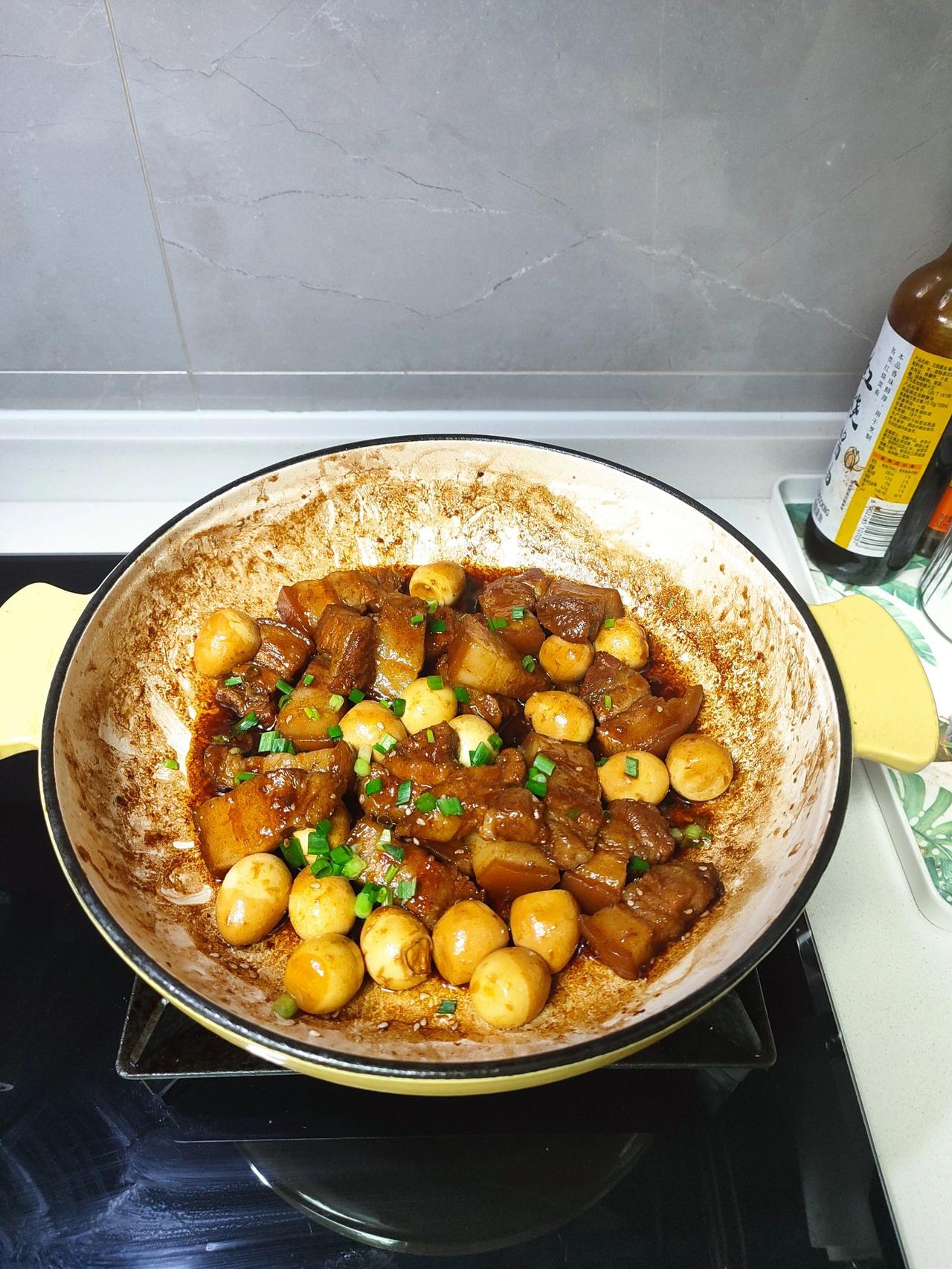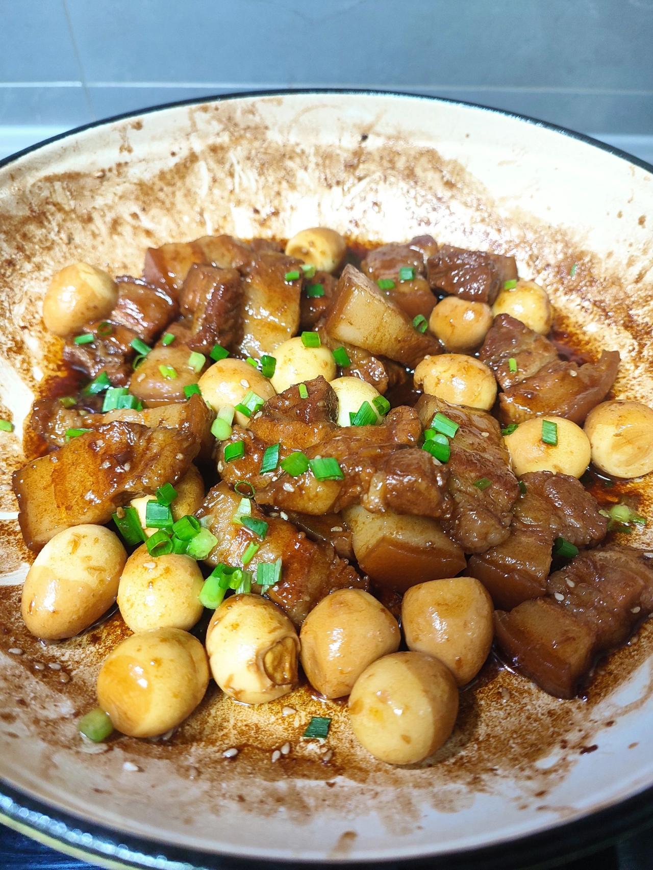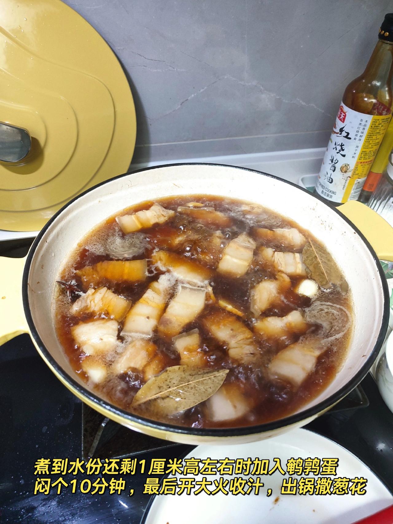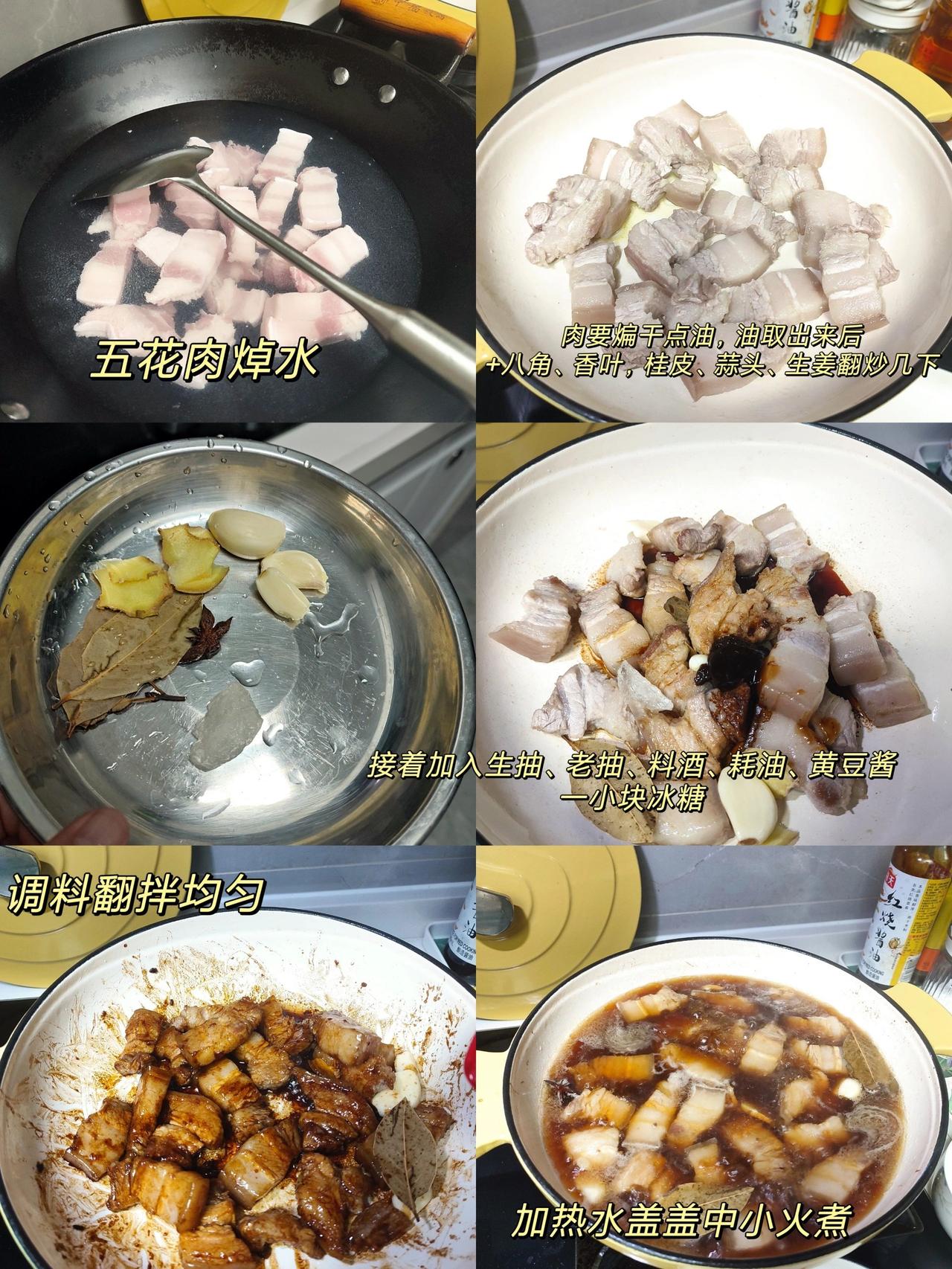 好吃不腻的红烧肉,家有小孩的可以试试! 我小孩是个爱吃肉还不长胖的孩子,特别爱吃红烧肉,真羡慕她!不过她吃红烧也是爱吃瘦点的,所以我会挑瘦点的五花肉买,五花肉焯水后煸一点油后,好吃不腻,香的很,特别下饭! 红烧肉调料:1、肉要焯水再煸炒点油出来 2、我的调料每次都是就是加入:蒜头、生姜、八角、桂皮、香叶、冰糖、生抽2勺、老抽1勺、料酒少量、耗油一勺、黄豆酱半勺(我用的不辣的)+热水去焖煮个30分钟~40分钟,看自己做的情况调整 3、中间剩1厘米高水时加入鹌鹑蛋一起焖 4、焖的肉软烂了放入少许白芝麻大火收汁,出锅撒葱花 PS:最后一张图片有做法