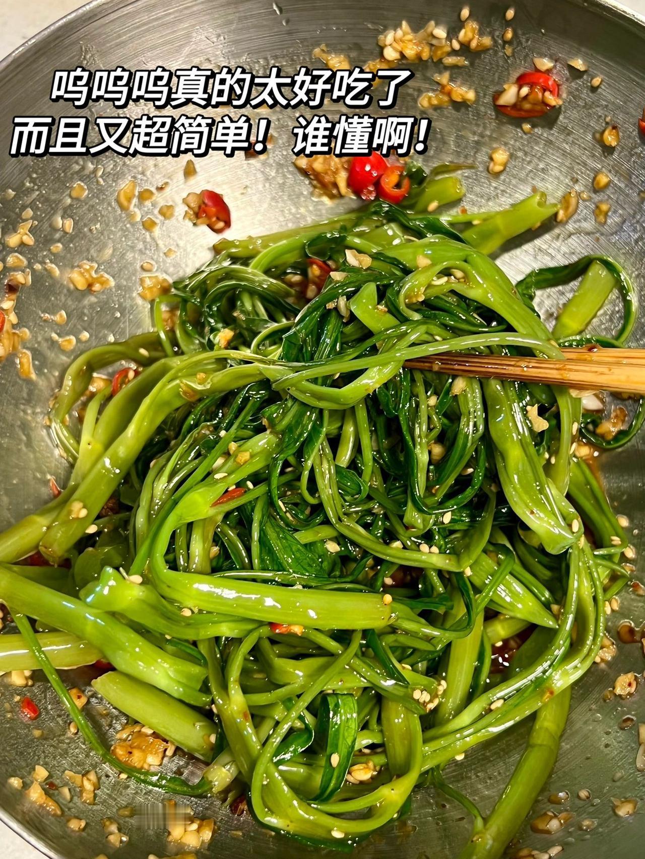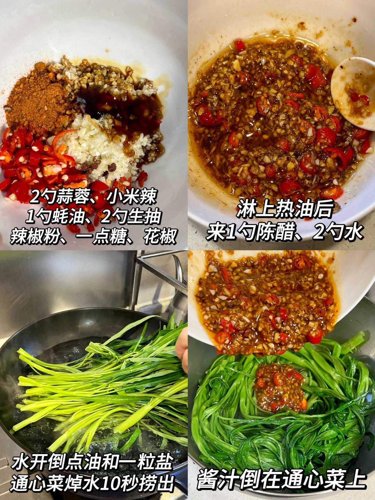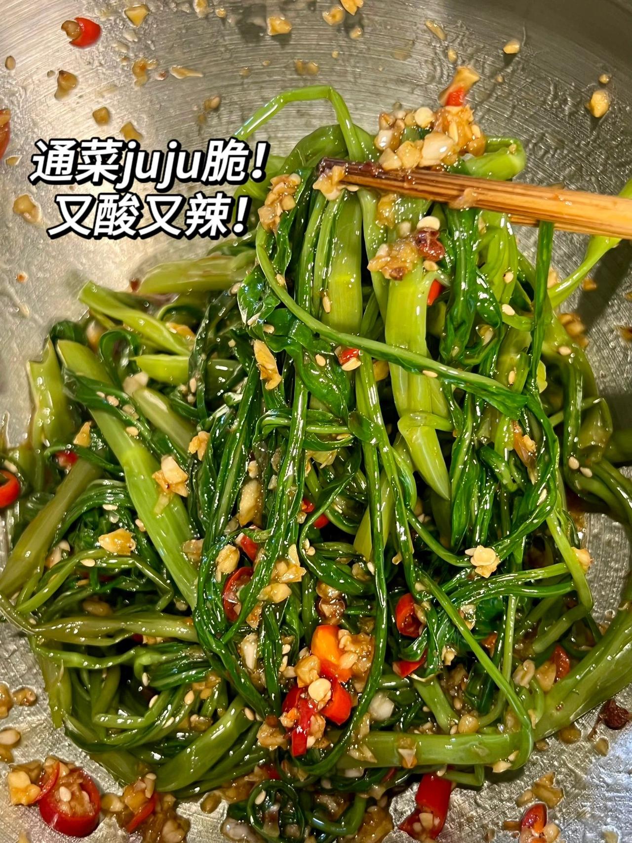 打开手机,就看到了好多令人惊愕的新闻。荧幕上如此阳光开朗的人,以这种方式谢幕。确实,会让人有所惋惜吧。看到很多朋友的评论,或许也有很多表面阳光开朗的人,内心生活中也是一地鸡毛吧。其实,我们大多数人真的是幸福的,为了一日三餐操劳,有点爱吃的,有爱的人,就够了。我的晚餐,真的没有什么特殊的食材,都是平时随处可见的食材,做法也特别简单 通菜这样做也太好吃了!不输蒜蓉炒的!又酸又辣!香得不行!!通菜梗卜卜脆,我真的太爱了!! 做法:1、2勺蒜茸、一勺小米辣、一勺辣椒粉、2勺生抽、1勺蚝油、一点点糖、几粒花椒,淋上热油,然后来一勺陈醋,2勺水(不想要酱汁的可以不加水) 2、水烧开后倒点油,加一点点点点盐,口味不重的可以不加盐,然后下通菜焯水十秒后捞出 3、再把酱汁倒在通菜上拌匀,再来点芝麻就行了! 真的巨巨巨巨好吃!而且真的也太简单了!谁吃谁get到我!!我用这个下了一碗米饭!明天还想吃后天还想吃!!!
