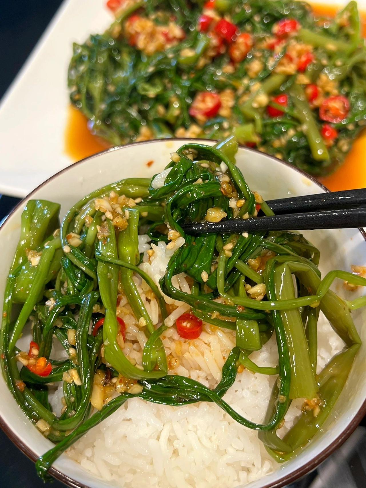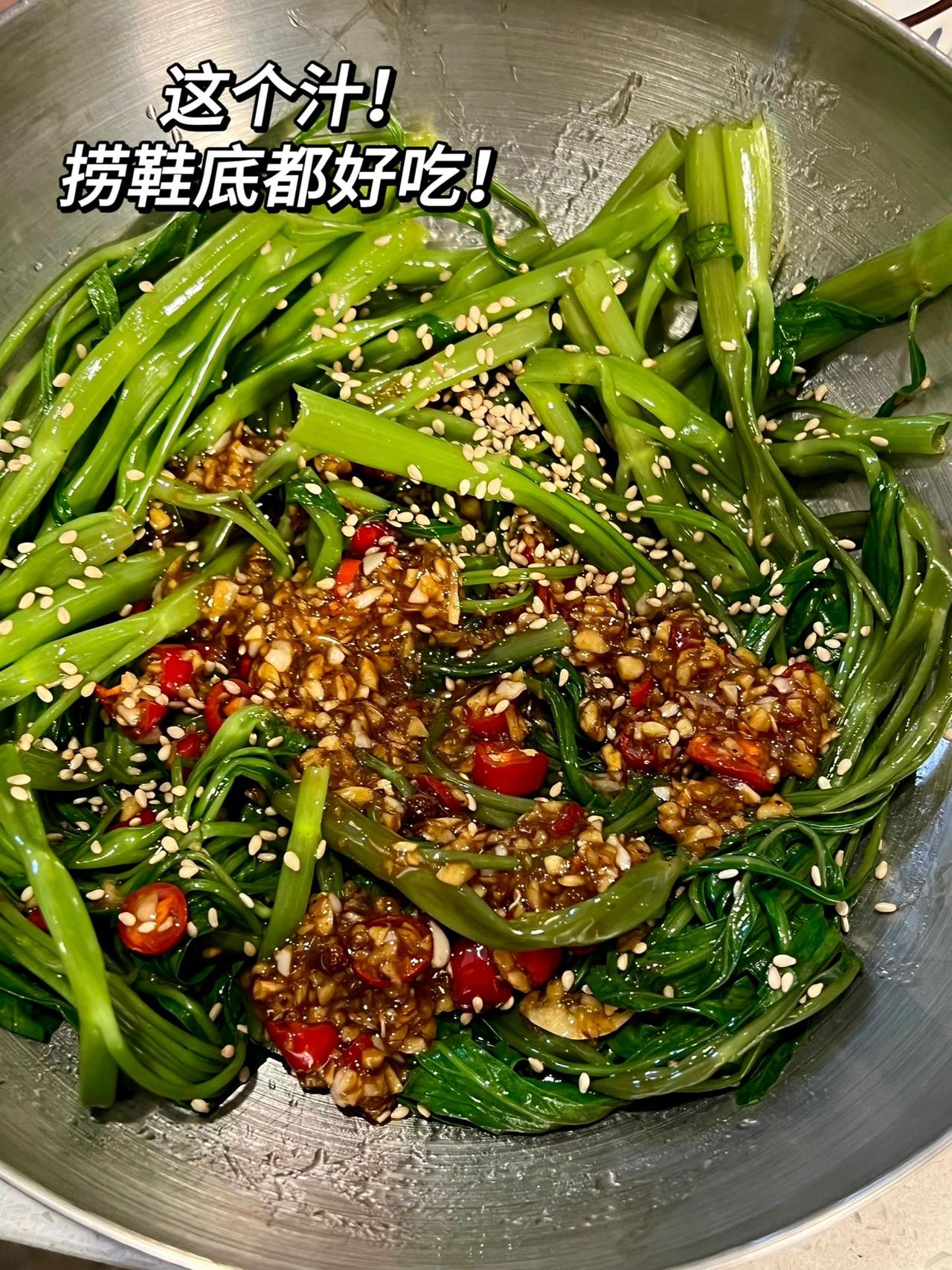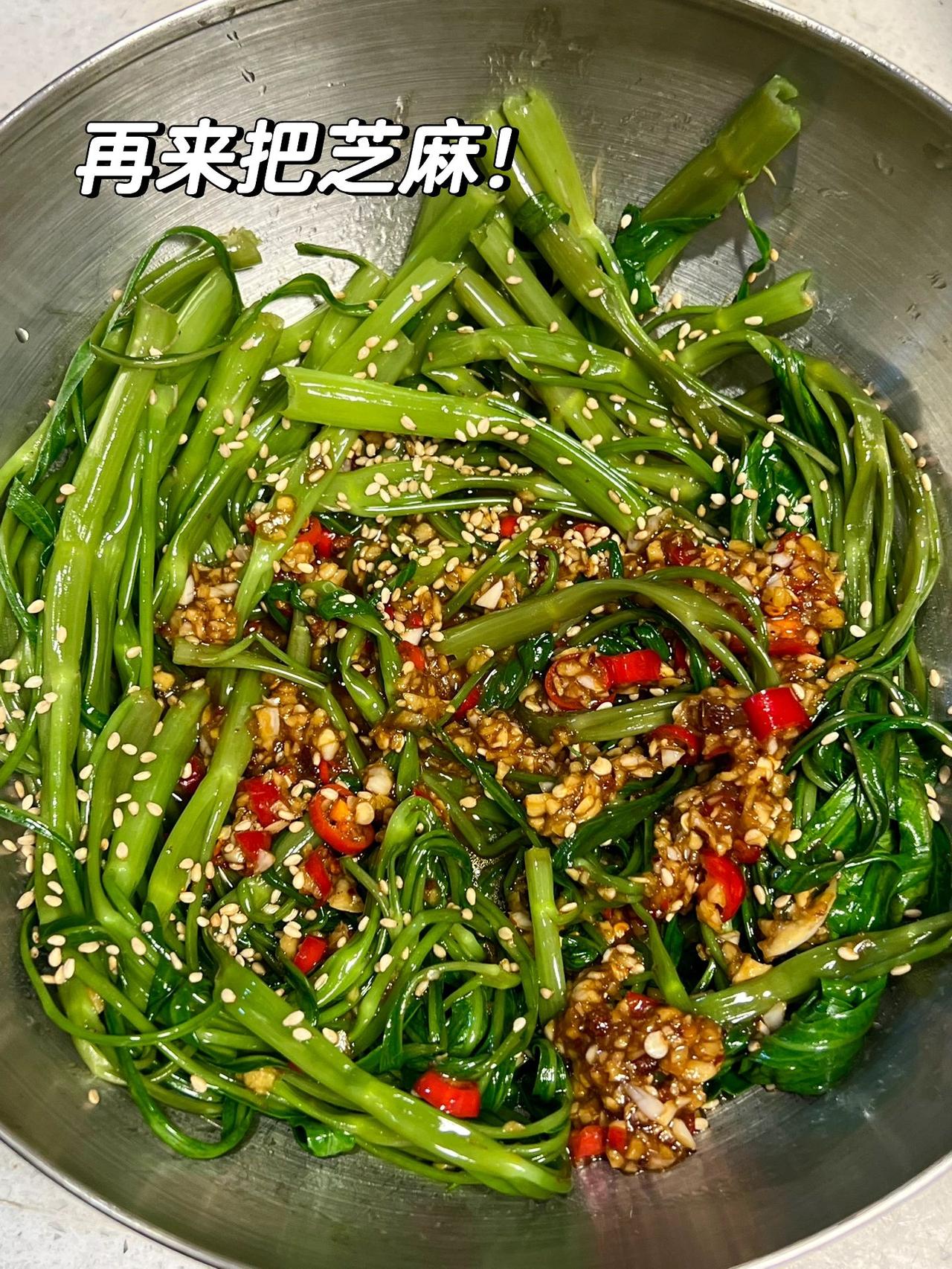 打开手机,就看到了好多令人惊愕的新闻。荧幕上如此阳光开朗的人,以这种方式谢幕。确实,会让人有所惋惜吧。看到很多朋友的评论,或许也有很多表面阳光开朗的人,内心生活中也是一地鸡毛吧。其实,我们大多数人真的是幸福的,为了一日三餐操劳,有点爱吃的,有爱的人,就够了。我的晚餐,真的没有什么特殊的食材,都是平时随处可见的食材,做法也特别简单 通菜这样做也太好吃了!不输蒜蓉炒的!又酸又辣!香得不行!!通菜梗卜卜脆,我真的太爱了!! 做法:1、2勺蒜茸、一勺小米辣、一勺辣椒粉、2勺生抽、1勺蚝油、一点点糖、几粒花椒,淋上热油,然后来一勺陈醋,2勺水(不想要酱汁的可以不加水) 2、水烧开后倒点油,加一点点点点盐,口味不重的可以不加盐,然后下通菜焯水十秒后捞出 3、再把酱汁倒在通菜上拌匀,再来点芝麻就行了! 真的巨巨巨巨好吃!而且真的也太简单了!谁吃谁get到我!!我用这个下了一碗米饭!明天还想吃后天还想吃!!!