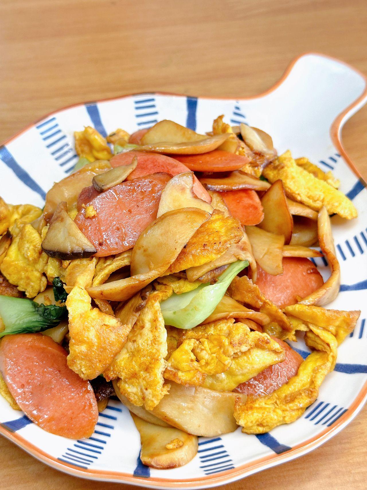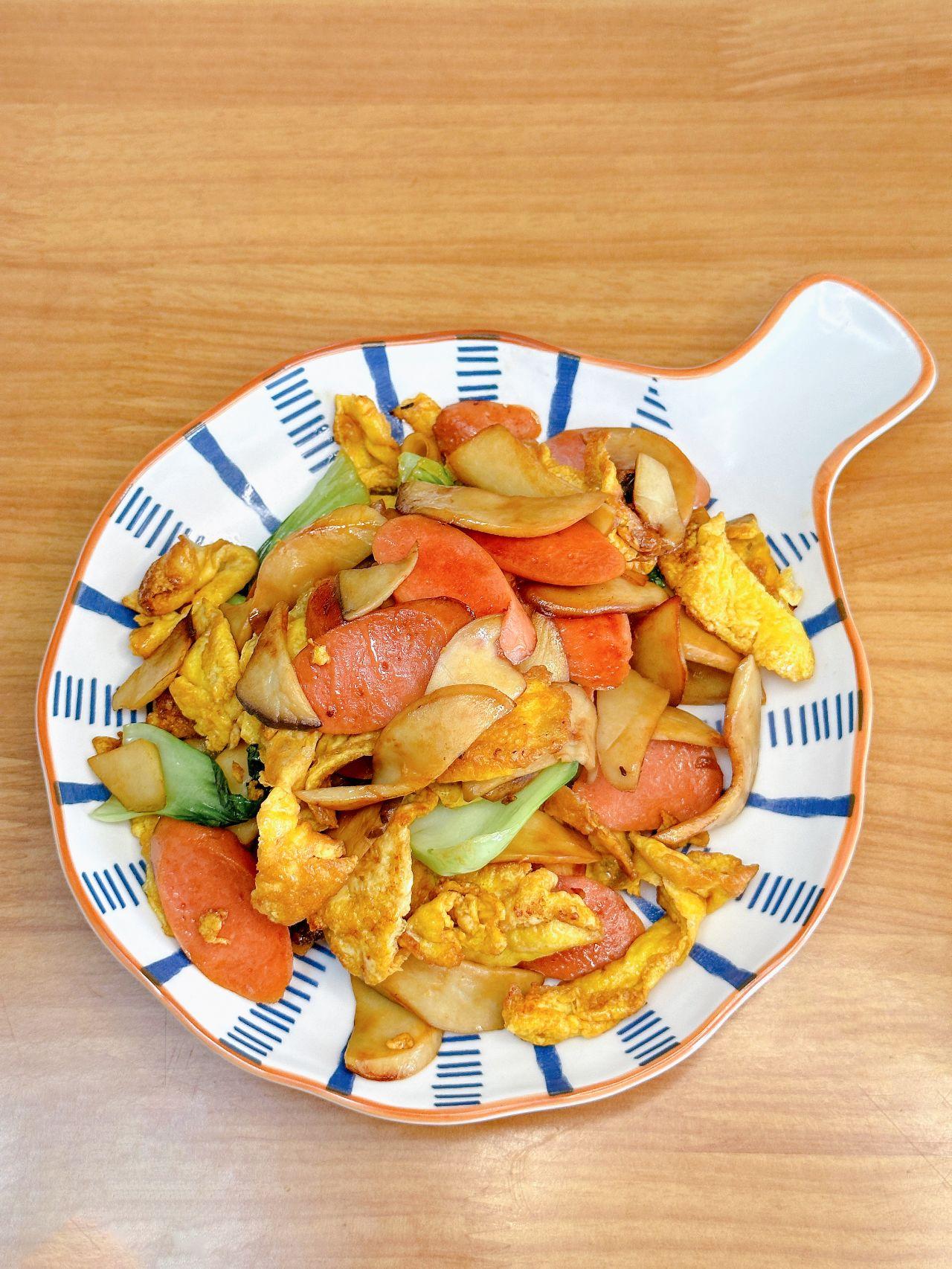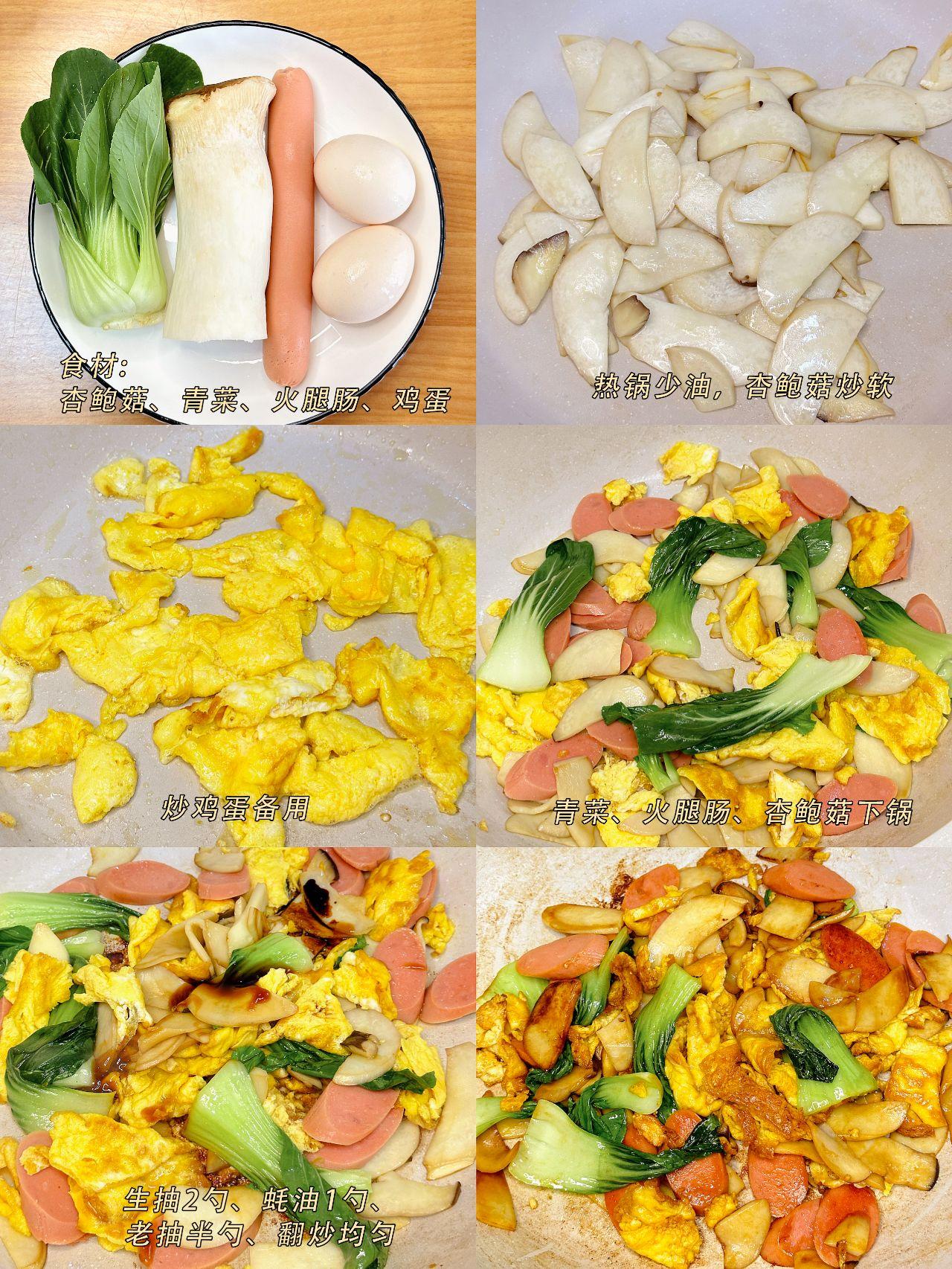 偷偷告诉你,这道菜美味又瘦身 今天同事给我分享了她平时晚餐经常吃的一道菜,据说是她的美食瘦身秘籍——杏鲍菇火腿肠青菜炒鸡蛋;如果你正在追求减脂瘦身的目标,同时对美味的炒菜无法抗拒,那么这道菜绝对是你的完美选择。 【食材】杏鲍菇、火腿肠、青菜、鸡蛋 【酱汁】生抽2勺、蚝油1勺、老抽半勺 【做法】1、杏鲍菇切片,慢火炒干水分盛出备用 2、油锅热后倒入鸡蛋液炒熟成蛋饼,盛出备用 3、再次加油烧热,放入杏鲍菇和火腿肠翻炒至出香味; 4、加入青菜翻炒均匀,待青油菜变软后放入蛋饼炒匀,并放入酱汁炒匀即可; 这道菜做法简单快捷,富含丰富的蛋白质和纤维。记住,减脂并不意味着束缚享受美食的权利,只需要选择适合的食材和科学健康的烹调方法,你就能同时实现健康和快乐。