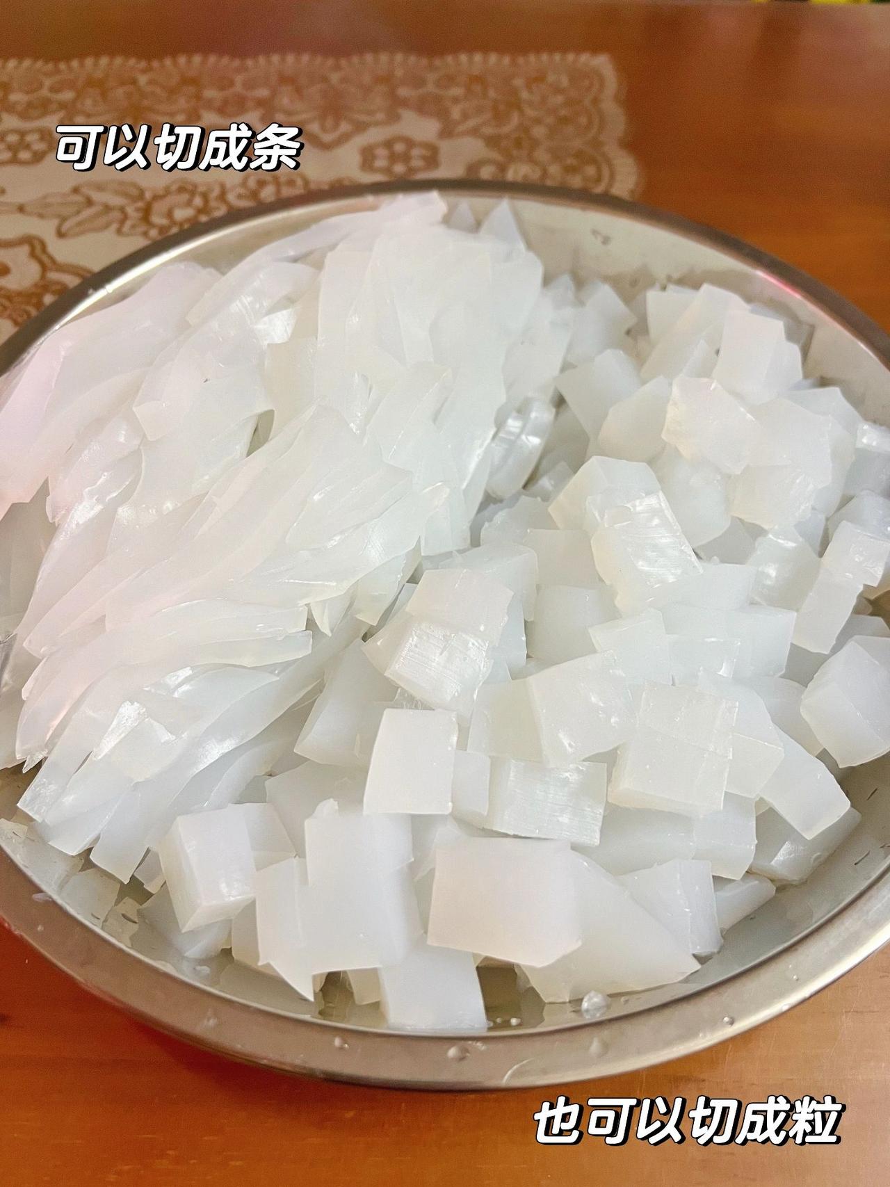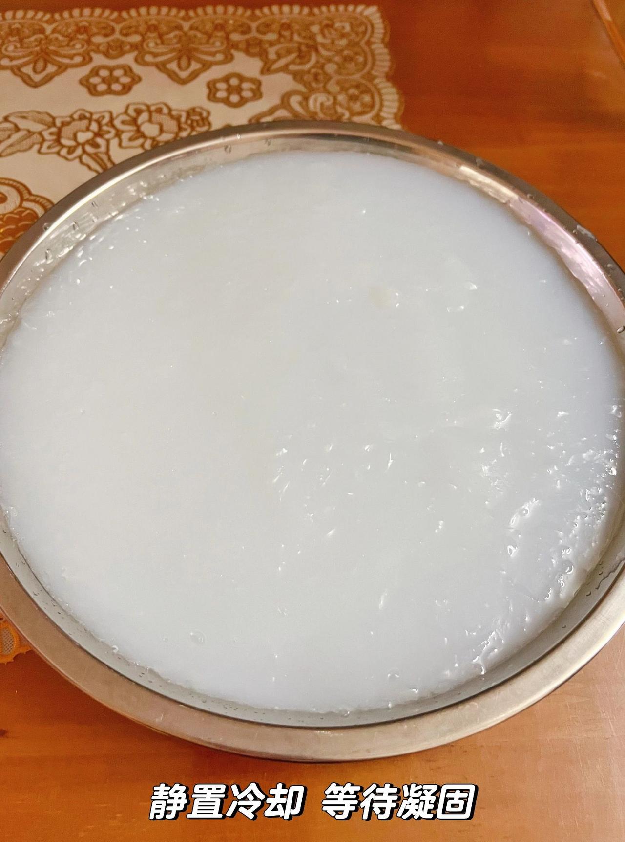 自制凉粉好好吃!夏天就想吃冰冰凉凉的呀 昨晚看美食节目看到了凉粉!今天就搞起来 准备:一包豌豆淀粉,水、一个小碗(用来弄豌豆淀粉和水的比例)、一个更大一点的碗(装淀粉和水混合的粉浆)、一个平一点大一点的碟子 调料(盐,糖,辣椒油,醋,黄豆酱/豆瓣酱,酱油,麻油) 自己喜欢的配菜(如:黄瓜丝,木耳,甜豆,香菇,花生,炸黄豆,面筋等) 制作步骤:1、用准备好的那个小碗,装5碗水,倒进锅里,中大火煮至沸腾冒泡 2、继续用那个小碗,装1碗豌豆淀粉,倒到更大的碗中。同样的小碗,装1碗水,和刚才的1碗豌豆淀粉一起搅拌均匀。 总体比例→豌豆淀粉:水=1:6 (1碗水拿来和豌豆淀粉搅拌)(5碗水在锅中煮沸) 3、锅的火候从中大火转中小火,将搅拌均匀的粉浆水,缓缓倒入煮着沸水的锅里,边倒边用筷子搅拌。搅拌的速度需要快一点,否则容易结块 4、一直快速顺时针搅拌,很快就会发现粉浆水变成了较为透明的粘稠状。 5、转中火,煮至冒大泡2-3分钟左右。 6、趁热倒在准备好的大碟子中,用手震一震盘子,弄平,静置3小时左右直到它完全冷却凝固。 7、脱模到砧板上,用刀切成块或者条。 抹一点水到凉粉表面容易脱模一些,也可以先切开一半,用手取出。 切块的口感比较q弹,切条的口感比较滑溜。有工具的,也可以弄成刮刮粉。 最后加入搅拌好的调料和准备好的配菜搅拌,就可以开吃啦! 冰冰凉凉,酸酸辣辣,巴适!
