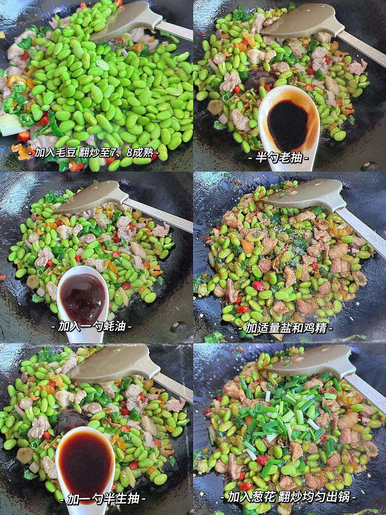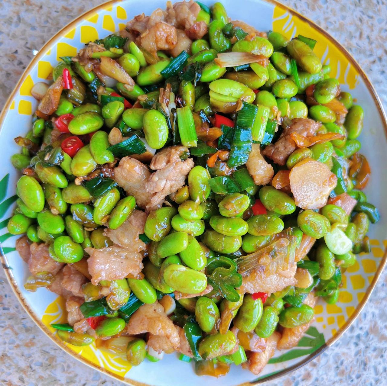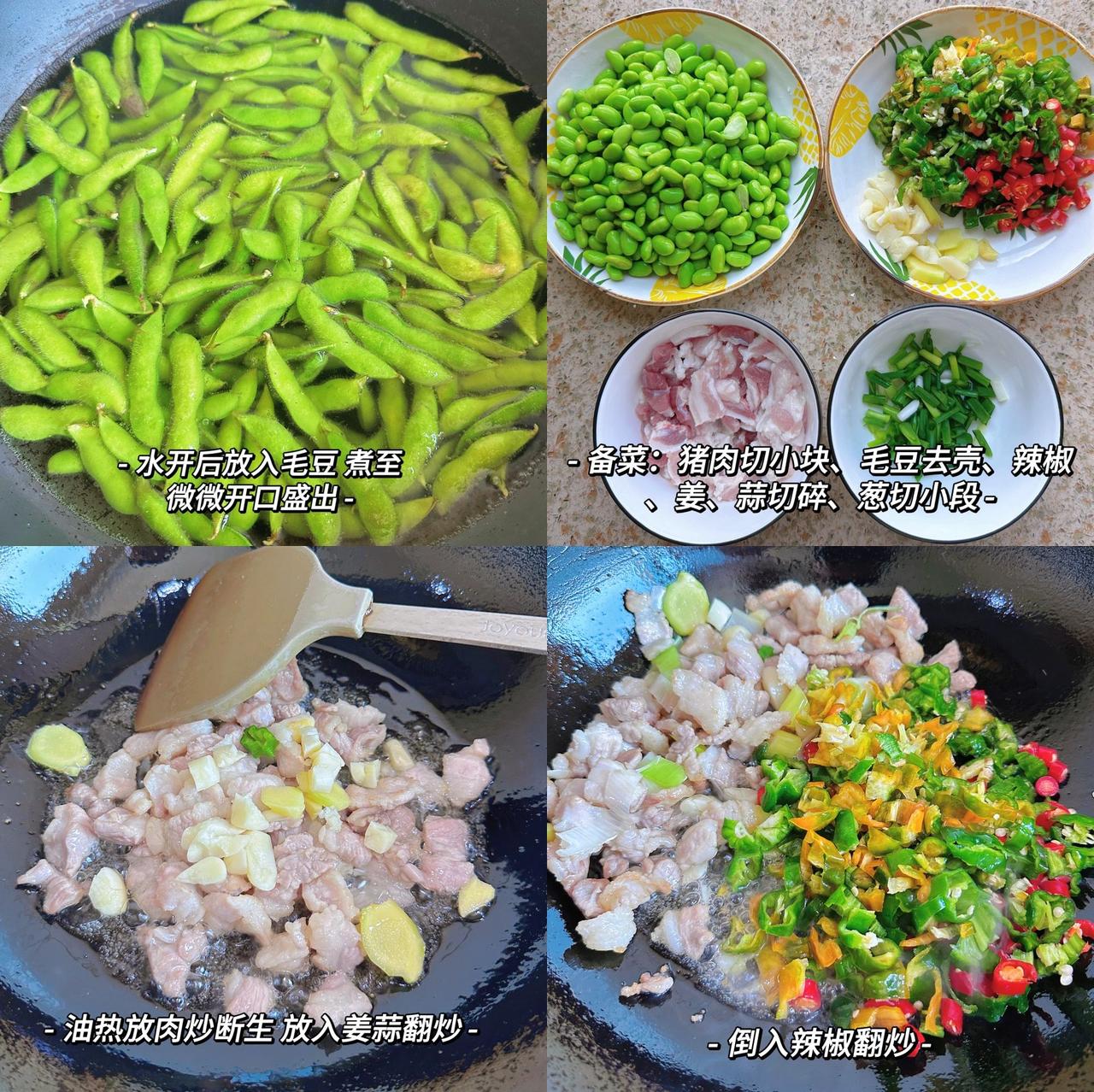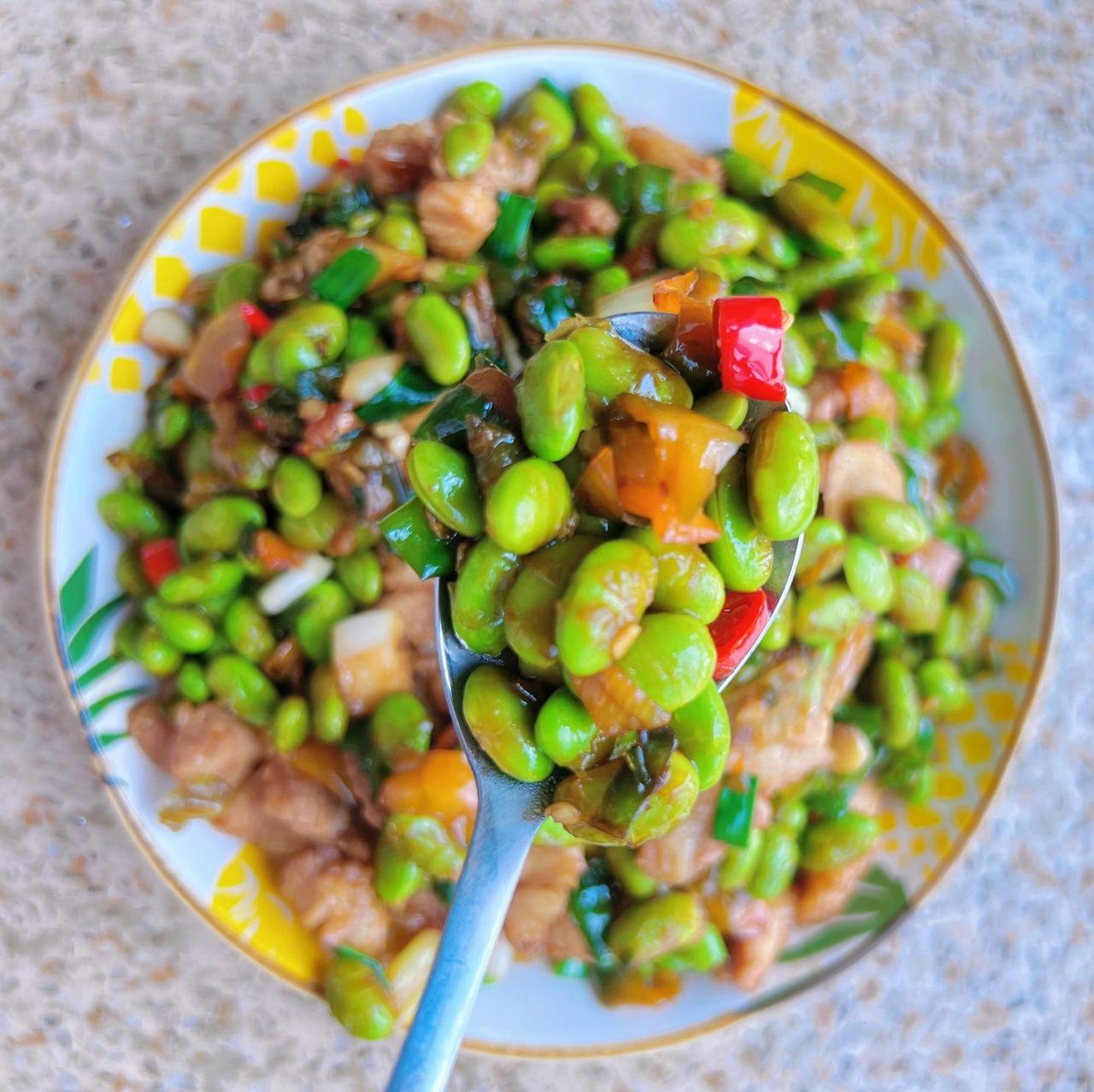 解锁毛豆新吃法,这不比凉拌毛豆还香啊!美味香辣,一勺毛豆一勺饭拌在一起吃,不要太好吃 食材:猪肉、毛豆、辣椒、蒜头、姜、小米椒(根据个人口味) 做法:1、水沸下毛豆煮至毛豆微微张开盛出,这样毛豆既好剥后期容易熟(独家小妙招); 2、肉切小片,辣椒、蒜切碎,姜切片,毛豆去壳; 3、油热下肉炒断生加入姜蒜炒香,加入辣椒翻炒一下,加入毛豆翻炒至7、8成熟,加入一勺蚝油、一勺半生抽、半勺老抽翻炒均匀,最后加入适量鸡精、盐和小葱翻炒一下盛出;
