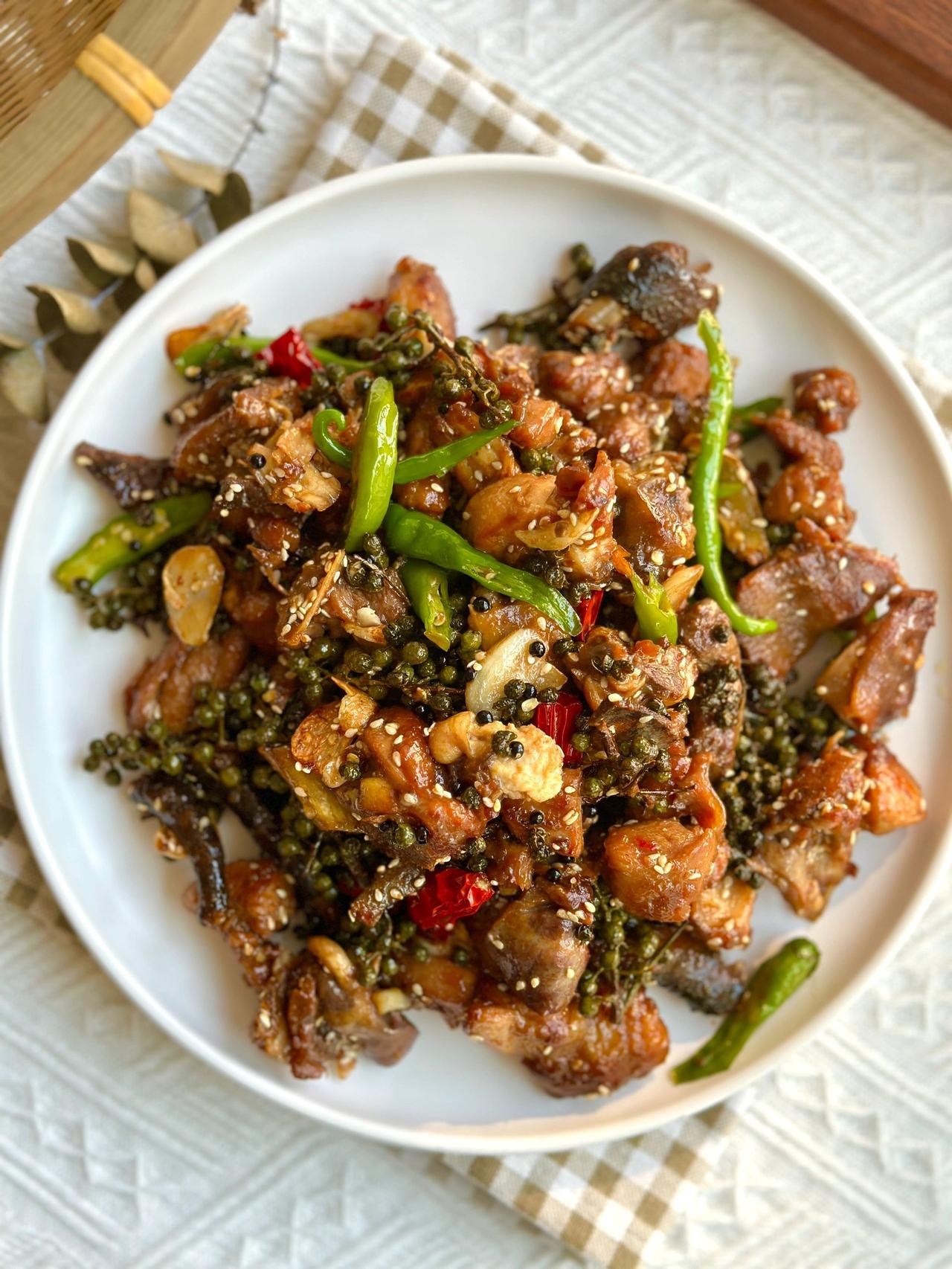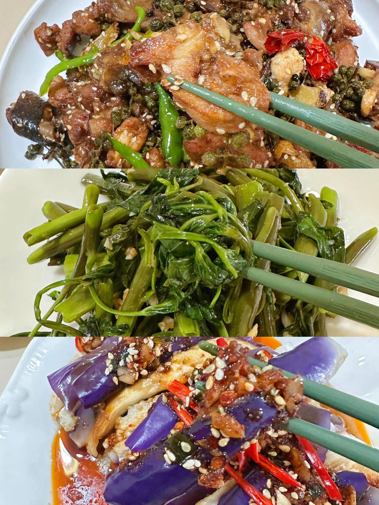 家常菜,花椒鸡,炝炒空心菜,凉拌茄子 今日菜单:附教程(在图中) 花椒鸡:突然好想吃花椒鸡,那种舌头在跳舞的感觉,绝绝子,巨好吃。 炝炒空心菜:空心菜炝炒真的很好吃,不知道有没有跟我一样不喜欢吃水渣渣的炒空心菜的姐妹[偷笑R] 凉拌茄子:夏天每顿都想吃一道凉拌菜是什么病[笑哭R],茄子凉拌真的很好吃。 以下依旧是小tips: 1、尽量去市场买新鲜青花椒,做起来清香味十足,其次是网上购买真空新鲜青花椒。 2、空心菜如果不想炒出来水很多,一定要控干水,有蔬菜甩干器就用,没有有一个小方法:锅内不放油,先放蔬菜炒死盛出,把水倒出,重新倒油快炒,也可以做到没有水。 3、茄子要想蒸出来还是紫的,要点在图10。 4、教程中的凉拌汁拌所有凉菜都好吃。 5、图片里面都有要点,仔细看图。