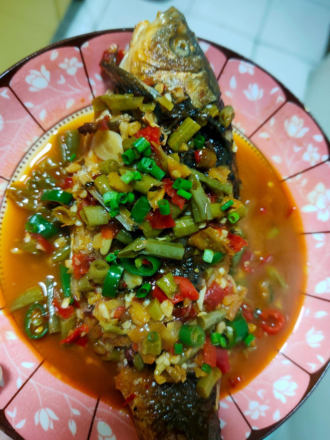 今天又吃藿香鲫鱼啦 我太喜欢熟的藿香的味道了,有点丁香+薄荷的味道,甜甜的香香的,熟的比生的味道好很多 给自己留个菜谱 1.鲫鱼洗干净放姜片料酒一点点盐腌制一会儿 2.生姜大蒜,泡椒泡姜泡豇豆切碎备用 3.油热下锅煎鱼,定型变黄捞起来 4. 锅里放油,加入豆瓣酱火锅底料泡椒末炒香,加能没过鱼的水,然后加料酒,一点点老抽,生抽,蚝油,加入鱼小火慢慢煮,煮几分钟翻个面 5.加入盐糖鸡精之类的调味,汤汁快收干的时候把鱼捞起来,放盘子里 6.把切好的藿香放汤汁里,放一点水淀粉勾个薄芡,最后加一点点花椒油 7.把汤汁淋在鱼上撒一点葱花就好了,还可以撒一点切细的藿香 (我下午去买的菜,太阳太大了藿香都晒干了,我回来泡了会儿它又支楞起来了,就是被搓出一些伤痕了。前天去买菜的时候看一个老婆婆卖的藿香叶子特别新鲜,但是已经买了其他菜了就没买,今天去没看到那个婆婆,在一个卖鱼的老板那里买的,他还送了我好多,可惜吃不了多少)