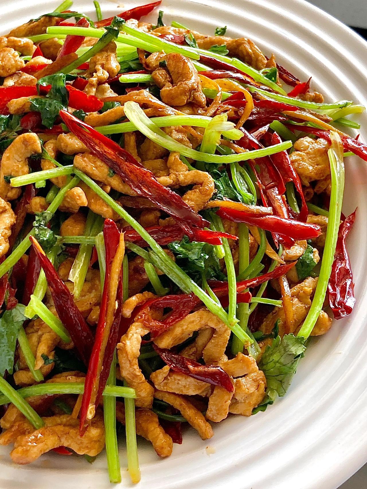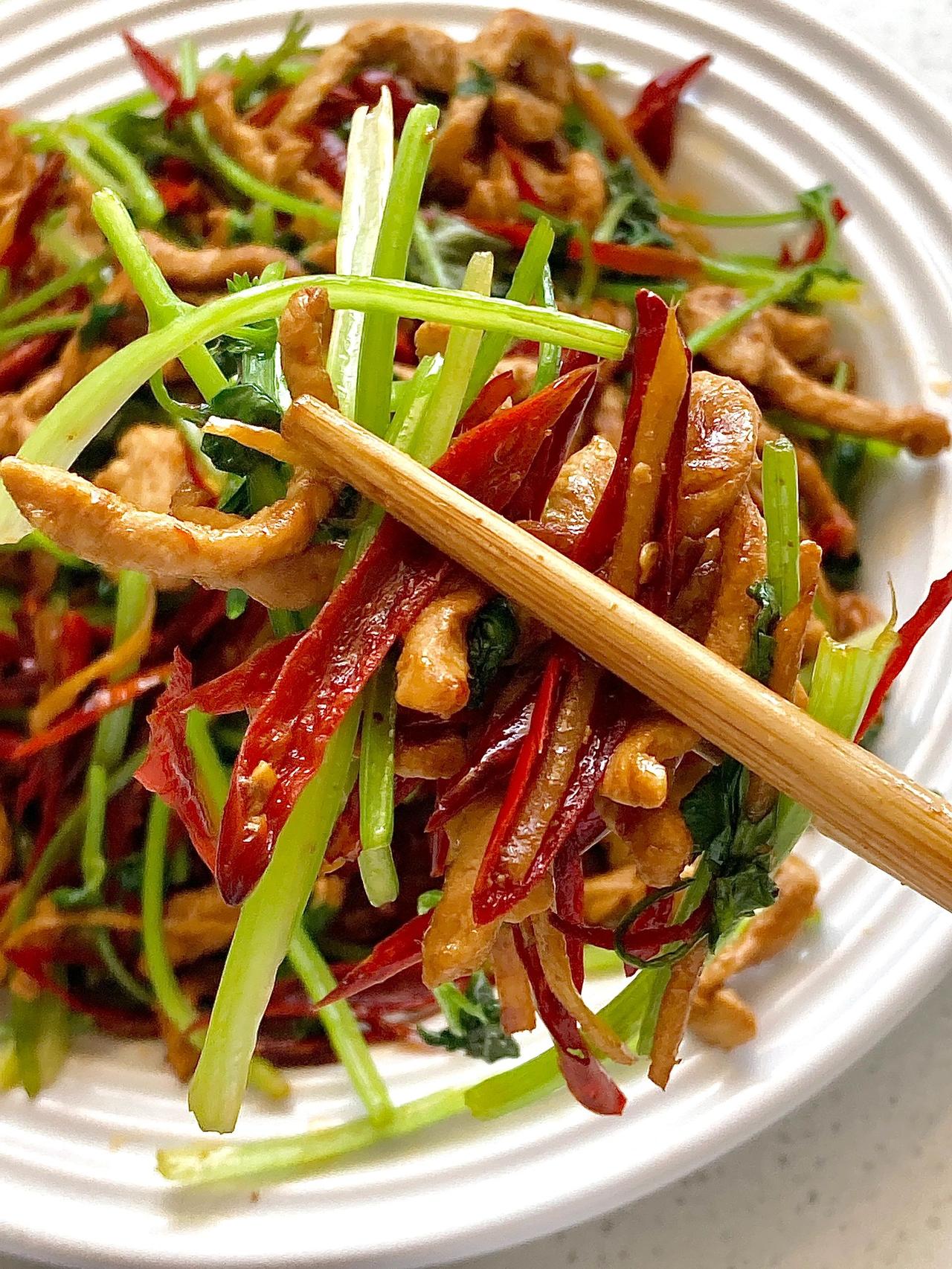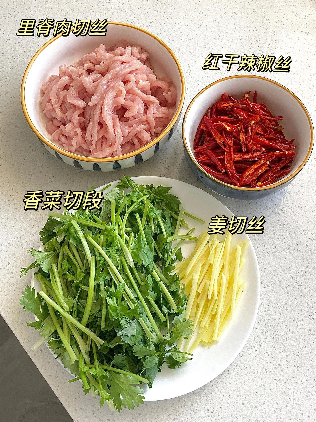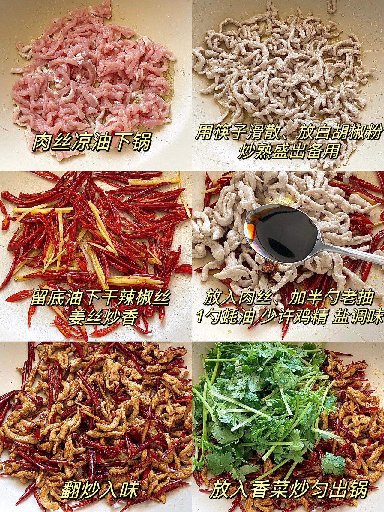 我妈做的“香辣肉丝”太香了!!! 别看它干巴巴的,但是巨下饭…… 这道菜有好几种做法!但是我还是喜欢吃我妈做的这一版,脆脆的辣椒丝➕上香菜太好吃了!里边姜丝都特好吃[偷笑R] 有喜欢的姐妹可以试试哦!真的很不戳~ 做法:参考图片 没有辣椒丝,可以用剪刀把红干辣椒剪成丝!怕辣可以提前把辣椒丝用热水泡一泡再炒,这样就不会很辣!而且炒的时候不容易糊。