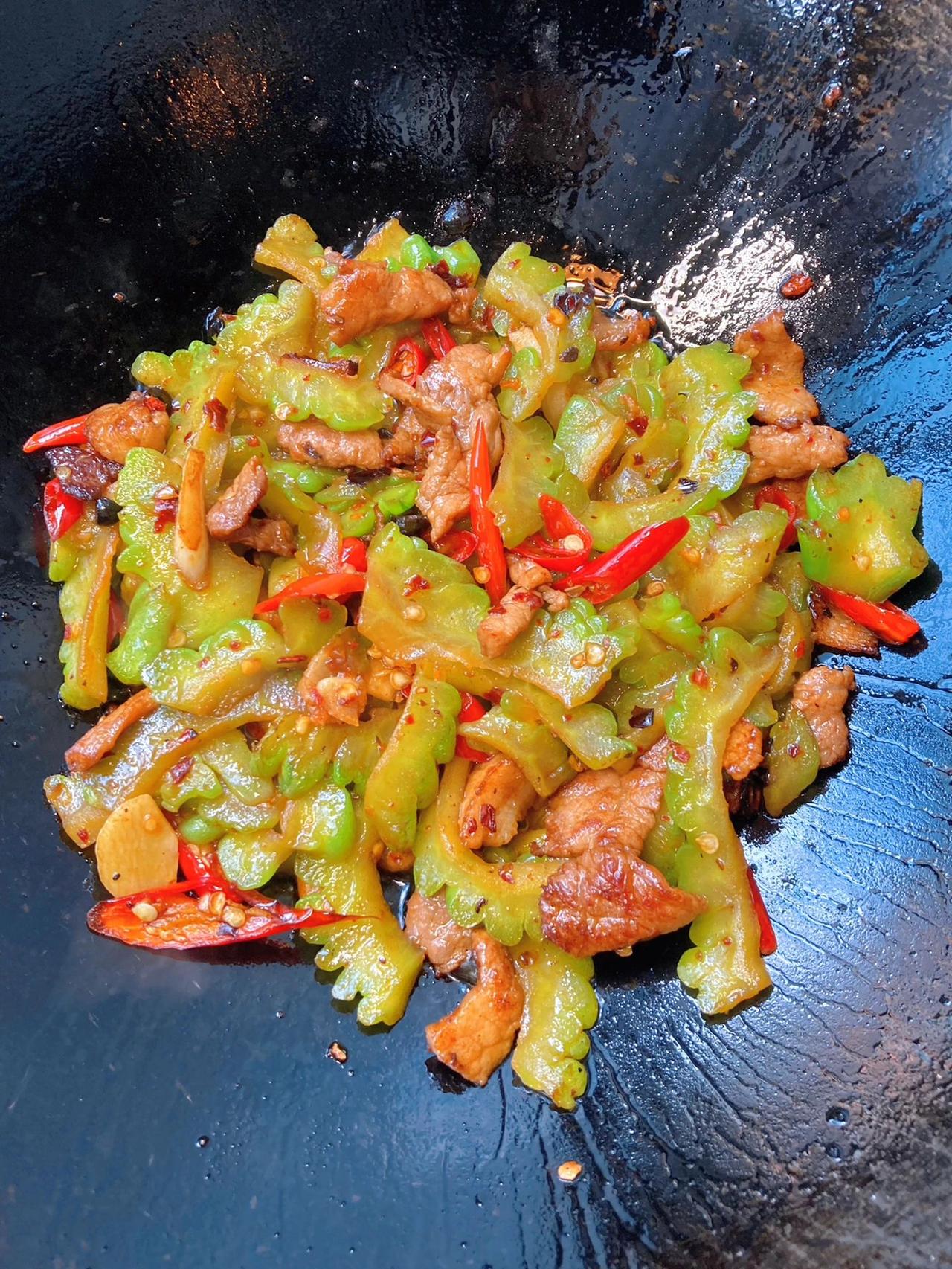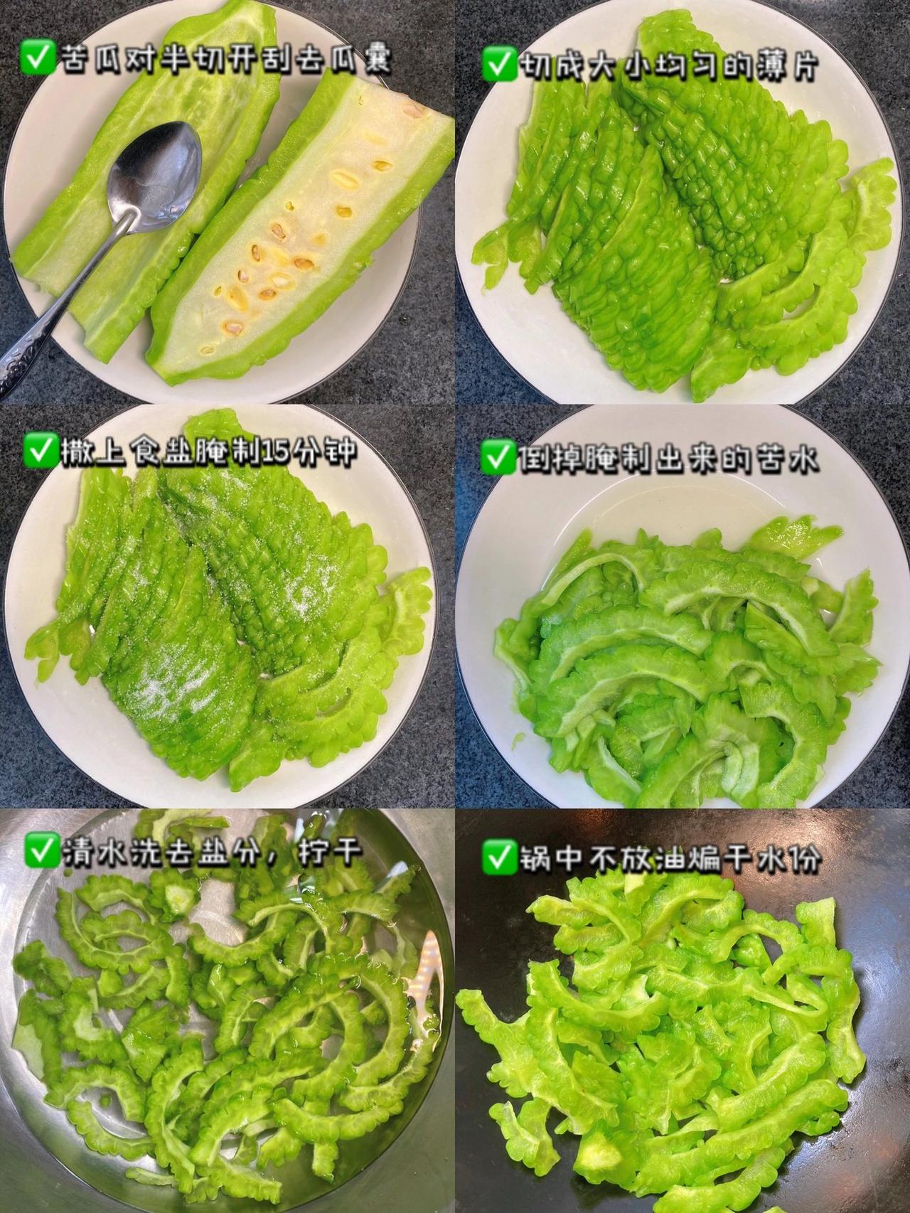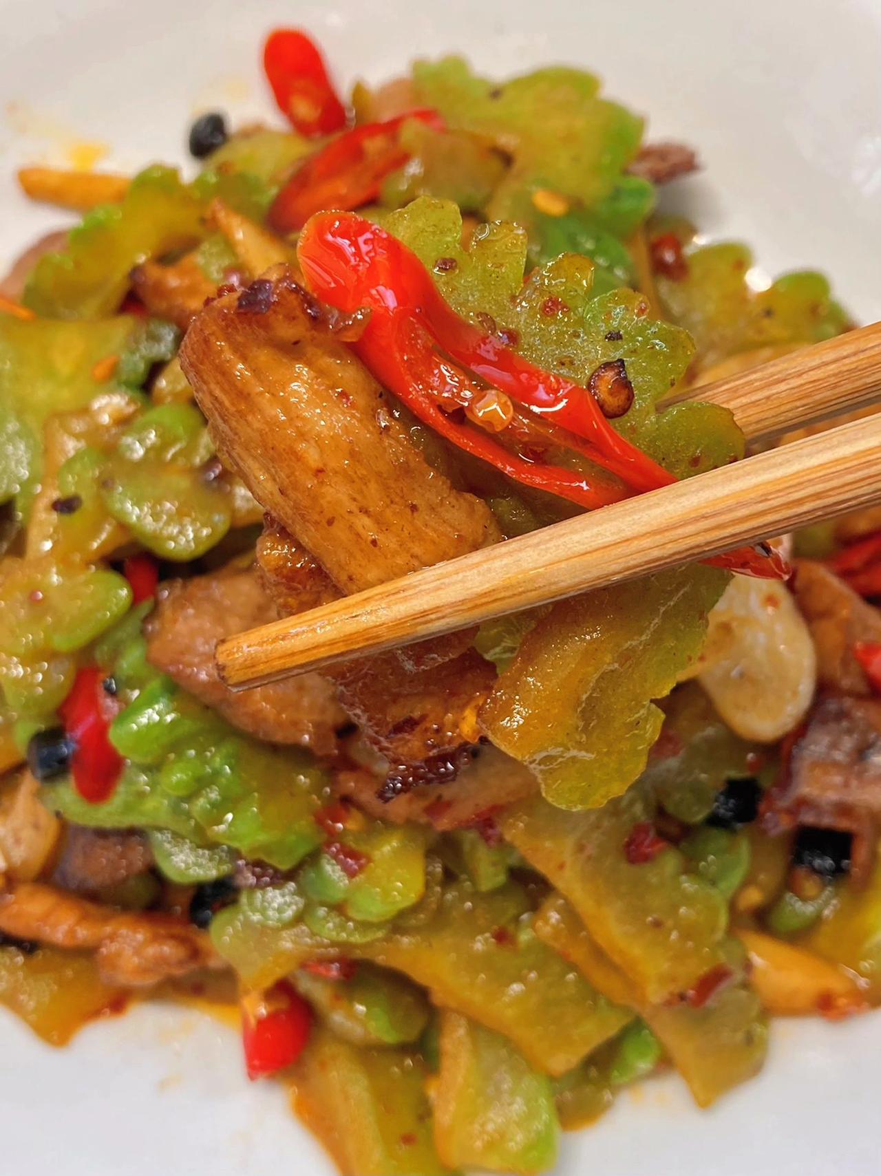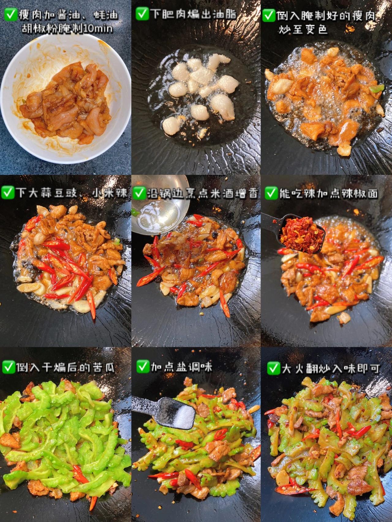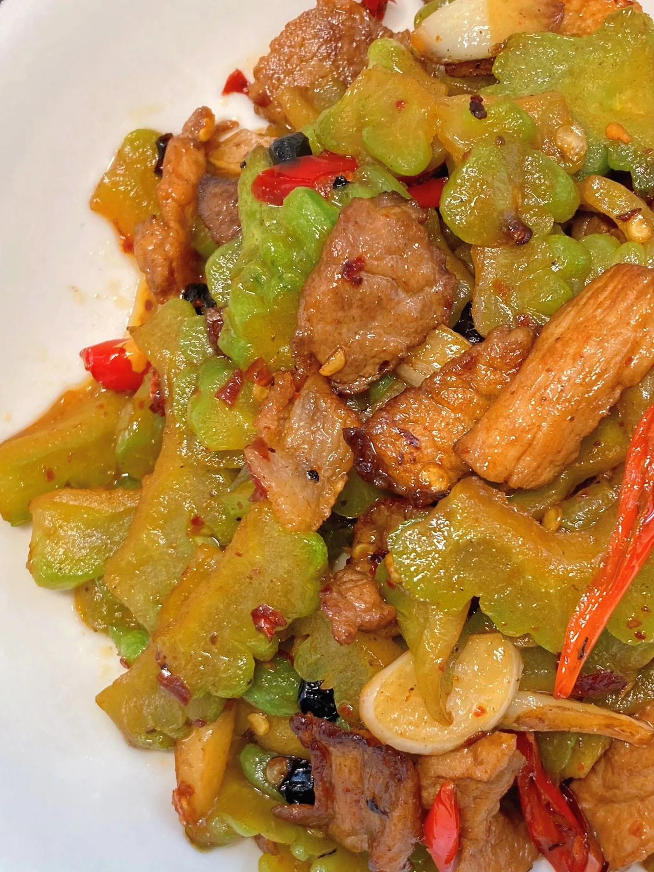 这样做的苦瓜真的不苦,苦瓜炒肉 这么耶的天,宝子们一定要多吃苦瓜解解暑呀,跟着我这个做法来做,能多吃两碗饭 食材准备:苦瓜、猪肉、小米辣、大蒜、豆豉 1、苦瓜对半切开去囊,切成大小均匀的薄片,撒上食盐腌15分钟,倒入清水中抓洗干净,下入锅中干煸后捞出备用 2、猪肉肥瘦分开切薄片,瘦肉加酱油、蚝油、胡椒粉抓拌均匀腌制10分钟 3、锅中放少量油下肥肉煸出油脂,再倒入腌制好的瘦肉炒至变色后下入小米辣、大蒜和豆豉,烹入少许米酒增香,能吃辣的加一勺辣椒面,再倒入干煸后的苦瓜,加入少许盐调味,大火翻炒入味即可~ 重点来咯:这样处理的苦瓜可以去除苦涩味,口感也更脆 豆豉建议放,风味更佳