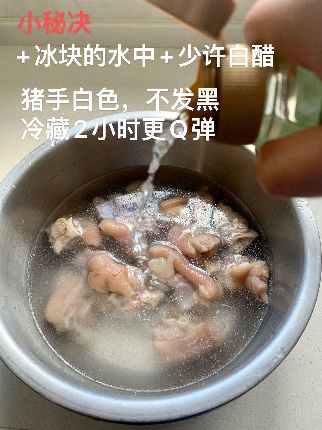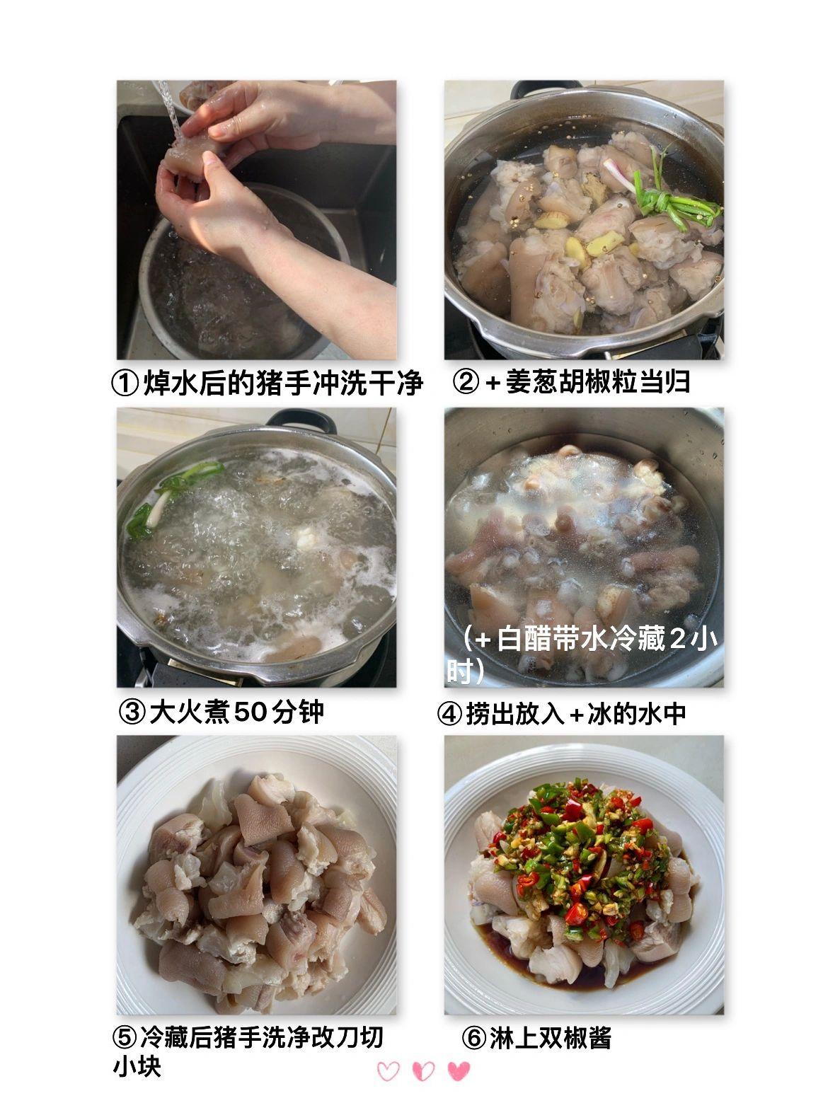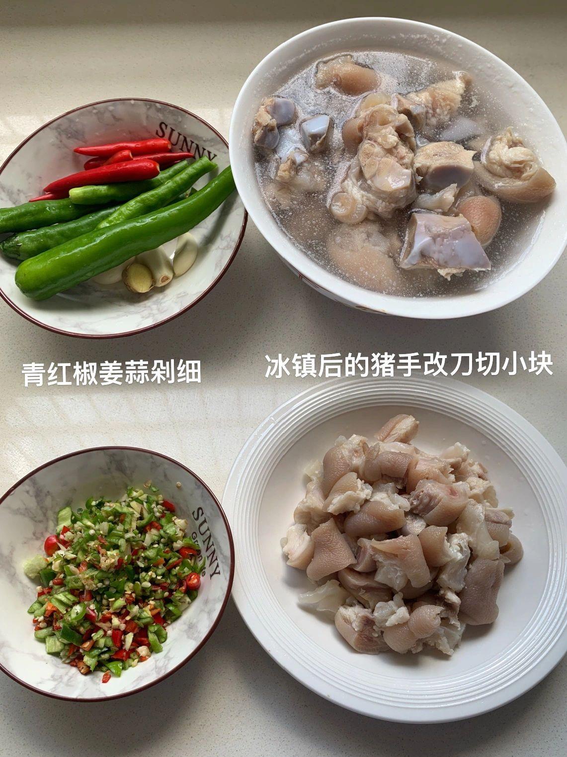 双椒猪蹄,猪蹄这样做皮Q肉白,不发黑不腻 这个凉拌猪蹄是答应我同学的另一种做法,这个还是川菜的做法,本来想做广东的沙姜猪手,没去菜市场,附近几家卖菜的小店没有沙姜。 虽然没做成粤菜,但还是用到了广州白云猪手的处理方式,煮好的猪手+白醋+冰水浸泡,更Q弹而且白不发黑。 食材:猪手、青红椒、姜蒜末 料汁:青红椒姜蒜末、生抽、白醋、白糖、蚝油、滕椒油+热油提升香味 做法:1、猪蹄焯水后洗净备用 2、猪蹄+葱姜胡椒粒当归,开盖大火煮50分钟 3、捞出猪蹄放入+冰的水中,冷藏2小时 4、冷藏后冲洗干净油脂,改刀切小块,淋上料汁