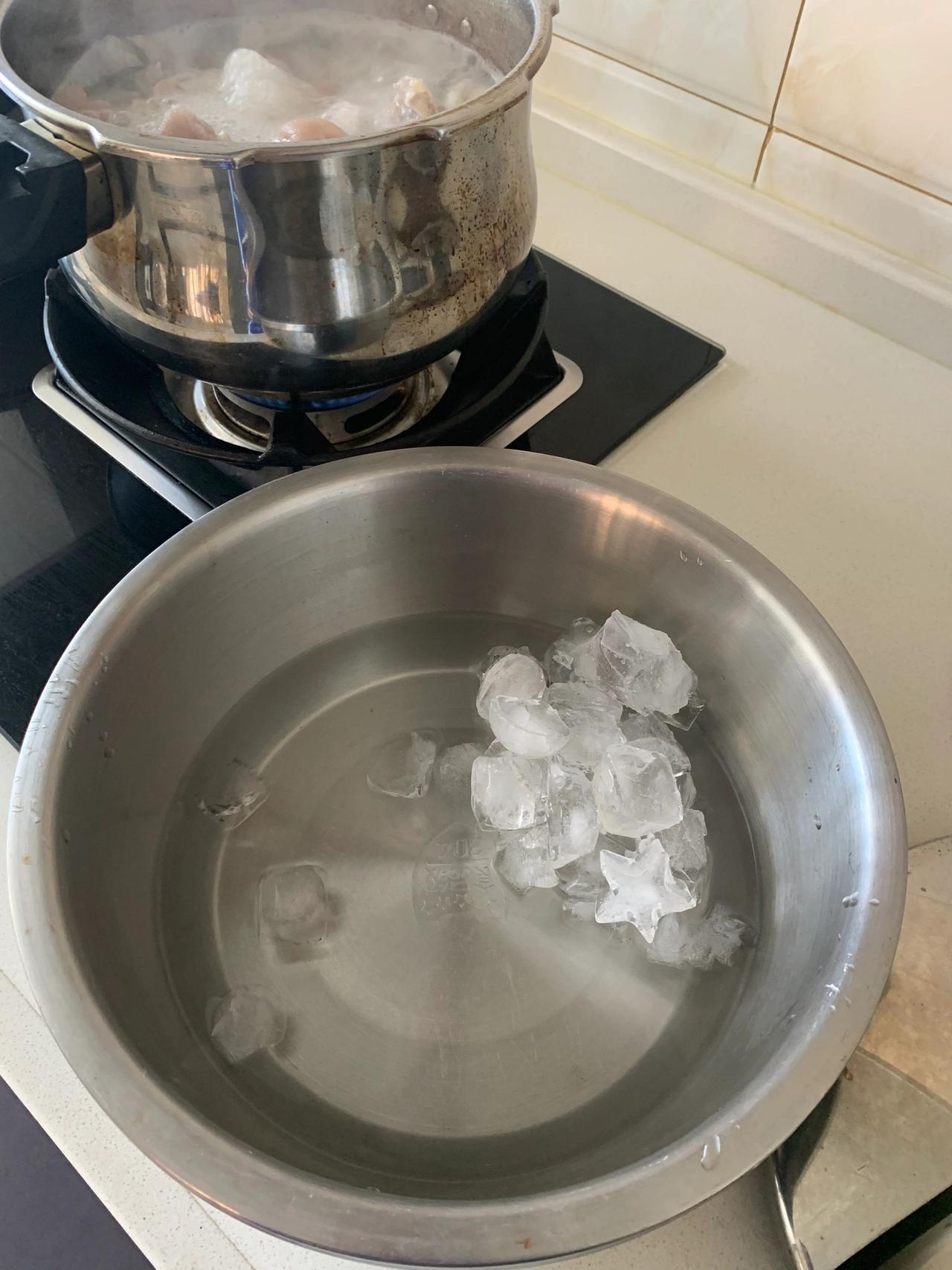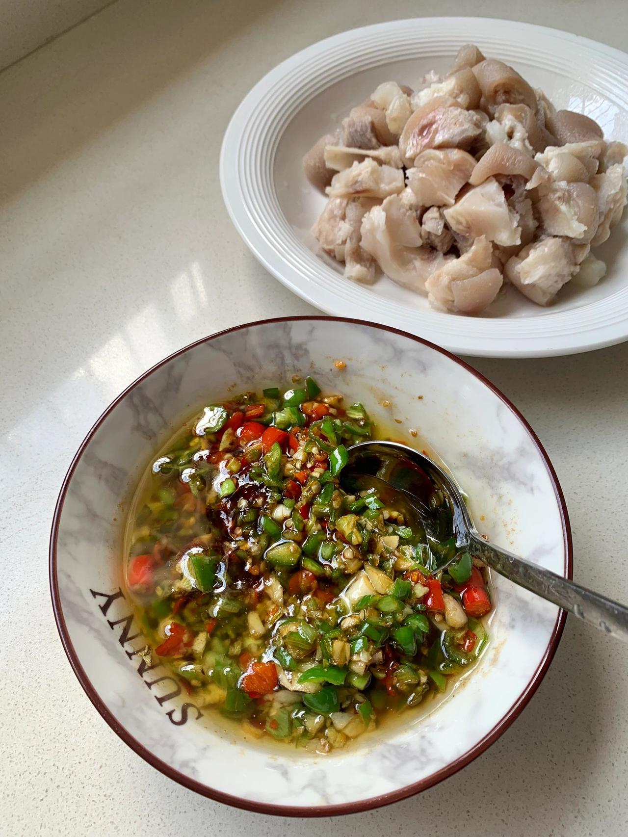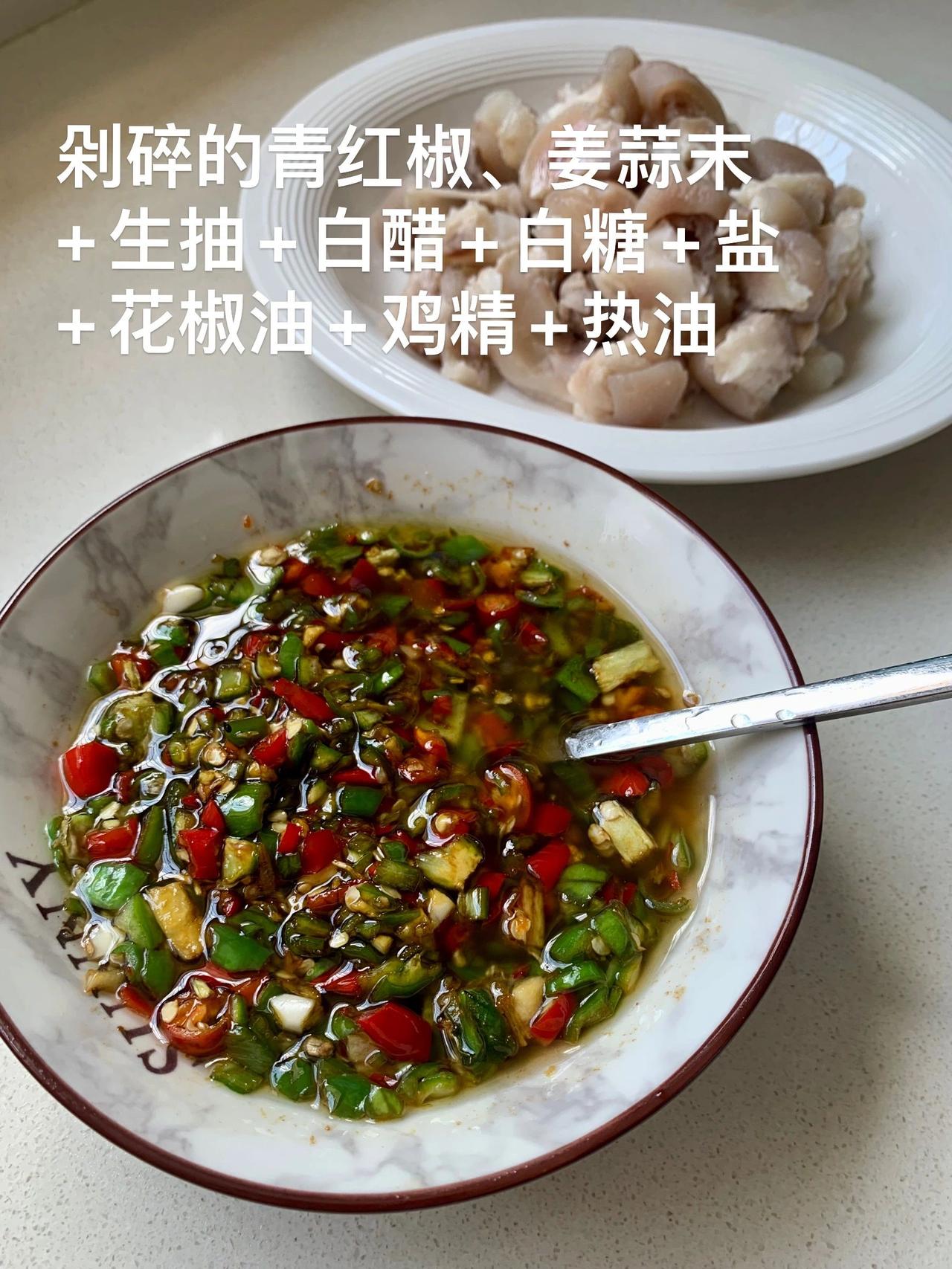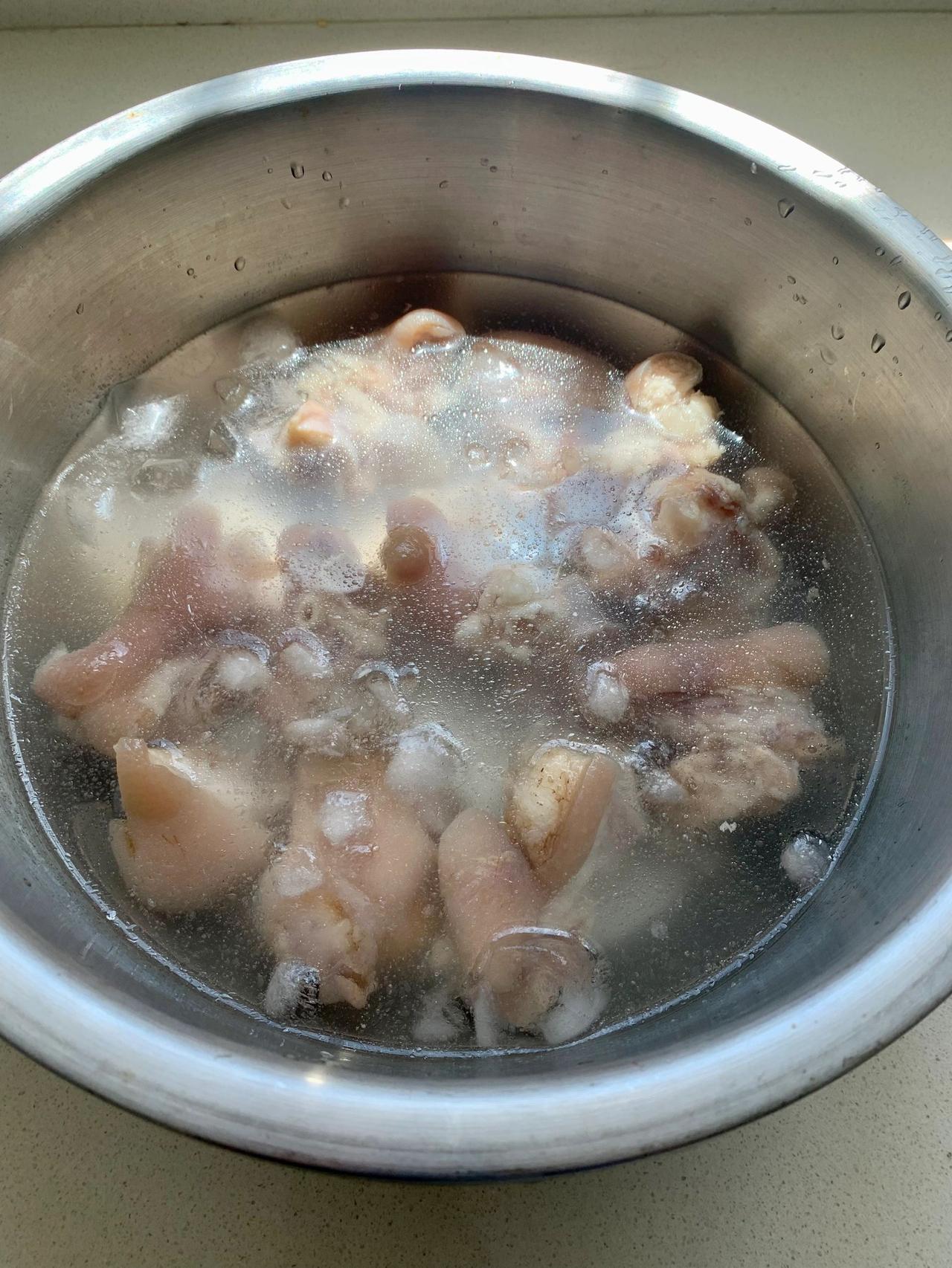 双椒猪蹄,猪蹄这样做皮Q肉白,不发黑不腻 这个凉拌猪蹄是答应我同学的另一种做法,这个还是川菜的做法,本来想做广东的沙姜猪手,没去菜市场,附近几家卖菜的小店没有沙姜。 虽然没做成粤菜,但还是用到了广州白云猪手的处理方式,煮好的猪手+白醋+冰水浸泡,更Q弹而且白不发黑。 食材:猪手、青红椒、姜蒜末 料汁:青红椒姜蒜末、生抽、白醋、白糖、蚝油、滕椒油+热油提升香味 做法:1、猪蹄焯水后洗净备用 2、猪蹄+葱姜胡椒粒当归,开盖大火煮50分钟 3、捞出猪蹄放入+冰的水中,冷藏2小时 4、冷藏后冲洗干净油脂,改刀切小块,淋上料汁