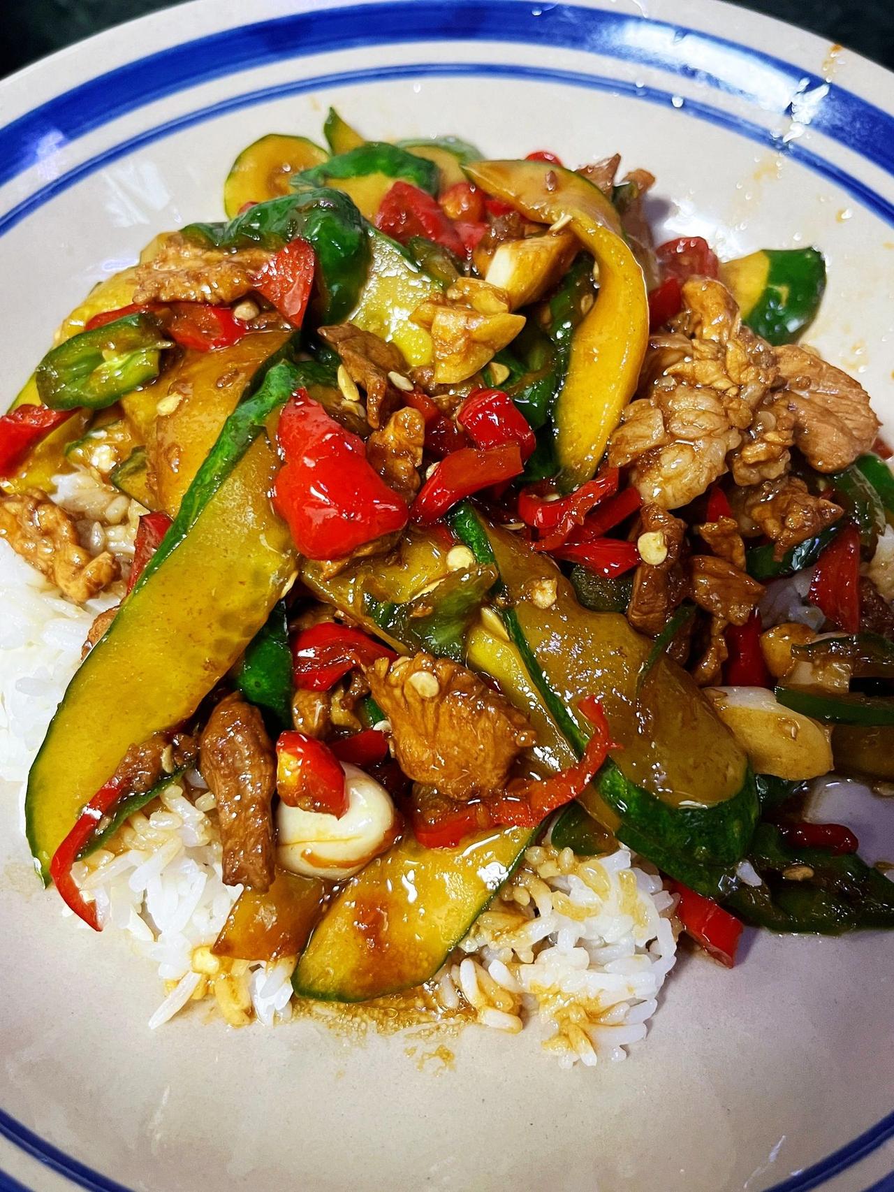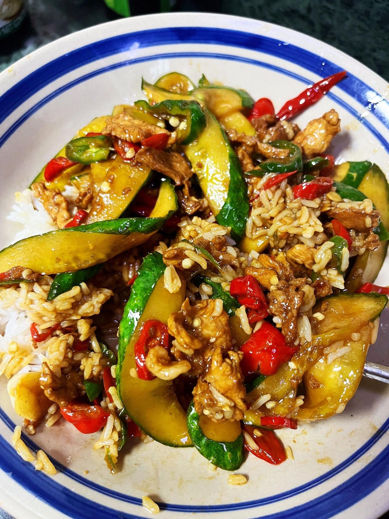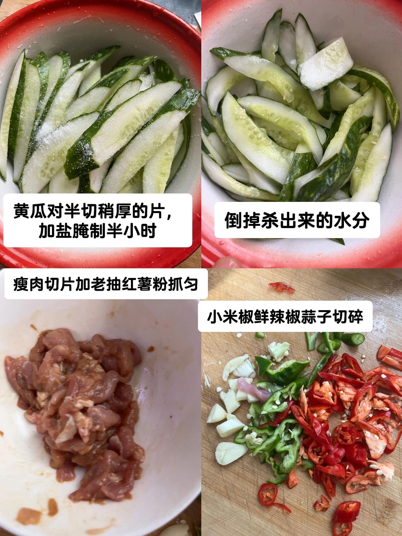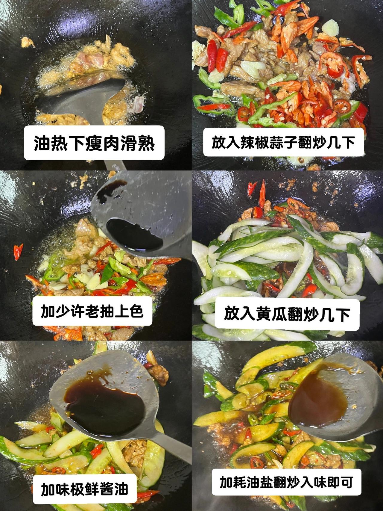 黄瓜炒肉盖码饭,只恨米饭煮少了~巨巨下饭,又鲜又辣,黄瓜杀过水再来炒更脆爽,简单又快手~ 食材:黄瓜,夹肥瘦肉,蒜子,小米椒,鲜辣椒。 1、黄瓜对半切稍厚的片,加盐腌制半小时,倒掉杀出来的水分,瘦肉切薄片用红薯粉老抽抓拌均匀,辣椒蒜子切碎。 2、油热下瘦肉滑熟,放入辣椒蒜子翻炒几下,加少许老抽上色,放入黄瓜翻炒几下。 3、加味极鲜酱油耗油盐翻炒入味即可。