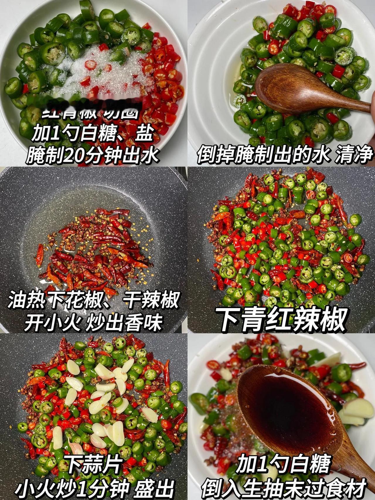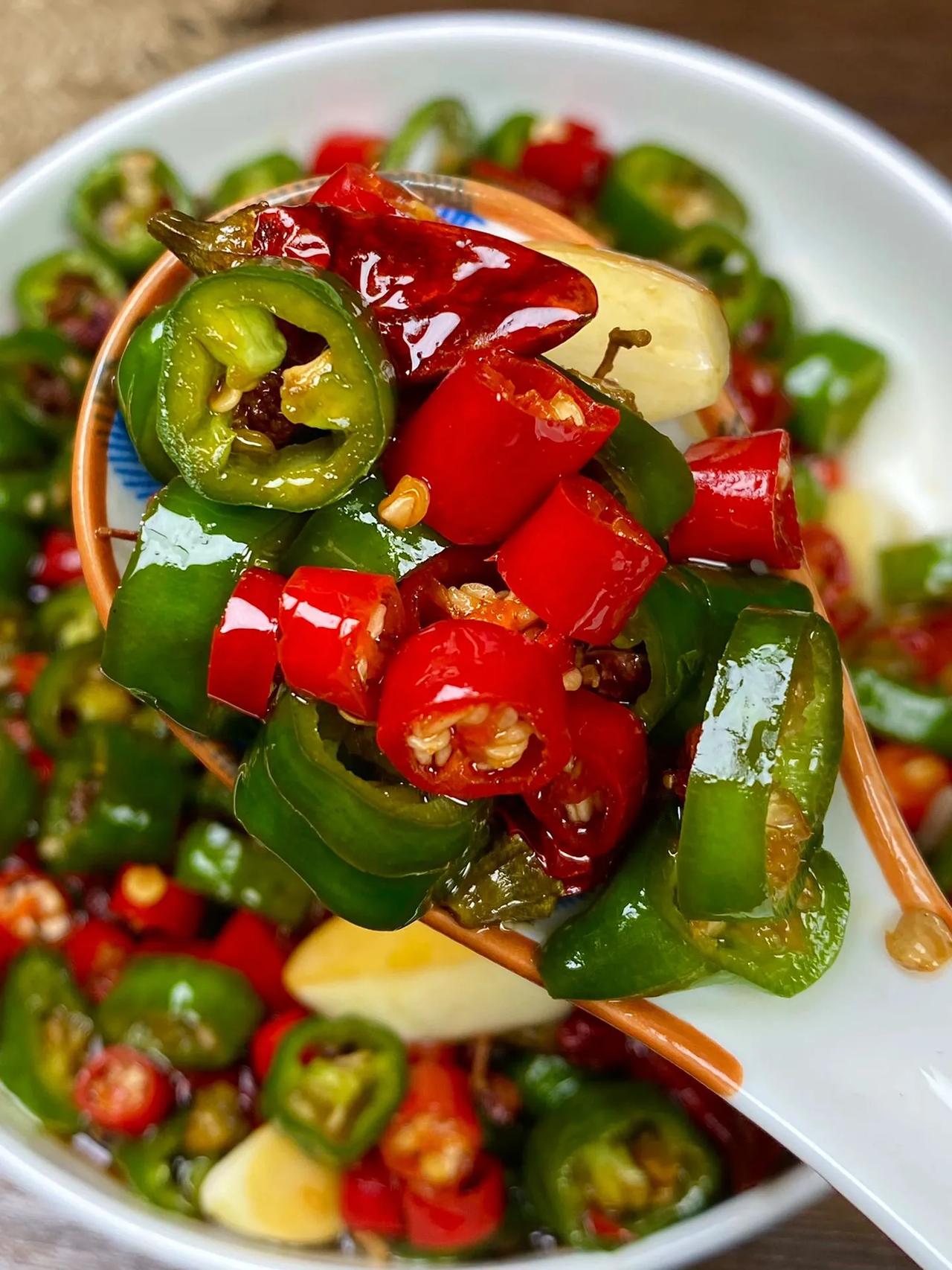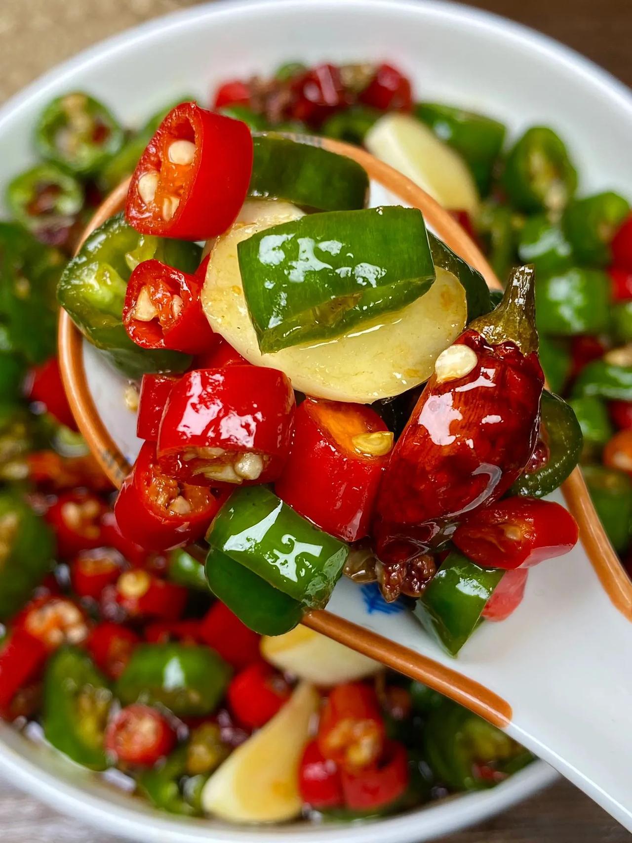 我就随手做了个菜,家里的馒头都不够吃了! 这个腌辣椒圈真的是一绝!巨好吃! 做法: 1、红青椒切圈加1勺白糖、盐腌制20分钟出水,倒掉腌制出的水清净; 2、油热下花椒、干辣椒,开小火炒出香味 ,下青红辣椒、蒜片小火炒1分钟盛出; 3、加1勺白糖,倒入生抽末过食材即可。