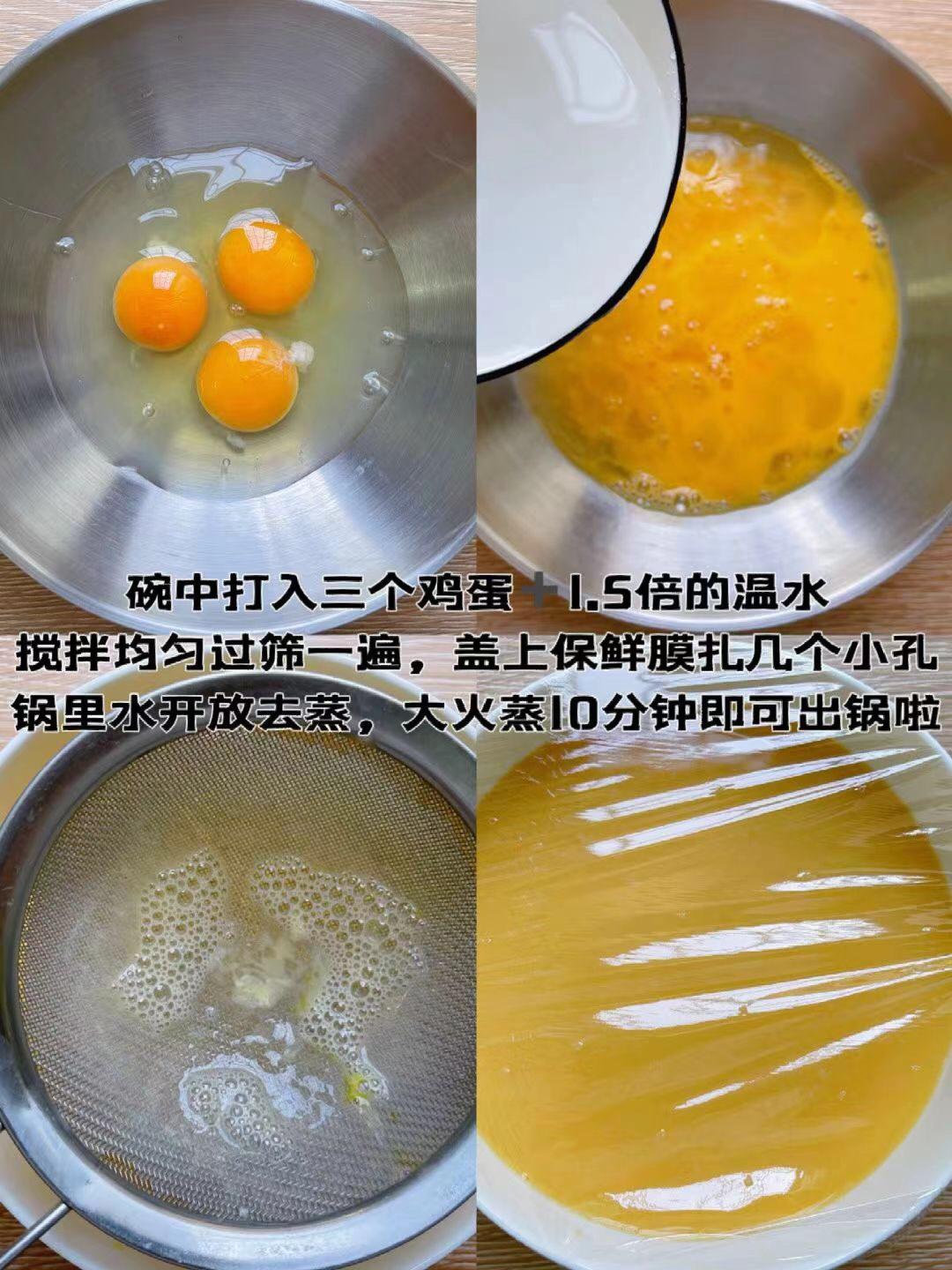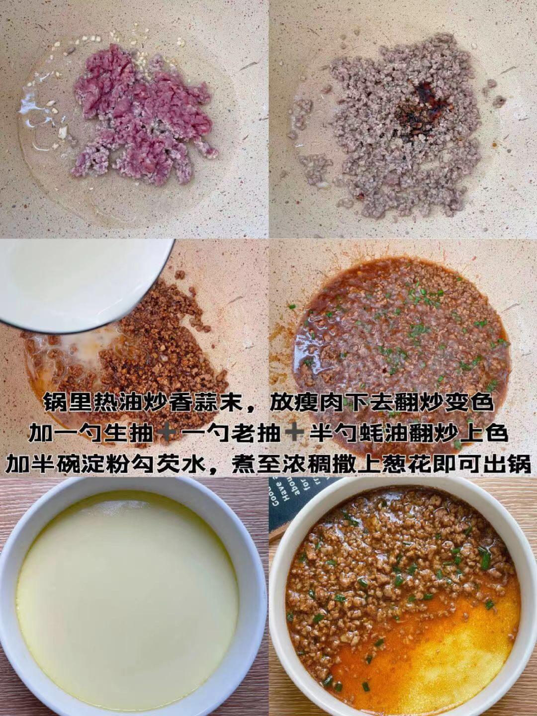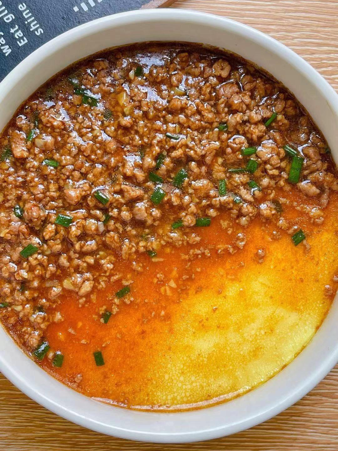 一口入魂的肉末水蒸蛋,比布丁还要嫩滑 不管是小朋友还是大人都会很喜欢的一道菜。团宝吃完一直对我说,爸比明天我还要吃;简简单单的五分钟美食,宝子们记得收藏噢 食材准备:鸡蛋 肉末 蒜末 葱花 淀粉勾芡半碗水备用 做法:碗中打入三颗鸡蛋➕1.5倍的温水搅拌均匀过筛一遍(注:过筛是为了口感细腻) 盖上保鲜膜扎几个小孔,锅里水开放去蒸,大火蒸10分钟即可出锅。 起锅烧油炒香蒜末,放入肉末下去翻炒变色,加一勺生抽➕一勺老抽➕半勺耗油翻炒上色➕半碗淀粉勾芡水,煮至浓稠撒上葱花即可,把炒好的肉末倒入蒸好的鸡蛋上面即可啦