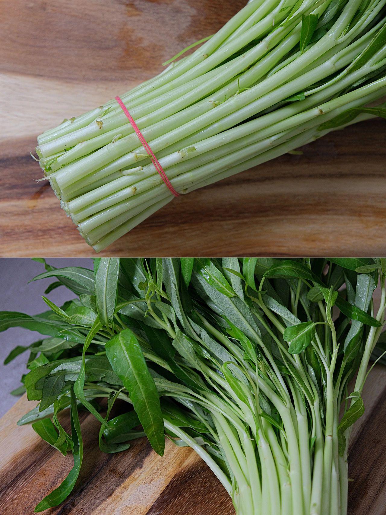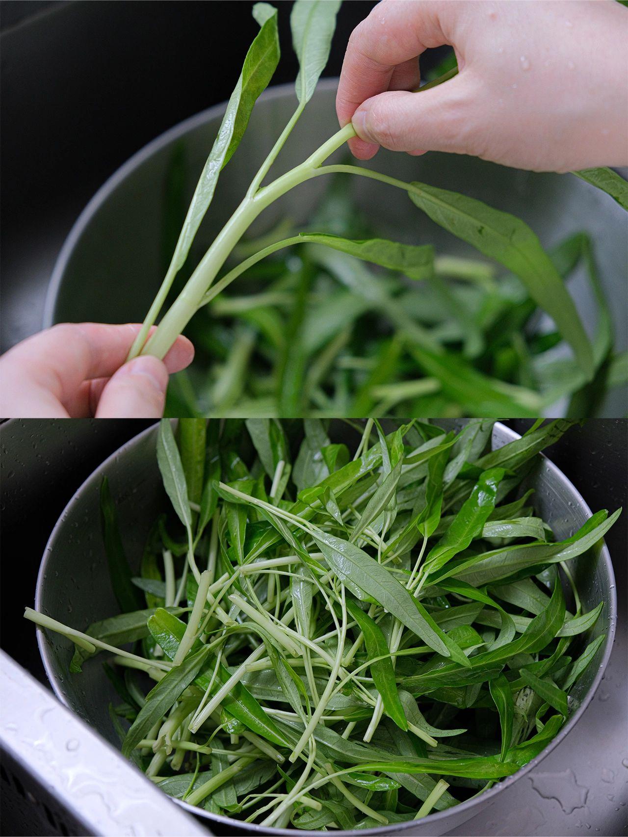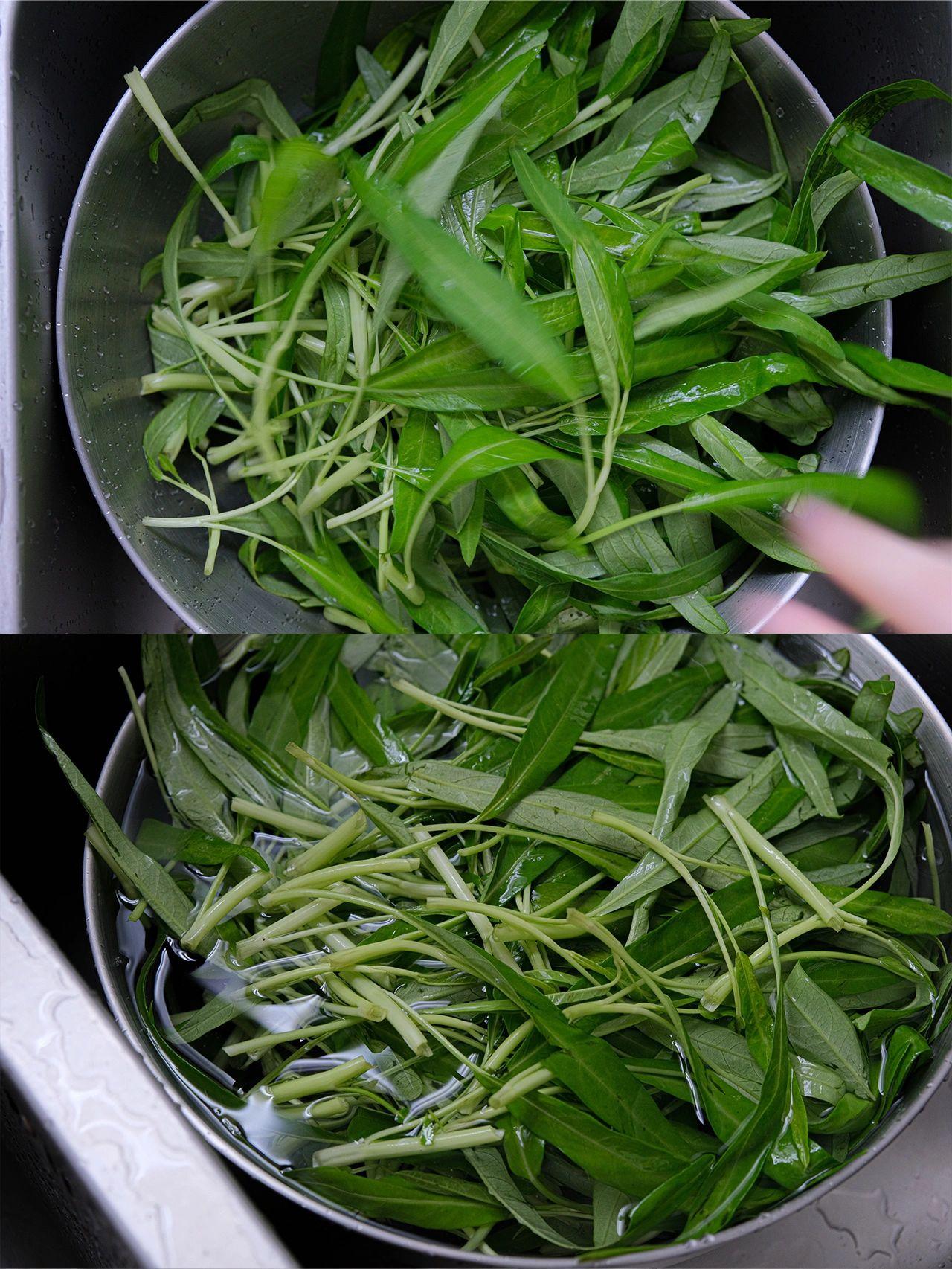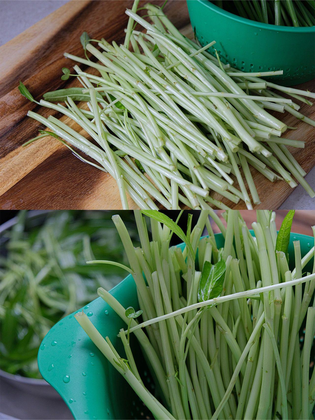 闷热的夏天,需要凉拌空心菜来拯救 蕹菜,别名空心菜,是我家夏季餐桌上出现频率最高的蔬菜之一。它的做法很多,夏天食欲不振的时候,就会用来凉拌,开水烫熟,调好汁便能上桌,菜杆脆爽,菜叶柔嫩多汁。 空心菜营养丰富,不过草酸含量比较高,炒的话也建议先焯水。 食材:空心菜一把、大蒜虾皮适量 做法:1、空心菜顺着有叶子的节点掐段,一段梗一片叶子。将择好的空心菜清洗几遍,放满水泡一会。(多余梗留着炒其他菜) 2、调一碗料汁,大蒜剁蒜蓉,加三勺生抽、一勺醋、一勺芝麻油、半勺盐、少许糖,拌均匀。 3、烧水,放一点盐和食用油,水开后下空心菜叶,焯1-2分钟捞出空心菜沥干。装盘淋上料汁,撒些虾皮拌匀即可。