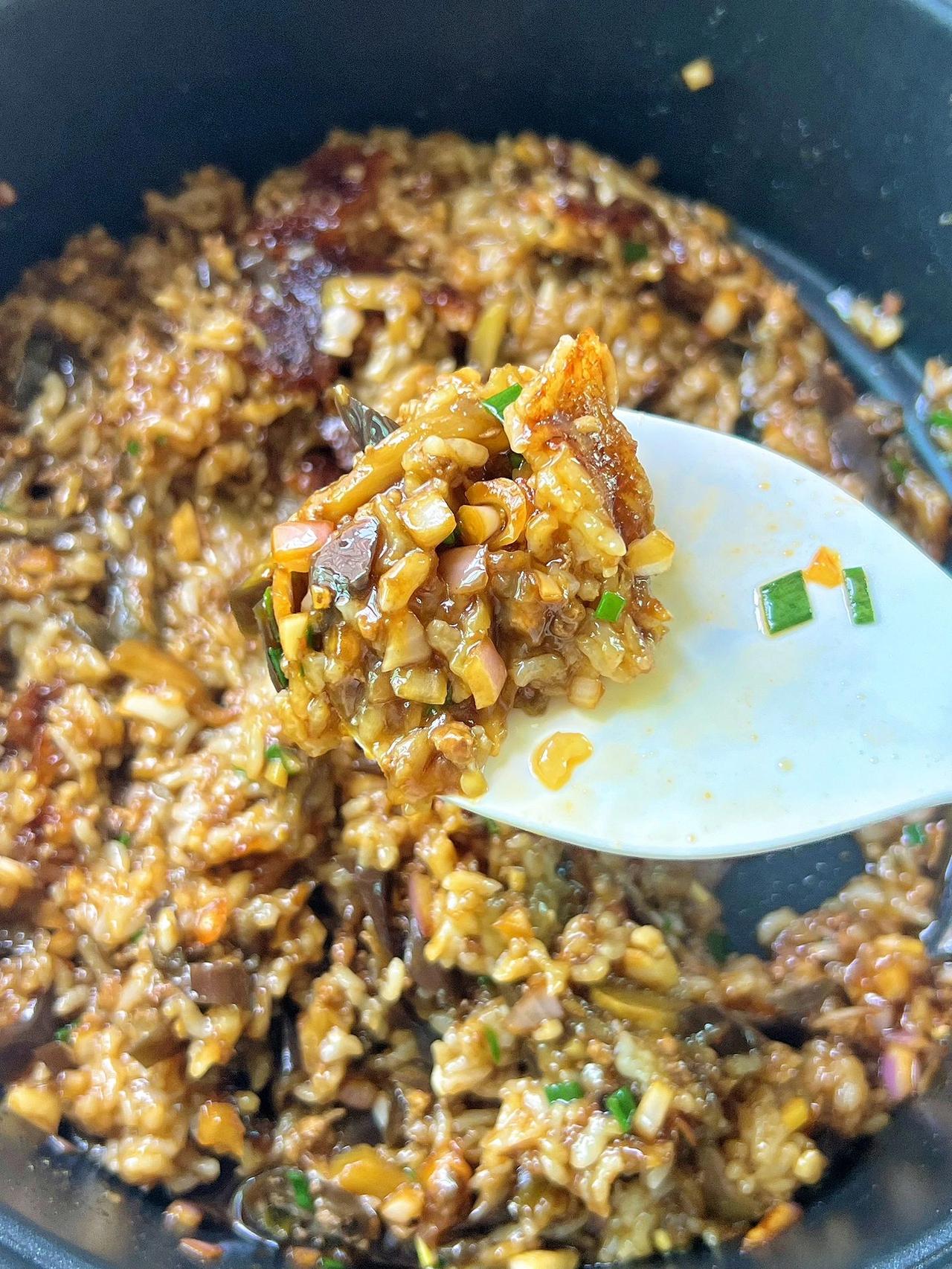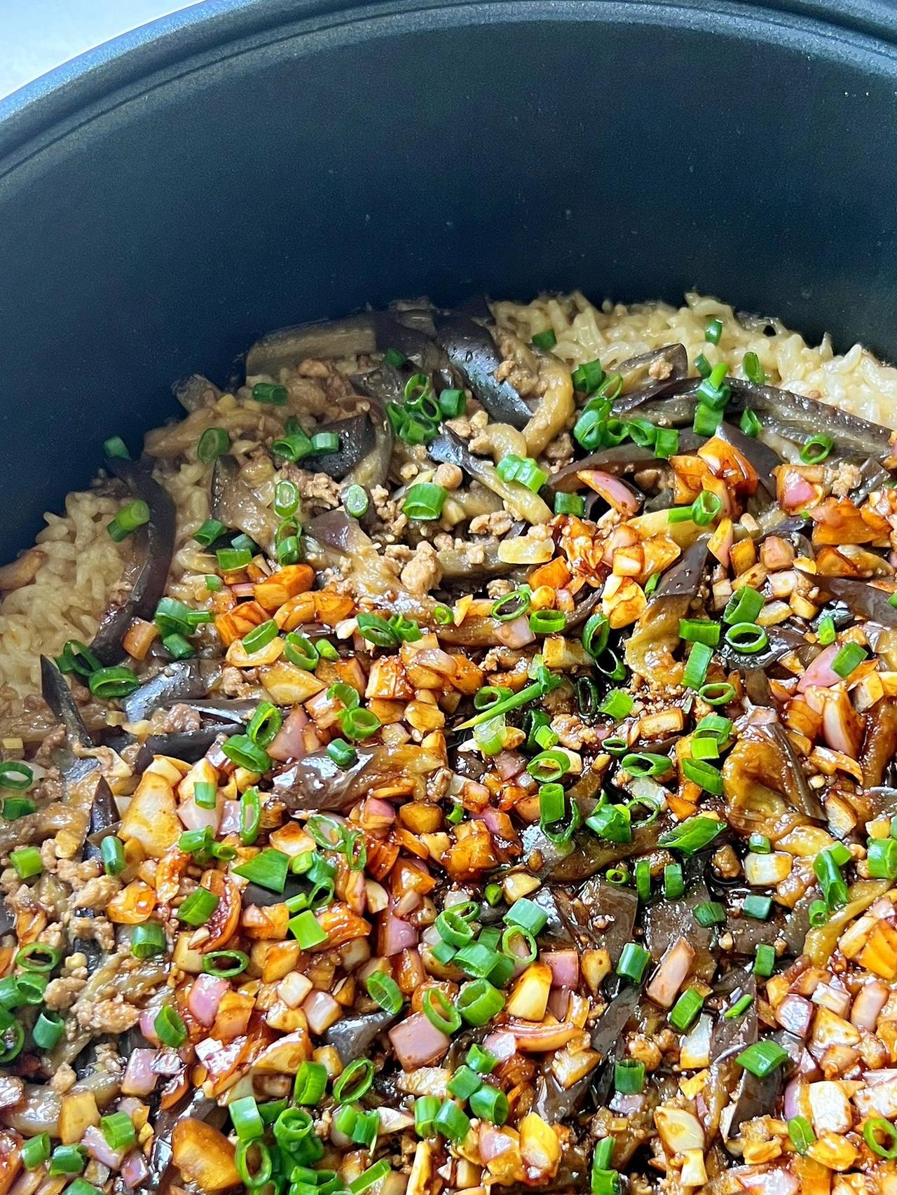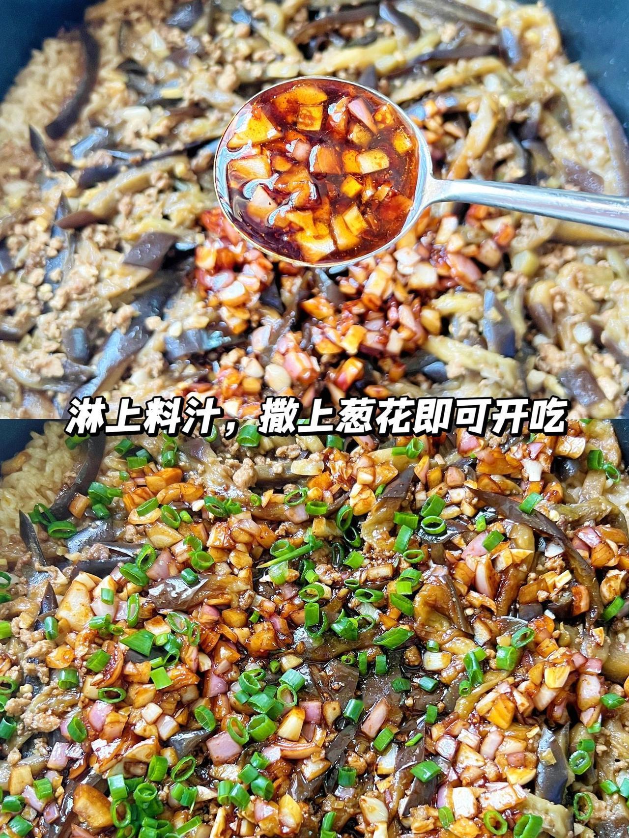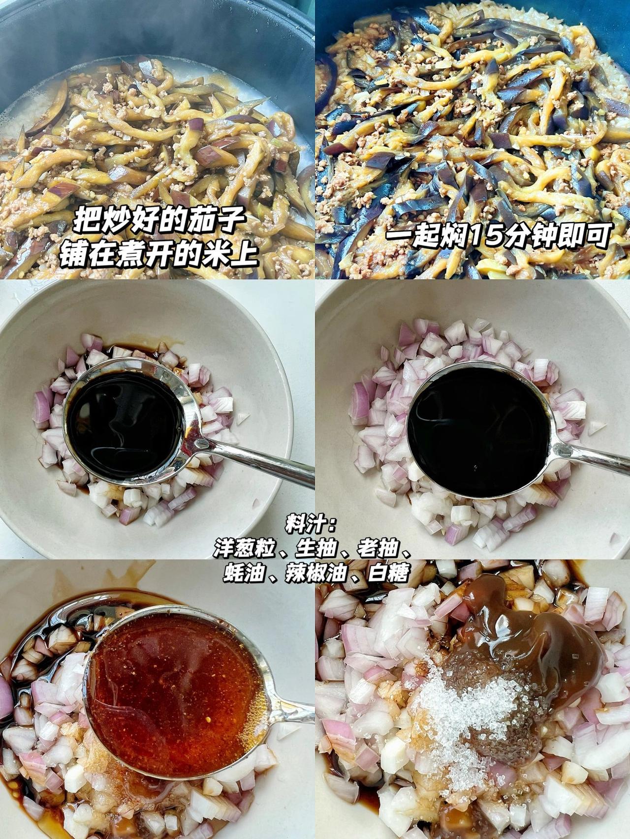 茄子不要只是红烧了,这样做的味道绝了 跟着叔叔做的茄子饭,味道真的很好吃,你们一定要去试试~ 食材:茄子、洋葱、葱花、蚝油、生抽、辣椒油、白糖、葱姜蒜 教程:1、大米提前泡40分钟,茄子切丝、猪肉剁成末备用;葱头、姜、蒜切成末备用。 油热现将肉末炒散后加入葱姜蒜末炒香,再倒入茄子炒软,然后加生抽老抽蚝油盐调味。 2、大米加适量的水煮开后,倒入炒好的茄子,继续煮至大米变熟即可。 3、调料汁:洋葱粒、生抽、老抽、蚝油、白糖、辣椒油调匀,煮好茄子饭后淋在上面,撒上葱花即可。 茄子饭拌匀,夹杂在米饭里的洋葱粒特别有颗粒感,脆脆的,特别好吃