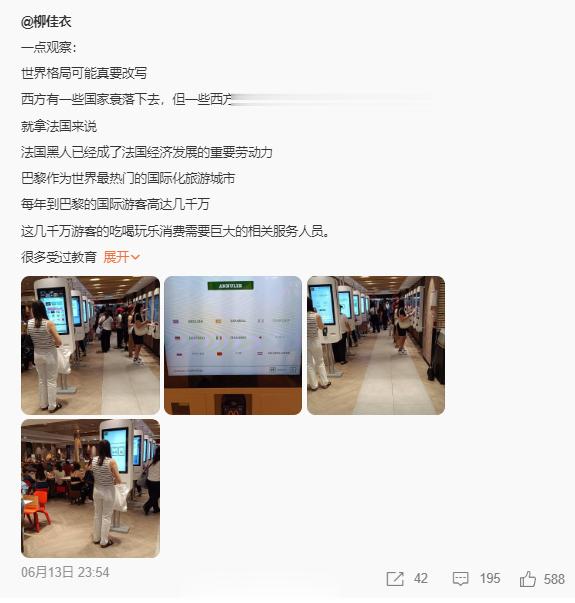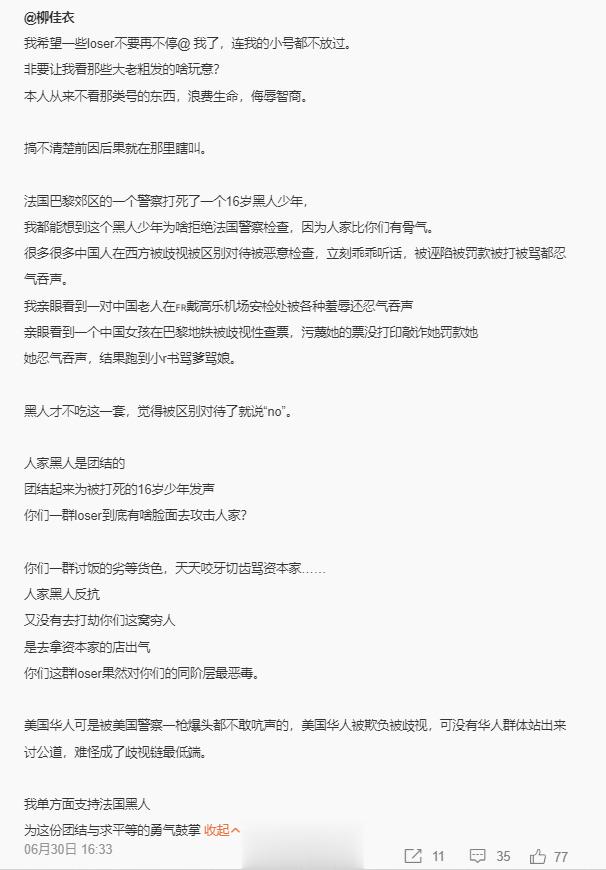 “法国黑人跟美国的黑人是不一样,毫不夸张说,法国的黑人比国内的很多人,素质都高很多。法国的黑人有一种安静、内敛、朴实的自尊、勤奋工作、热爱学习。我也经常在公园椅子上看到很多黑人在安静专注看书”…柳佳衣写的确定不是圣人吗?这真的…