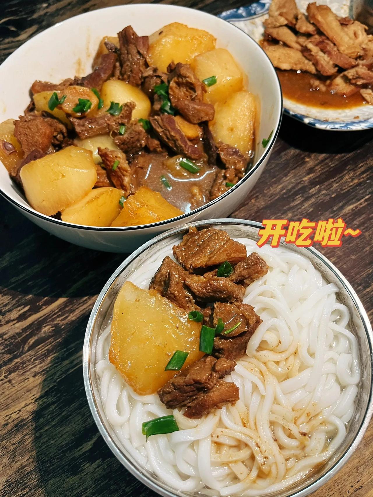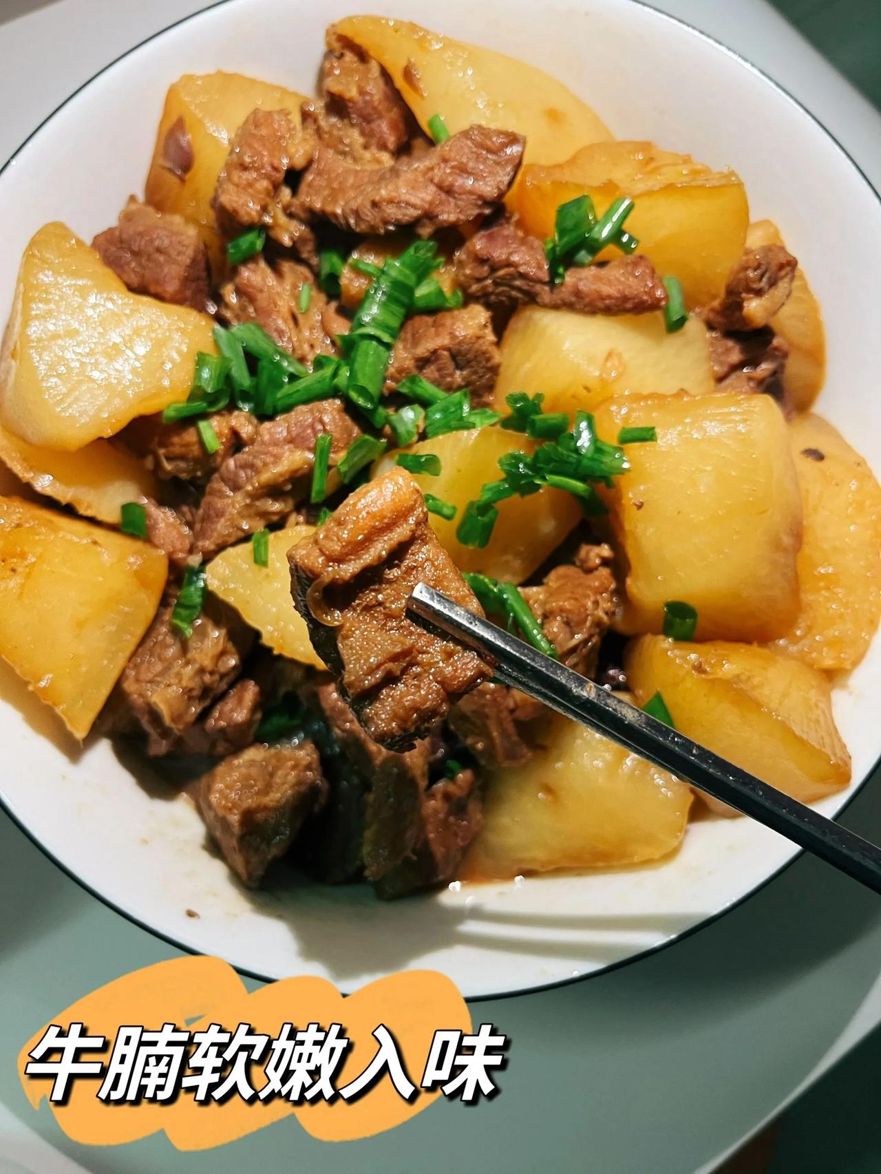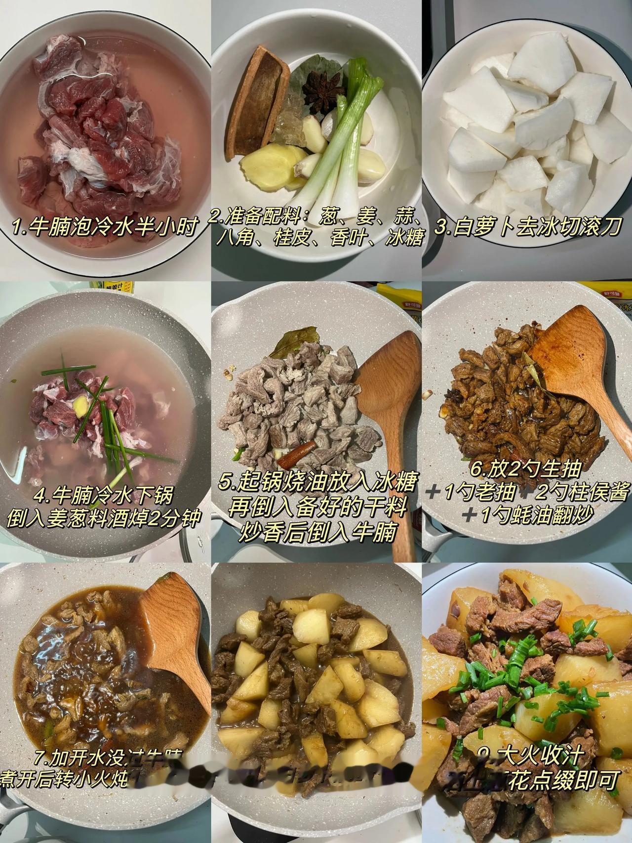 广式牛腩炖萝卜,软嫩入味,入口即化 今天给大家分享一款炖牛腩非常好吃的做法一广式牛腩炖萝卜,软嫩入味,汤汁浓郁,拌饭巨好吃!就是太费米饭了,隔壁邻居都香迷糊了 食材:牛腩:500g、萝卜:1根 配料:葱、姜、蒜、八角、桂皮、香叶若干 调料:冰糖、生抽、老抽、蚝油、柱侯酱、花生油 做法:1、牛腩泡冷水半小时去血水。 2、牛腩冷水下锅➕葱➕生姜➕料酒焯水后,用开水冲洗沥干。 3、起锅热油,放几块冰糖,小火炒至冒棕色小泡,倒入牛腩翻炒上色。 4、放葱姜蒜八角桂皮香叶炒香,2勺生抽➕1勺老抽➕2勺柱侯酱➕1勺蚝油翻炒。 5、倒入开水没过牛腩,大火煮开转小火炖一个到一个半小时。 6、放萝卜,加少许盐,再炖20分钟。收汁出锅撒葱花即可。