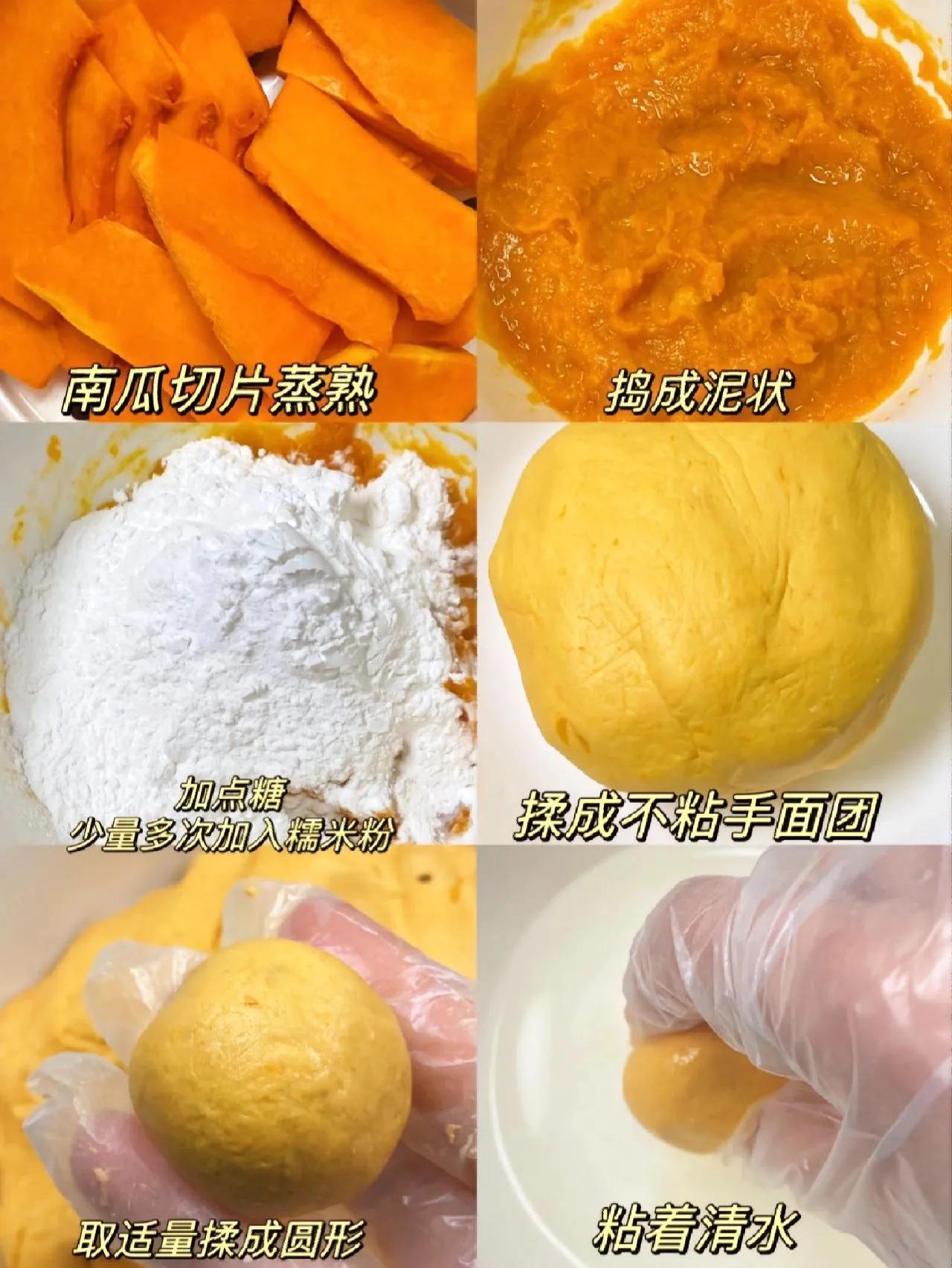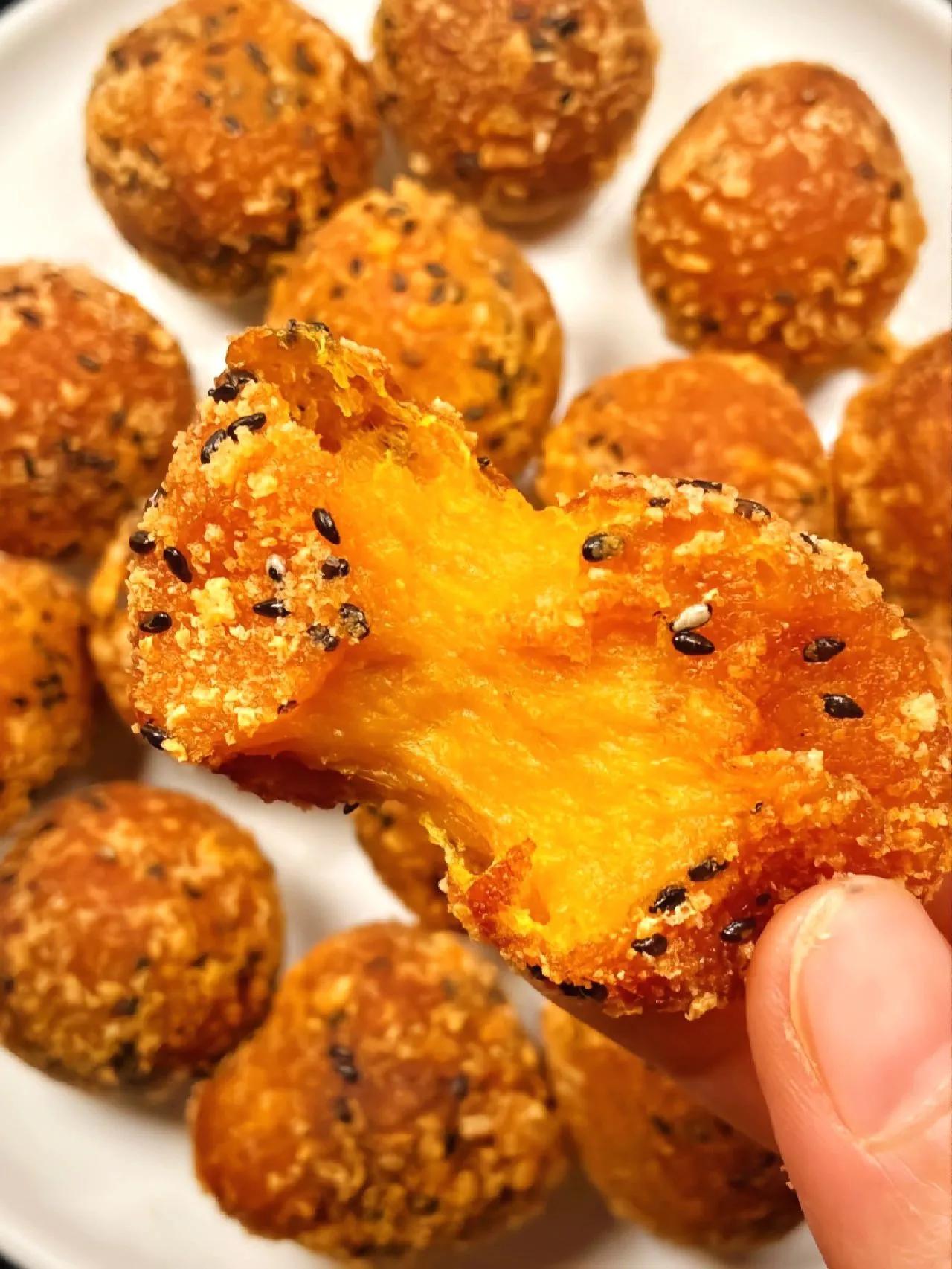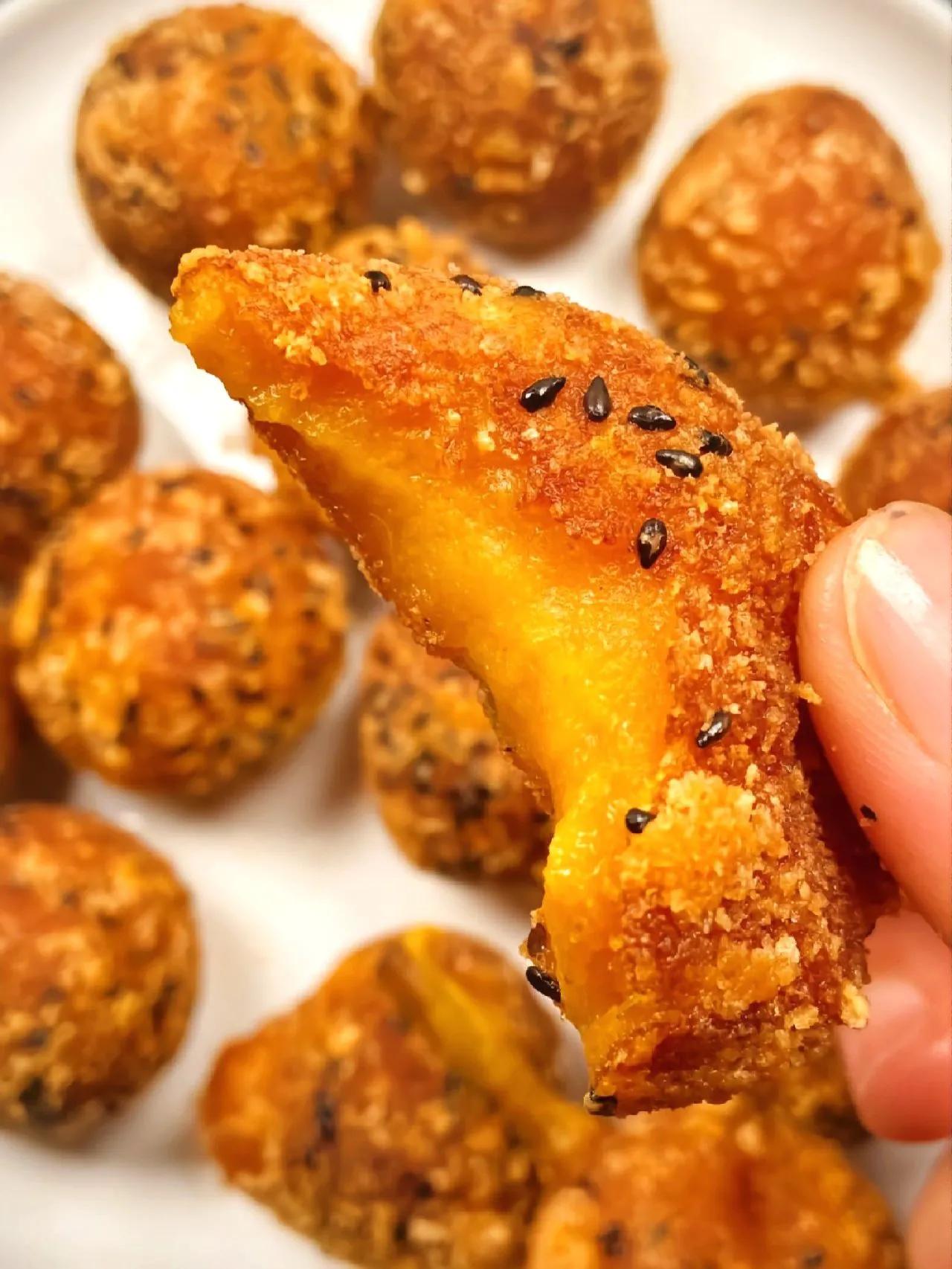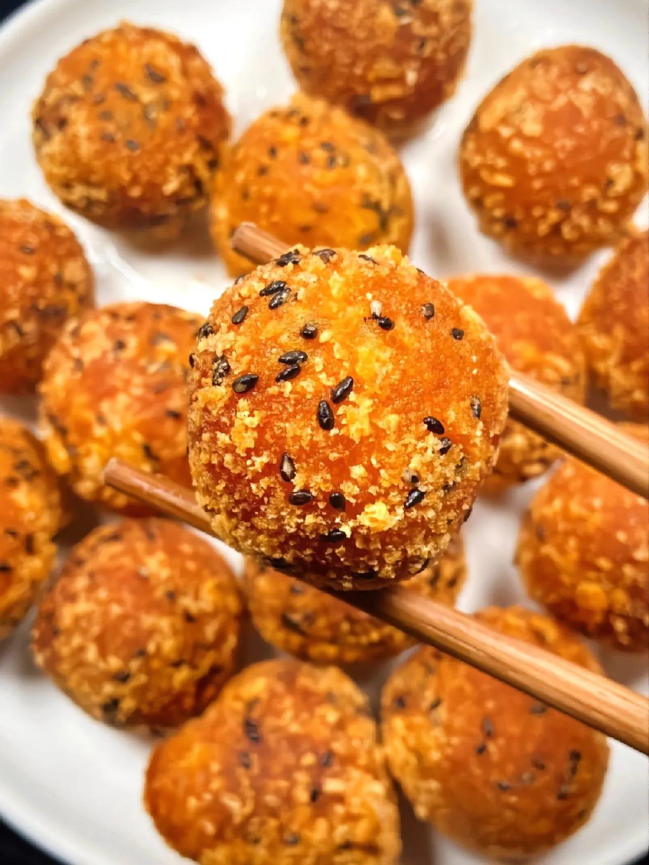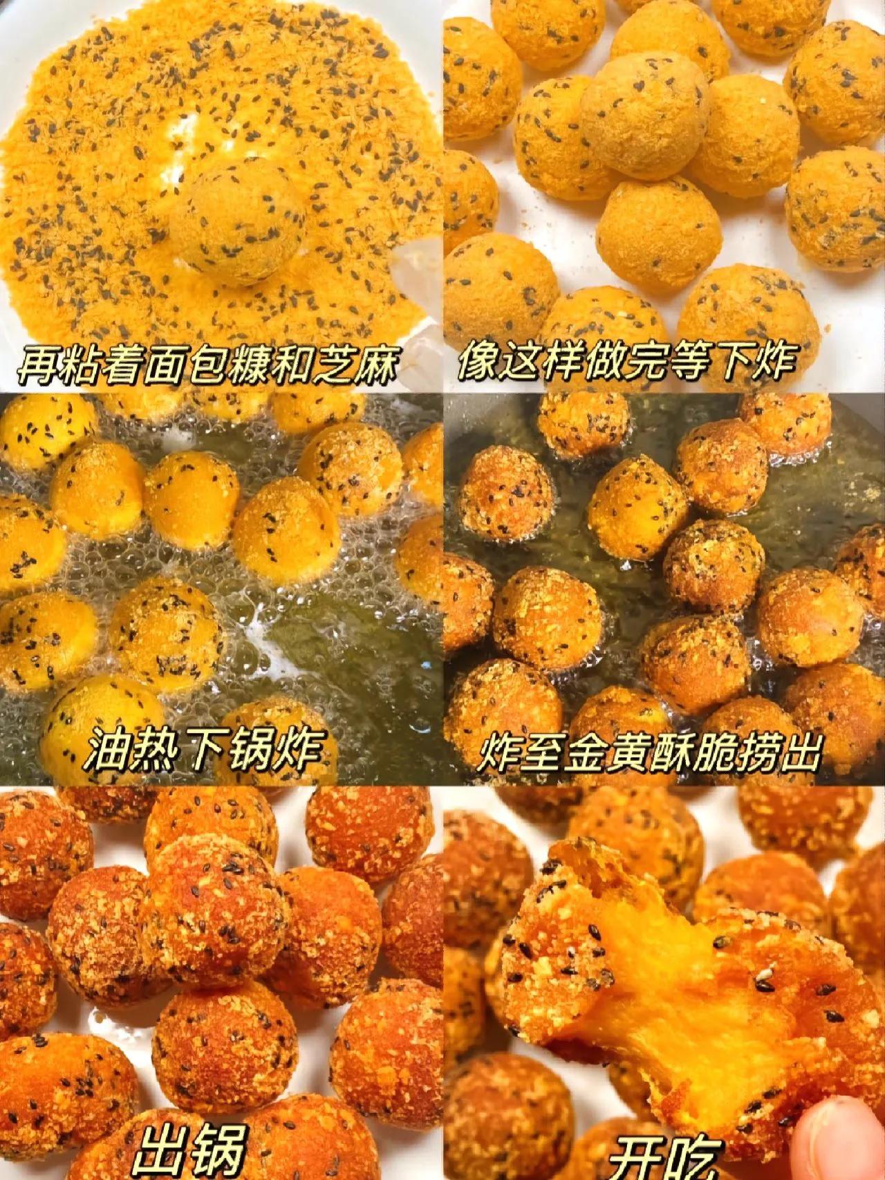 老公点名要吃的南瓜芝麻球,外酥里糯! 今天分享一道南瓜芝麻球,外酥里糯,香甜可口,做法也非常简单! 做法: 1、南瓜切片蒸熟后捣成泥状,加点糖,少量多次加入糯米粉揉成不粘手面团; 2、取适量揉成圆形,粘着清水,再粘着面包糠和芝麻; 油热下锅炸至金黄酥脆捞出即可。