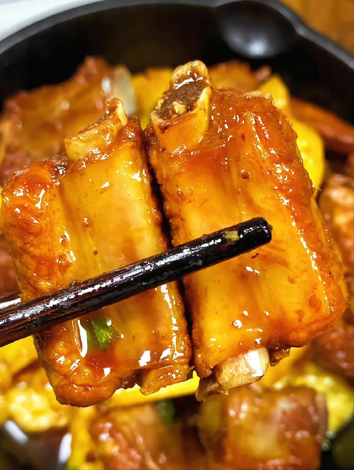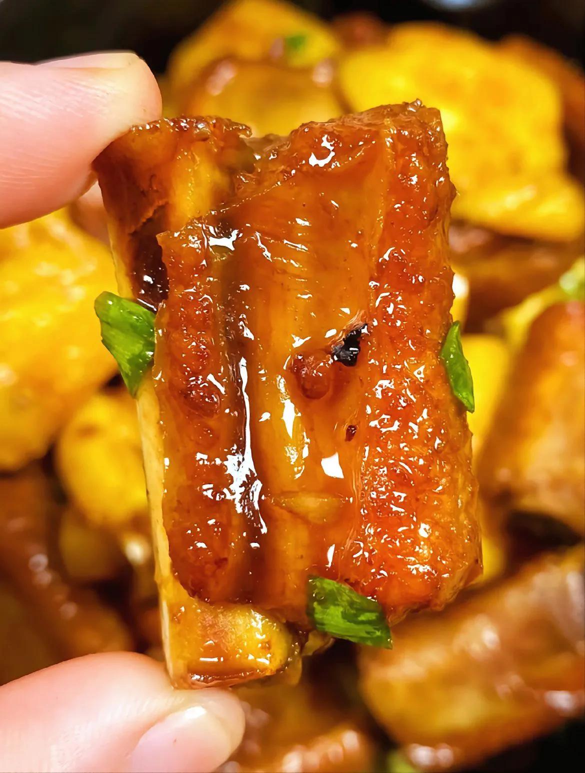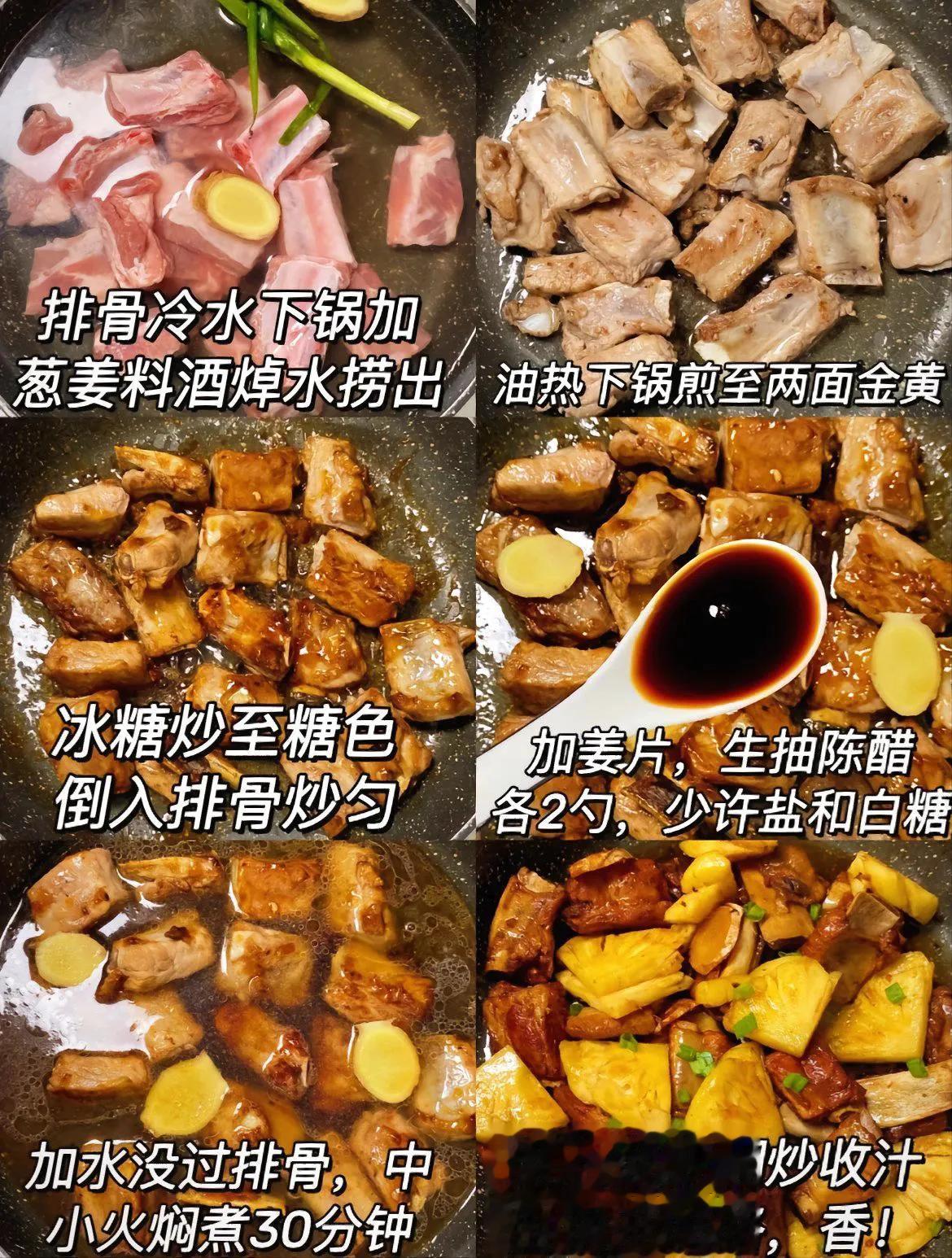 菠萝排骨真的是巨巨巨好吃呀! 排骨软烂入味加上菠萝香味真的好下饭啊! 做法: 1、排骨冷水下锅加葱姜、料酒焯水捞出,油热下锅煎至两面金黄; 2、冰糖炒至糖色,倒入排骨炒匀,加姜片、生抽、陈醋各2勺,少许盐和白糖,加水没过排骨,中小火焖煮30分钟,最后倒入菠萝翻炒收汁即可。