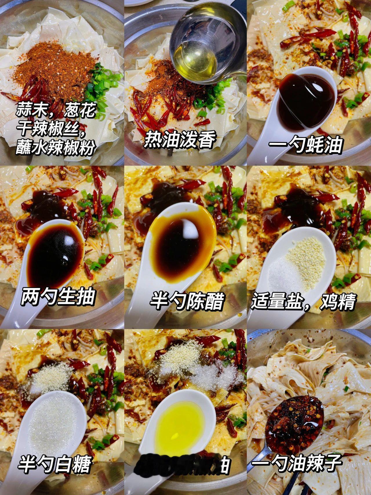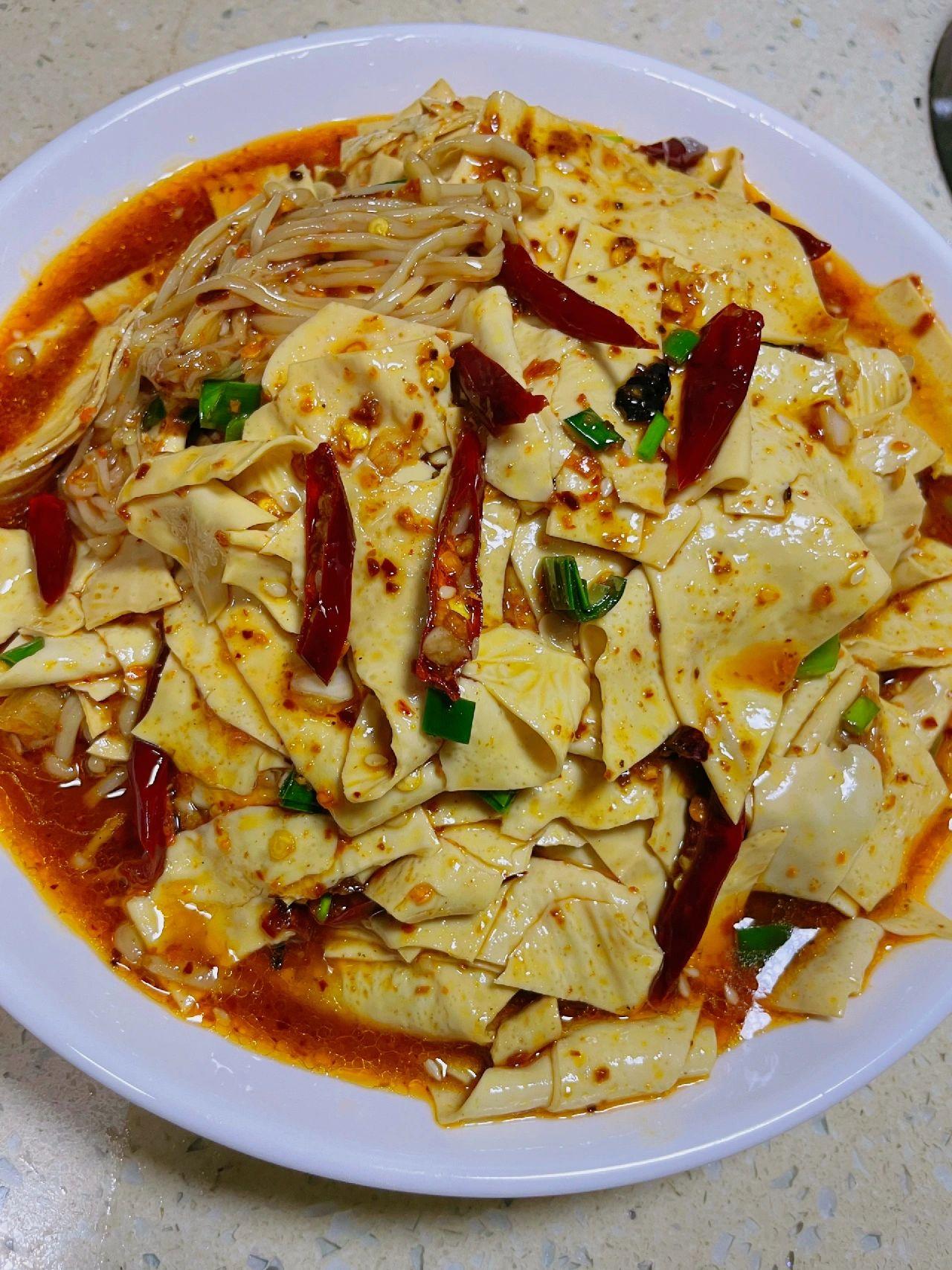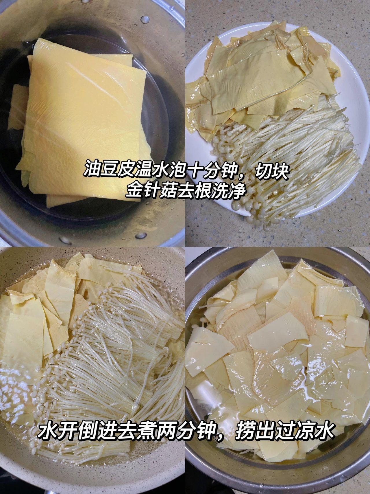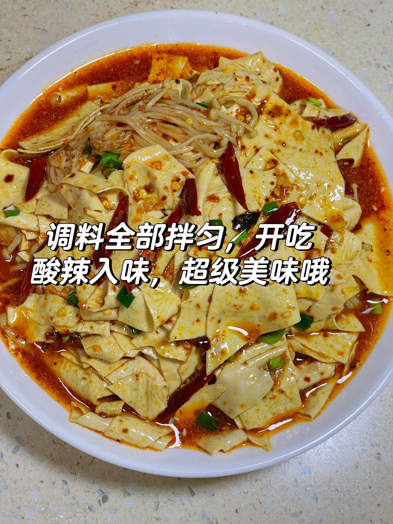 拯救没胃口~凉拌豆皮金针菇,真的太好吃啦 油豆皮不要只会涮火锅了,今天给姐妹们分享一道简单美味的夏日凉拌菜,酸辣开胃,好吃绝了……快去试试吧! 食材:油豆皮,金针菇 1、油豆皮用温水泡十分钟,切条,金针菇去根洗净 2、开水下入豆皮金针菇煮两分钟,捞出过凉水 3、沥干水,放碗中,加蒜末,葱花,干辣椒丝,辣椒面热油泼香,然后➕一勺蚝油➕两勺生抽➕少许鸡精,盐➕一勺白糖➕一勺油辣椒➕半勺陈醋➕少许藤椒油,全部拌匀即可