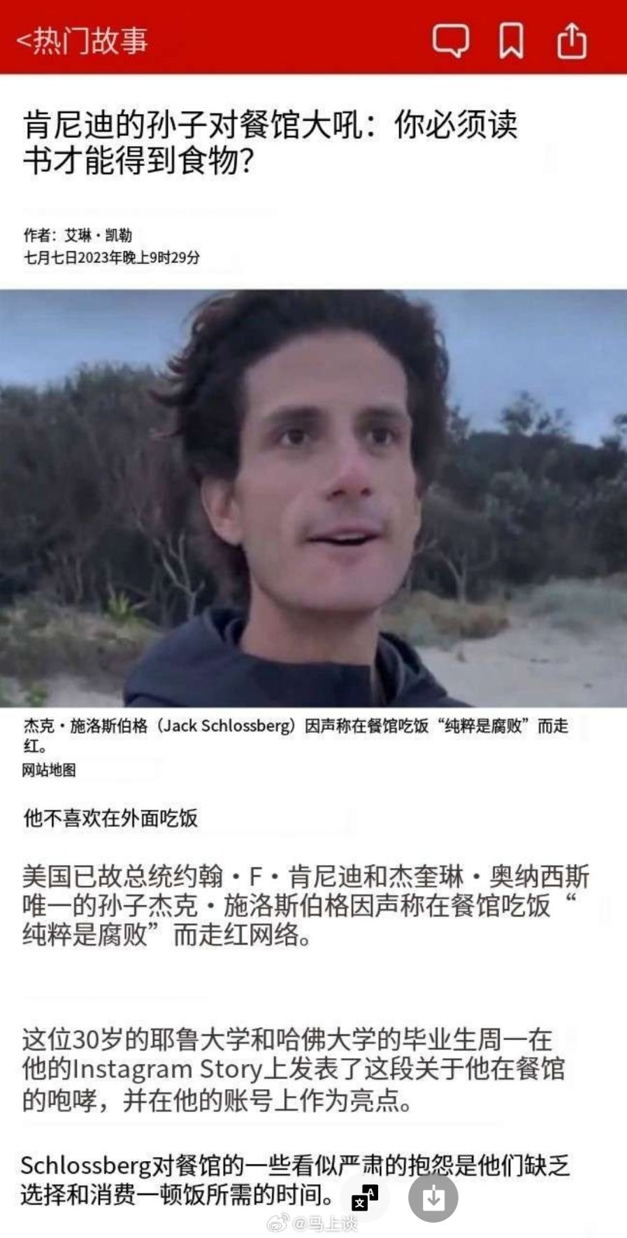 美国前总统肯尼迪唯一的孙子在推特发表反餐馆宣言!他说有生之年,他不会再踏进任何一家餐厅!我想,他也不可能自己个儿做饭,像他这样的家庭,一般都有私厨…[doge]