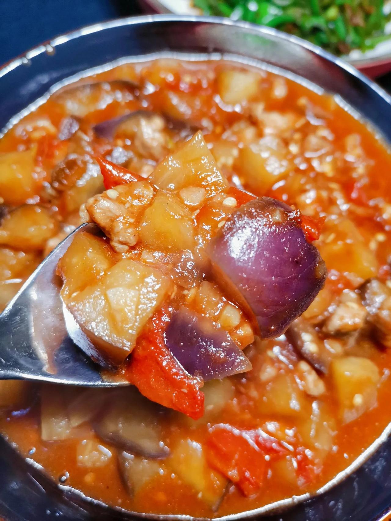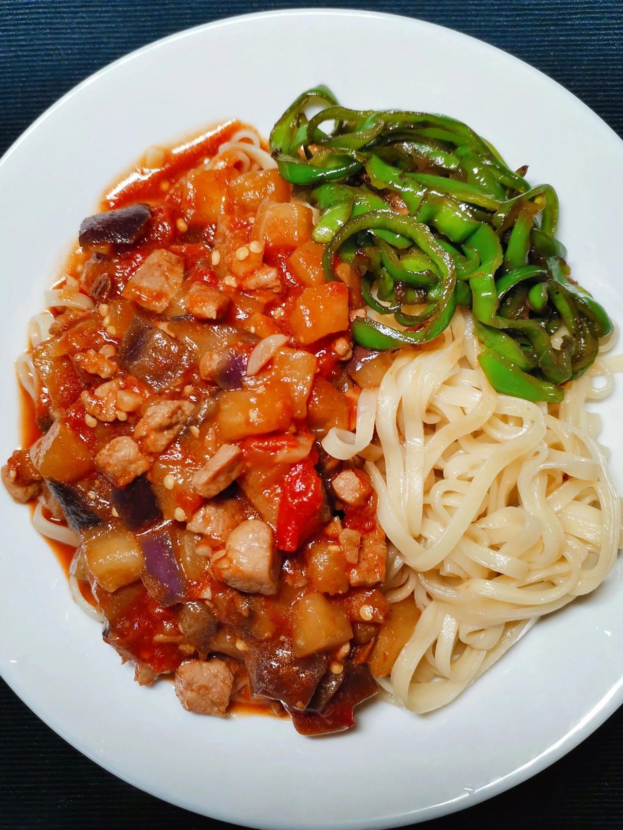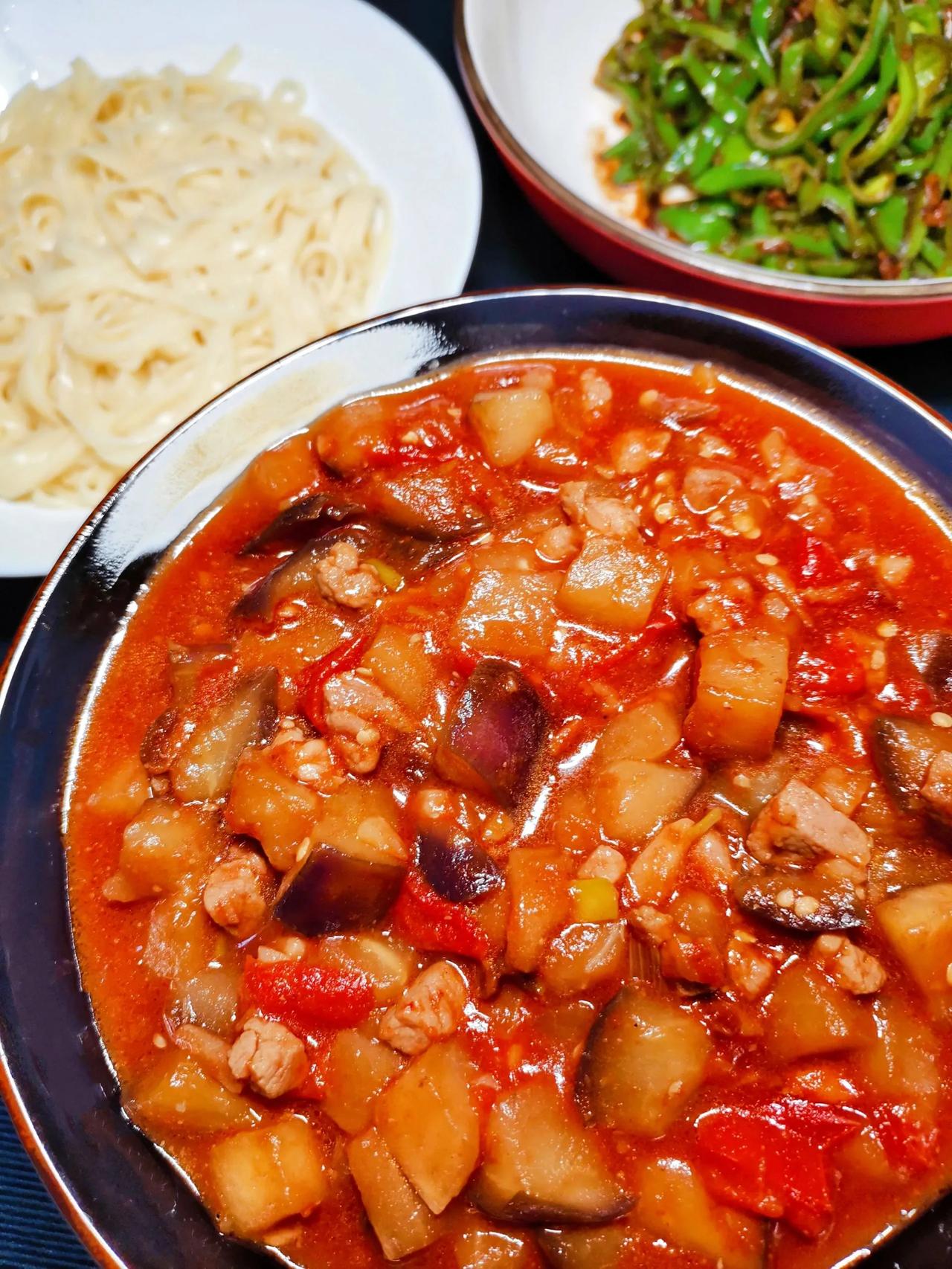 超好吃的茄子打卤面+虾皮炒青椒丝 天气比较热,特别适合吃一些爽口开胃的饭。这个茄子打卤面就特别合适,做起来简单,炖上一大锅卤,煮点面条,全家的晚饭很快就搞定了。再搭配一个虾皮炒青椒丝拌面,简直太美味了。 茄子卤做法:1、圆茄子一个,切成小块,放一勺盐,沙出水分,挤干水分 2、西红柿切块、肉切丁、蒜切成蒜末 3、锅中放油,放入葱姜肉丁,炒至肉丁变色,烹入料酒,加入西红柿丁继续翻炒至西红柿软烂,加入与食材平齐的水 4、放入3勺酱油、2勺蚝油、半勺白糖、1勺黄豆酱、适量盐,拌匀,煮至剩一半汤汁即可 虾皮青椒做法:青椒切丝,锅中放油,放一小把虾皮爆香,放入青椒,一勺酱油炒匀即可