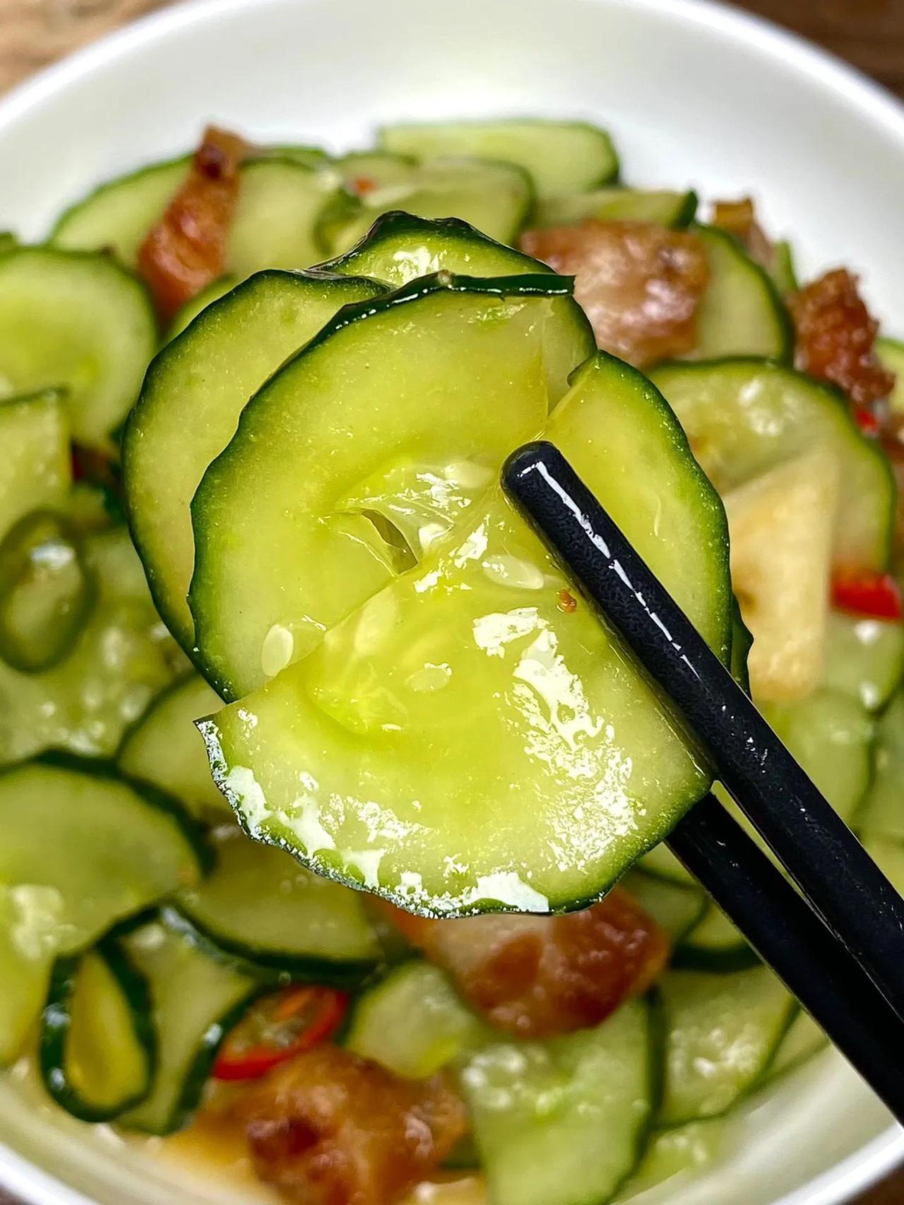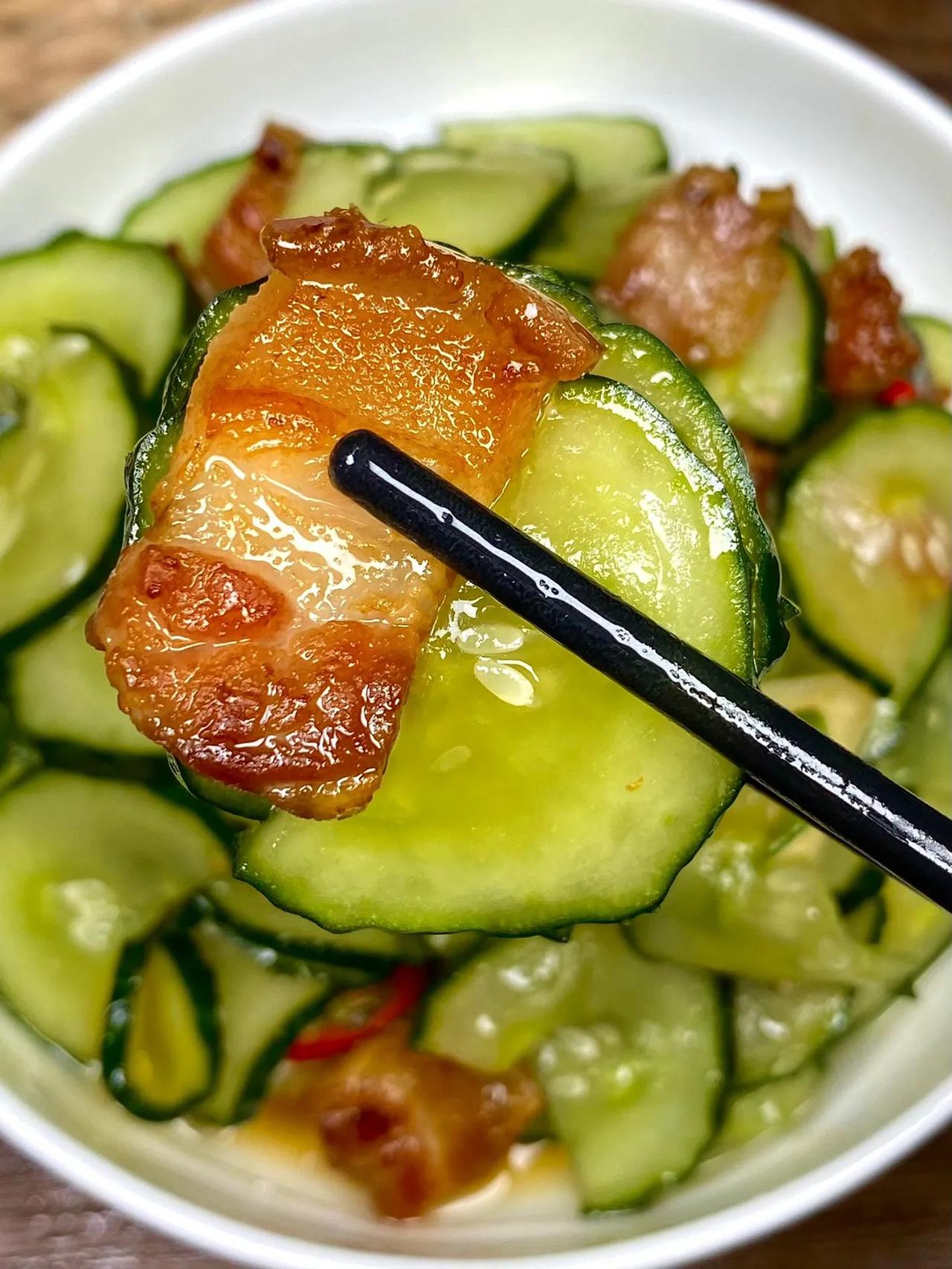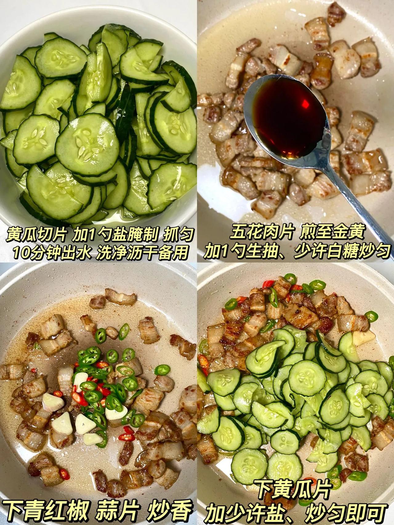 黄瓜炒肉就像我这样做,脆嫩爽口也太下饭了~ 做法: 1、黄瓜切片加1勺盐腌制10分钟,抓匀出水,再洗净沥干备用; 2、五花肉片煎至金黄 ,加1勺生抽、少许白糖炒匀,下青红椒、蒜片炒香; 3、下黄瓜片,加少许盐、炒匀即可。