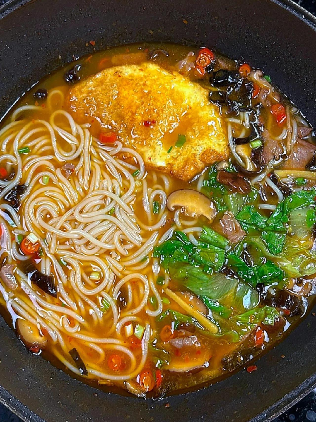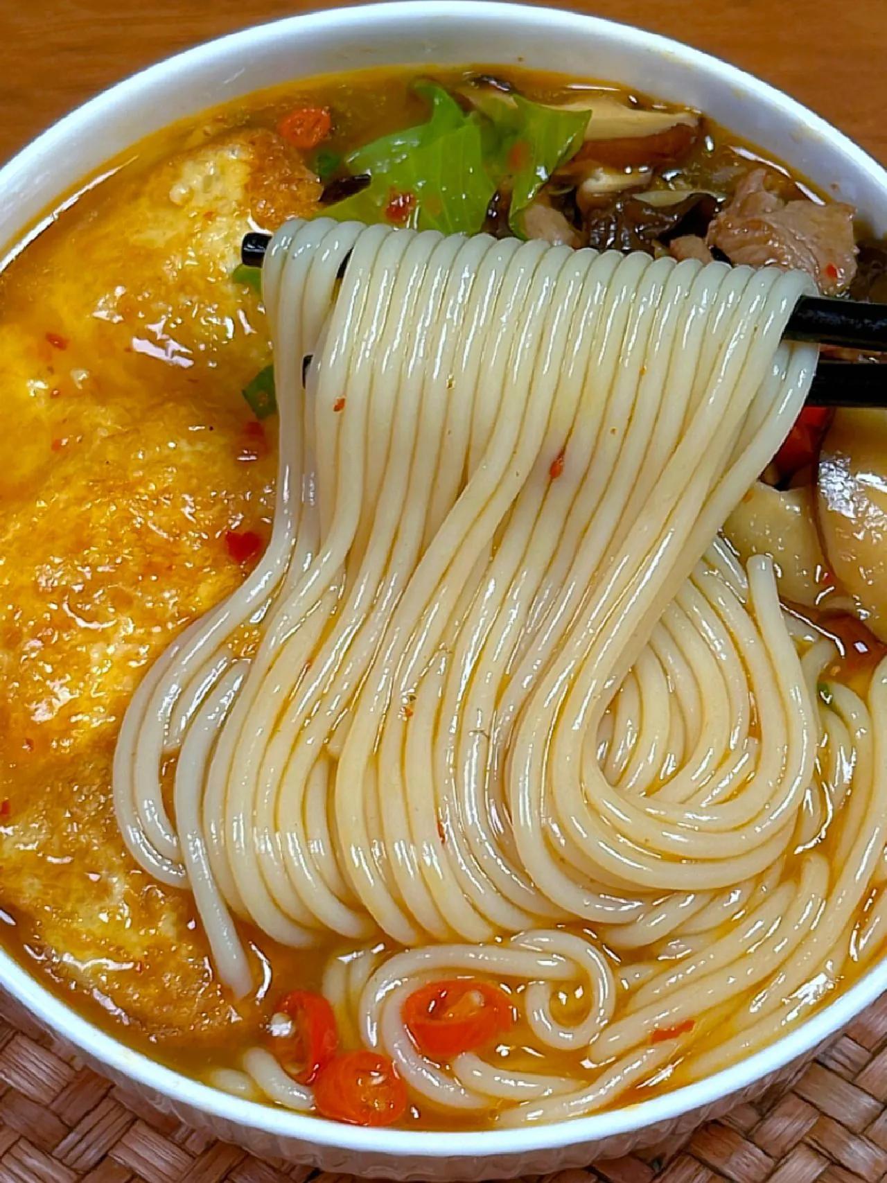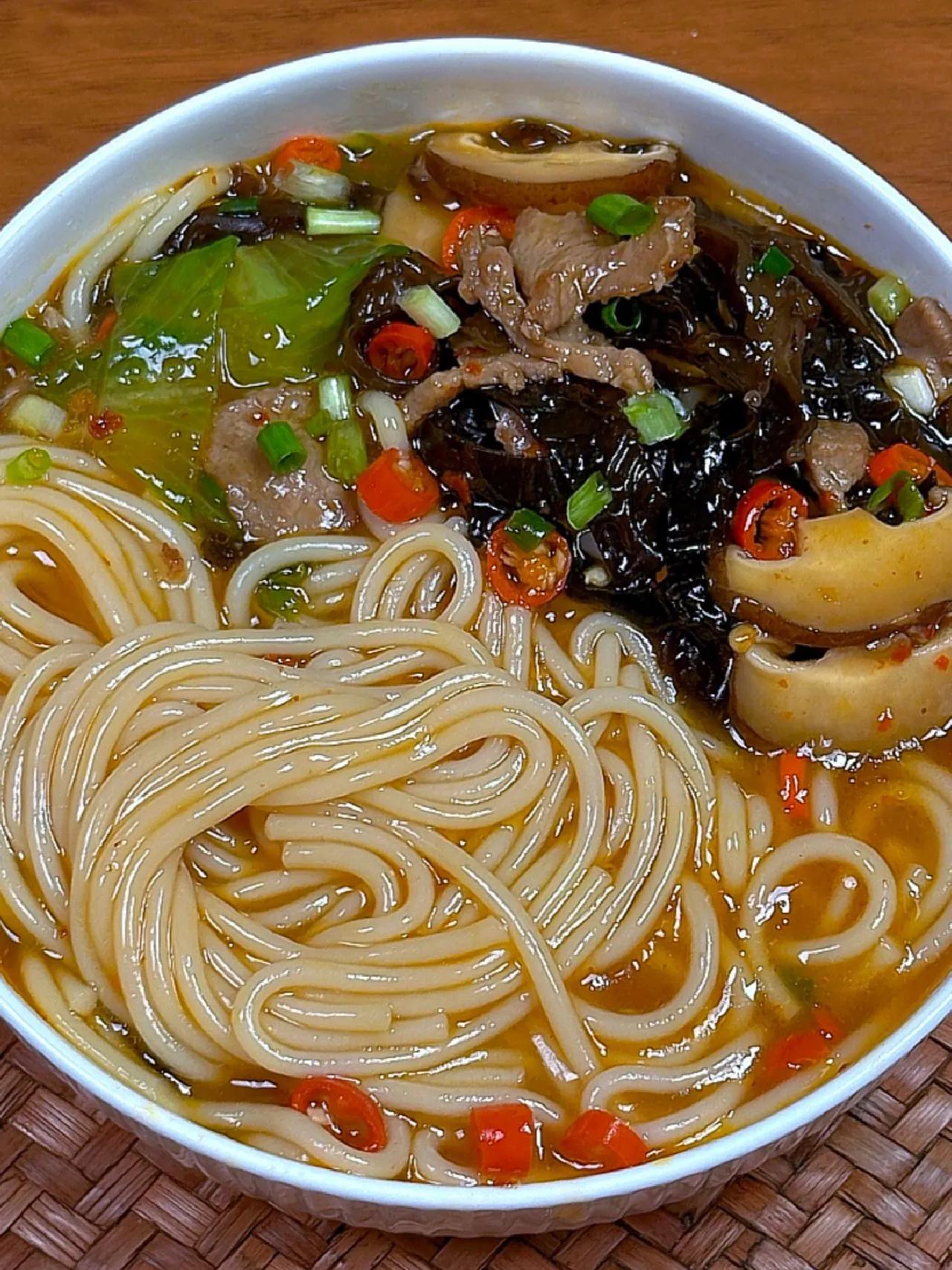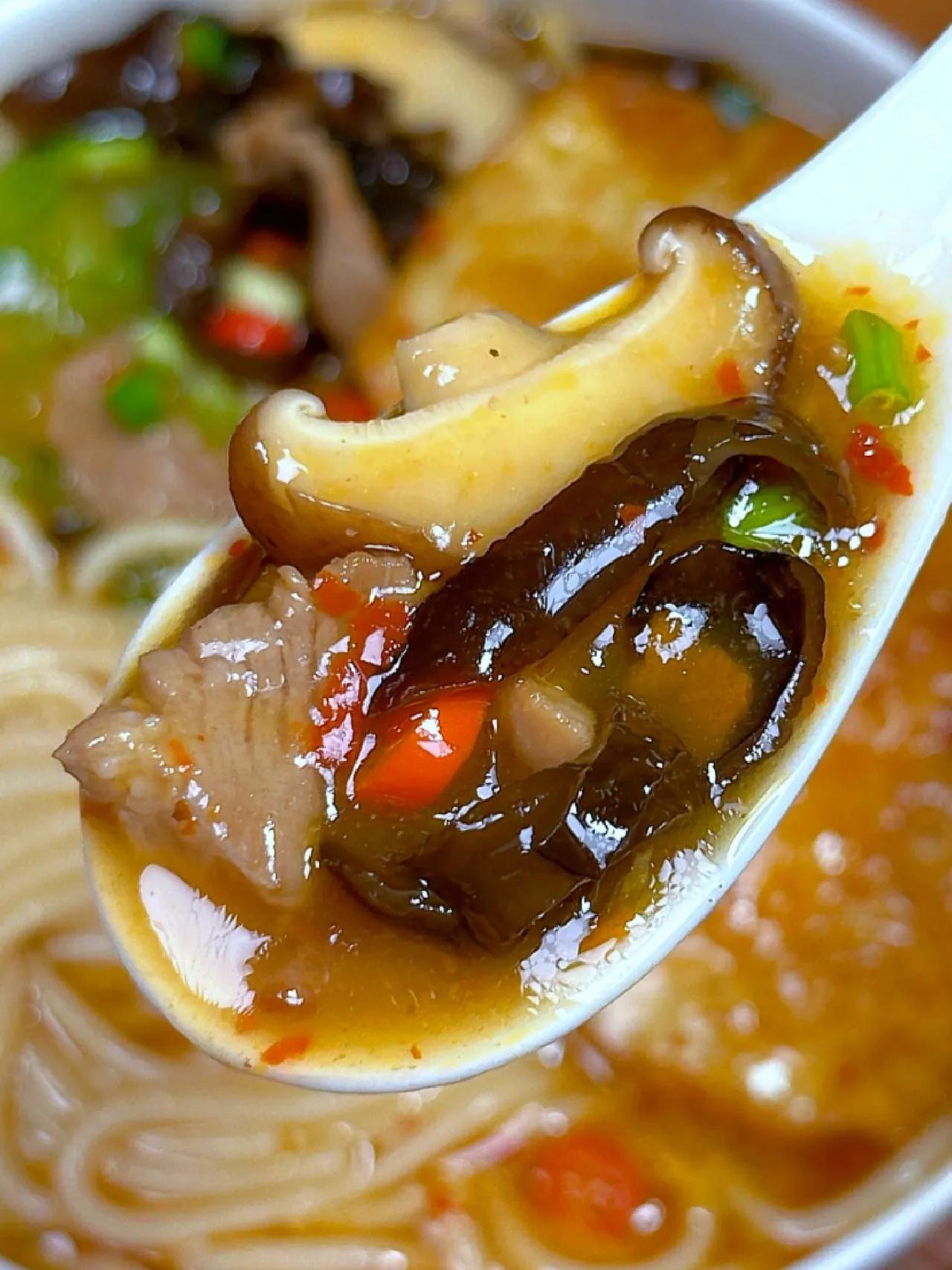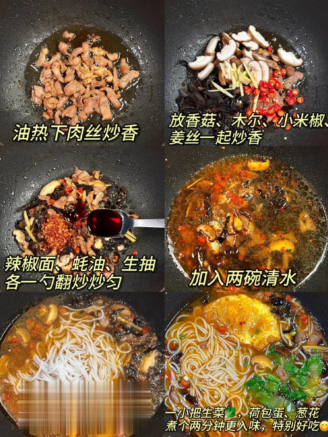 湖南人早餐必不可少的汤米粉! 做法: 1、油热下肉丝炒香,放香菇、木耳、小米椒、姜丝一起炒香; 2、放入辣椒面、蚝油、生抽各一勺翻炒炒匀,加入两碗清水 ; 3、煮开后下入米粉、一小把生菜、荷包蛋、葱花,煮个两分钟即可。