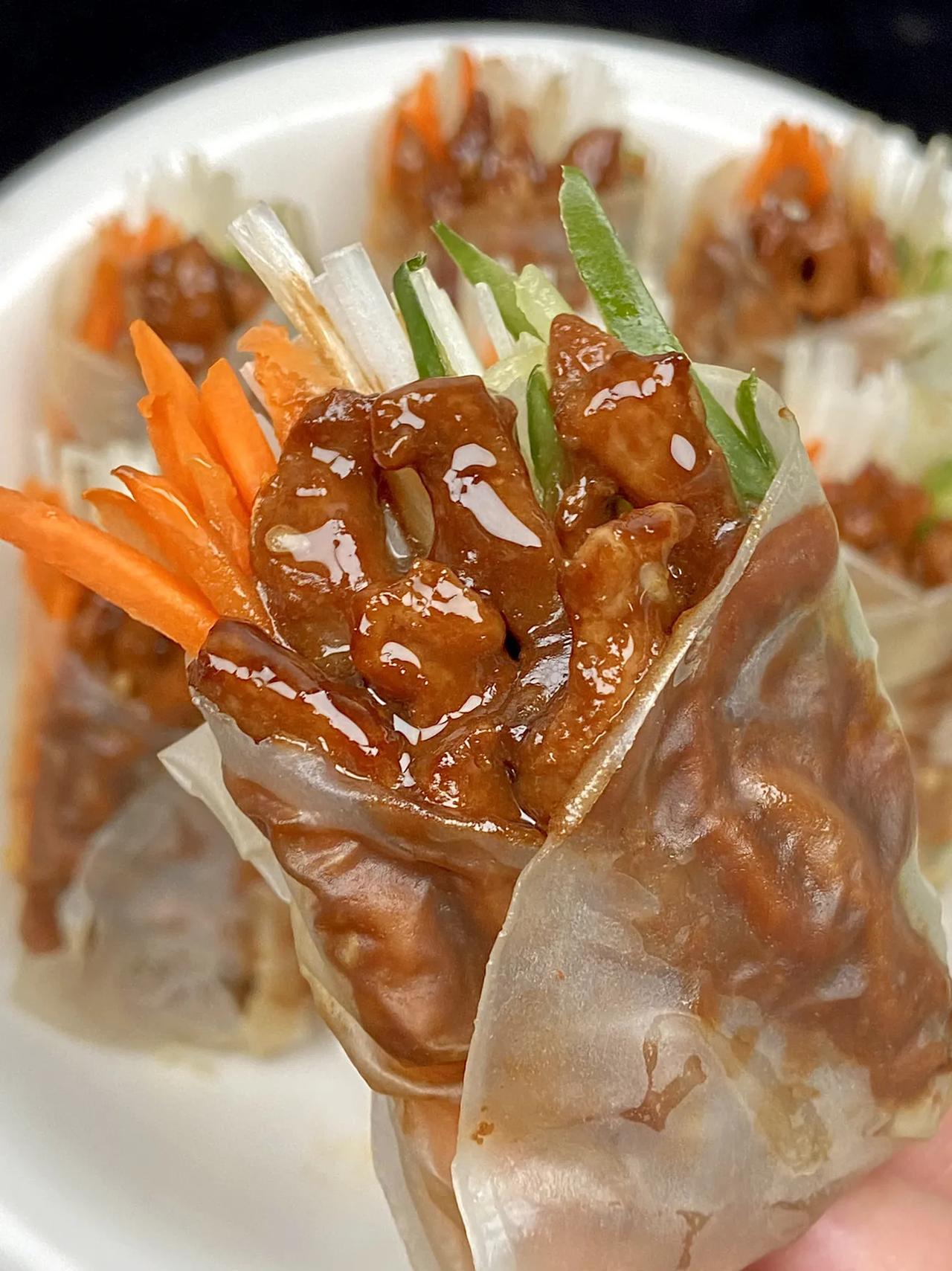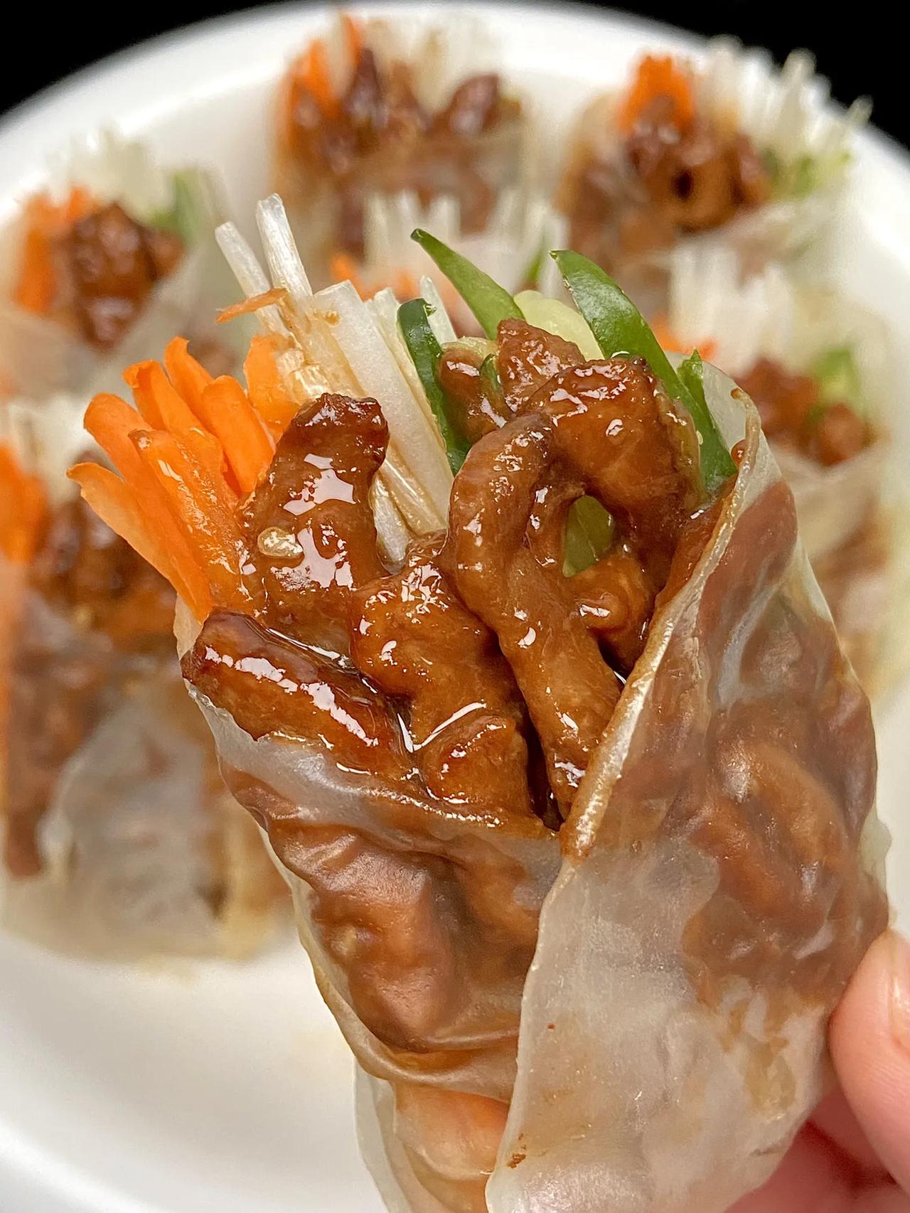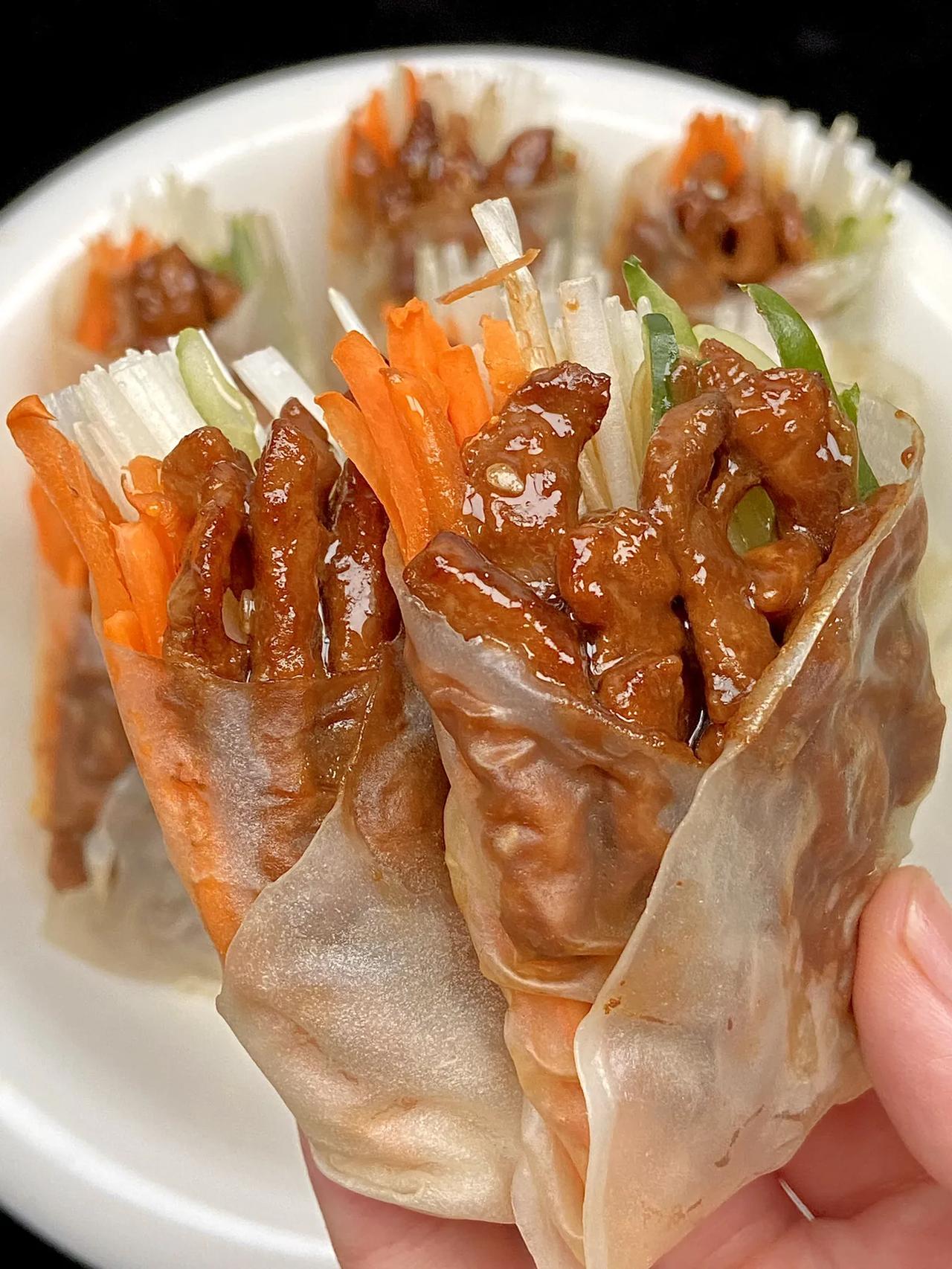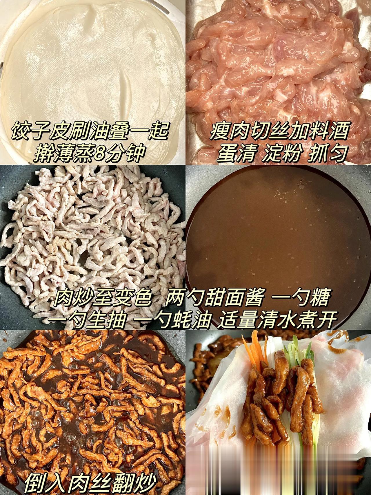 难怪北京人爱吃,真的巨好吃!惊呆了! 京酱肉丝卷皮薄馅多~裹着肉丝和配菜绝了酱汁浓郁、和外面一个味啊! 下做法: 1、饺子皮刷油叠一起擀薄蒸8分钟; 2、瘦肉切丝加料酒、蛋清、淀粉抓匀; 3、肉炒至变色盛出备用; 4、锅中放入两勺甜面酱、一勺糖、一勺生抽、一勺蚝油、适量清水煮开,倒入肉丝翻炒; 5、胡萝卜、大葱黄瓜切丝包起来即可。