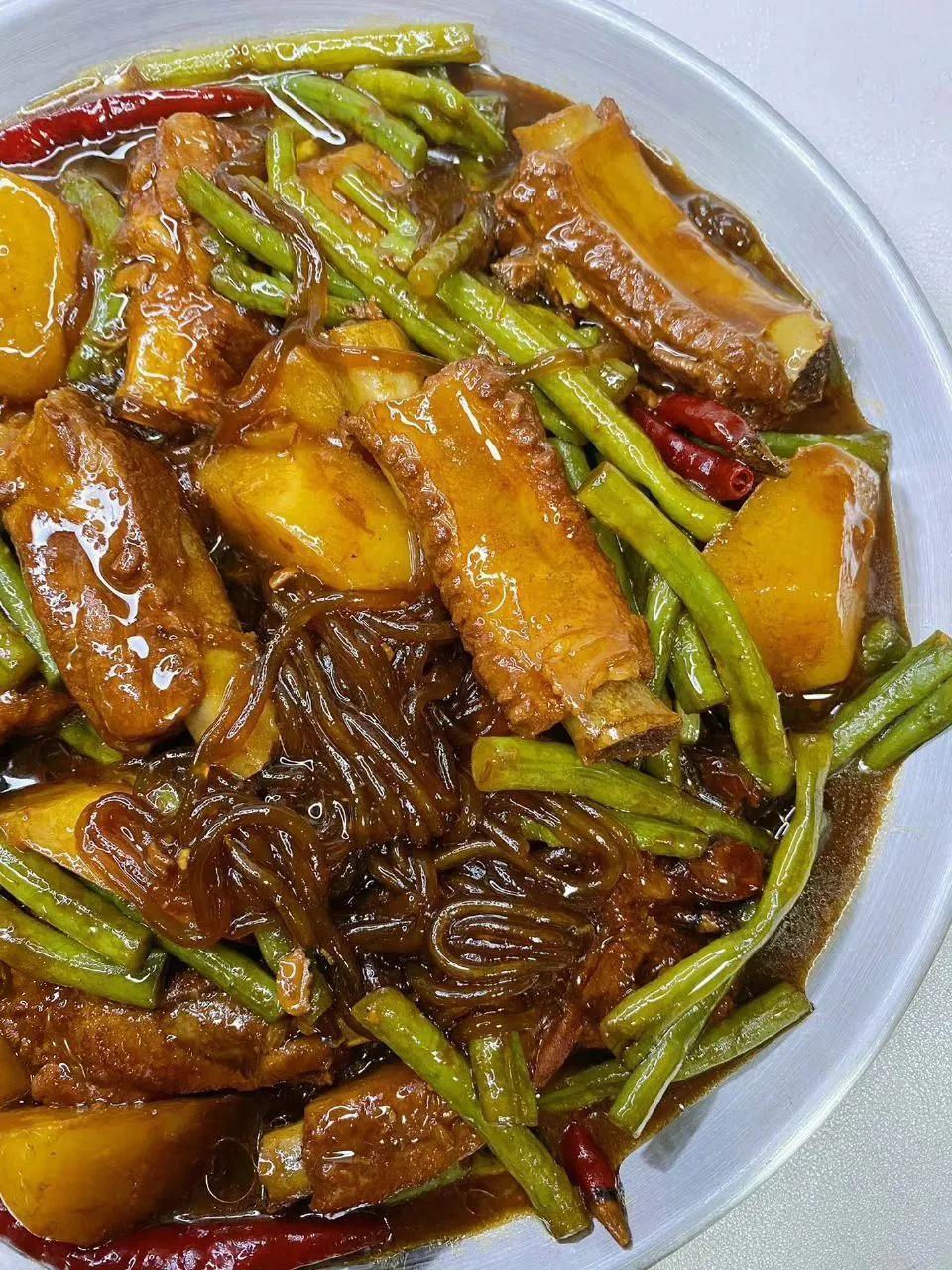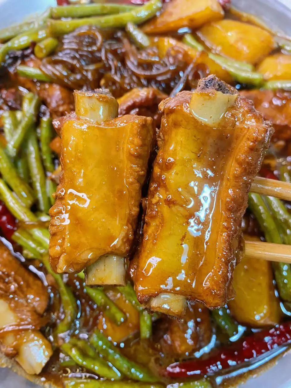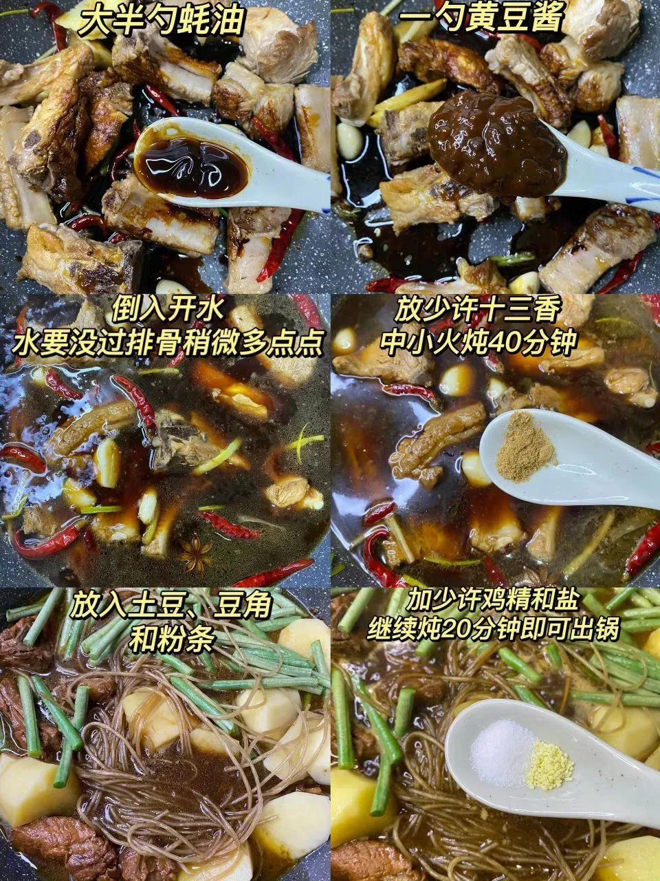 好家伙给我香迷糊了!!这个乱炖也太好吃了!! 隔三差五就想来一锅这个土豆豆角炖粉条,拿排骨炖的实在是老香了!!粉条比肉还好吃那种~ 做法: 1、排骨冷水下锅,放葱姜和料酒焯水; 2、锅中倒入适量油,油热下入几粒冰糖,小火炒出糖色; 3、下入焯好水的排骨翻炒上色,再放入葱姜蒜、八角和干红辣椒炒香,放一勺料酒、两勺生抽、一勺老抽、大半勺蚝油、一勺黄豆酱,倒入开水(水要没过排骨稍微多点点) ; 4、放少许十三香,中小火炖40分钟,放入土豆、豆角和粉条,加少许鸡精和盐,继续炖20分钟即可。