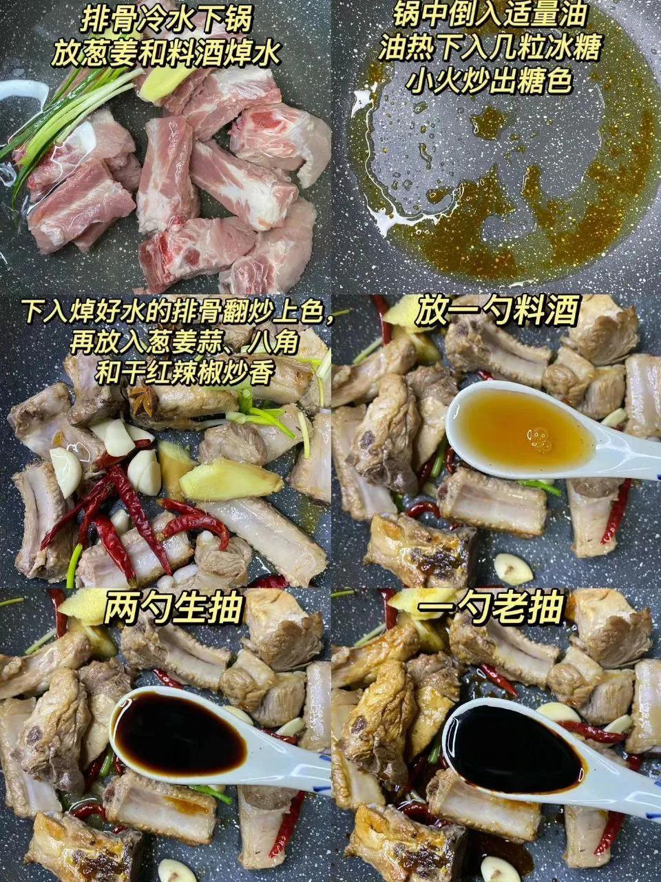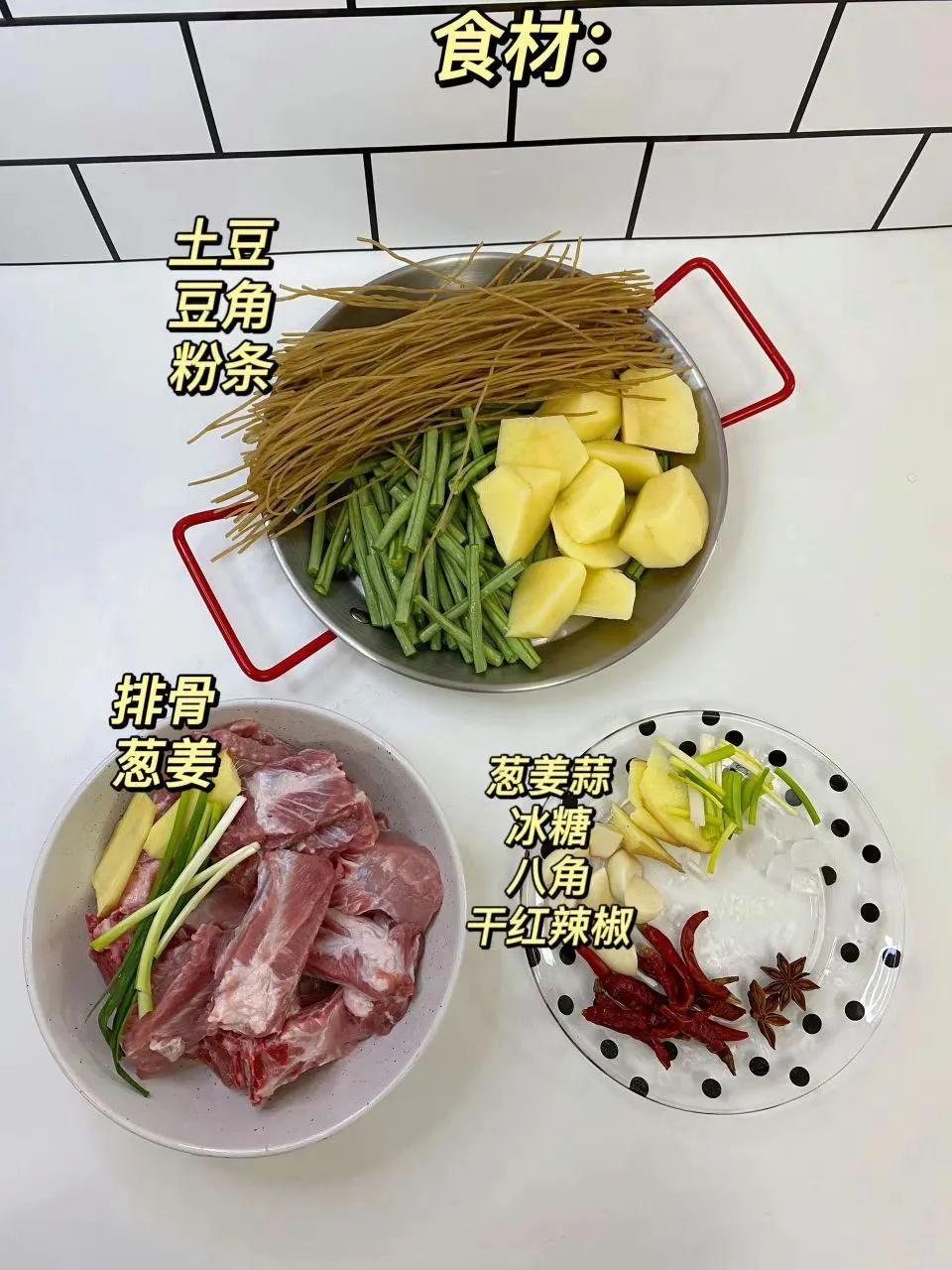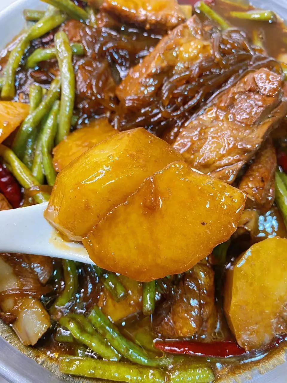 好家伙给我香迷糊了!!这个乱炖也太好吃了!! 隔三差五就想来一锅这个土豆豆角炖粉条,拿排骨炖的实在是老香了!!粉条比肉还好吃那种~ 做法: 1、排骨冷水下锅,放葱姜和料酒焯水; 2、锅中倒入适量油,油热下入几粒冰糖,小火炒出糖色; 3、下入焯好水的排骨翻炒上色,再放入葱姜蒜、八角和干红辣椒炒香,放一勺料酒、两勺生抽、一勺老抽、大半勺蚝油、一勺黄豆酱,倒入开水(水要没过排骨稍微多点点) ; 4、放少许十三香,中小火炖40分钟,放入土豆、豆角和粉条,加少许鸡精和盐,继续炖20分钟即可。