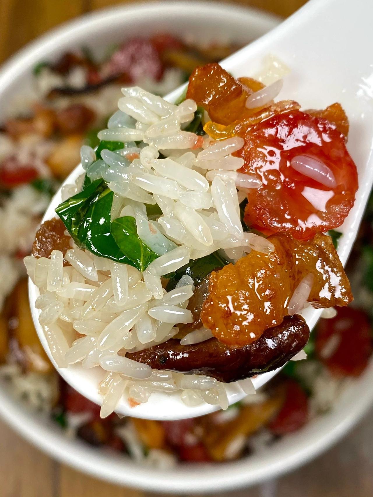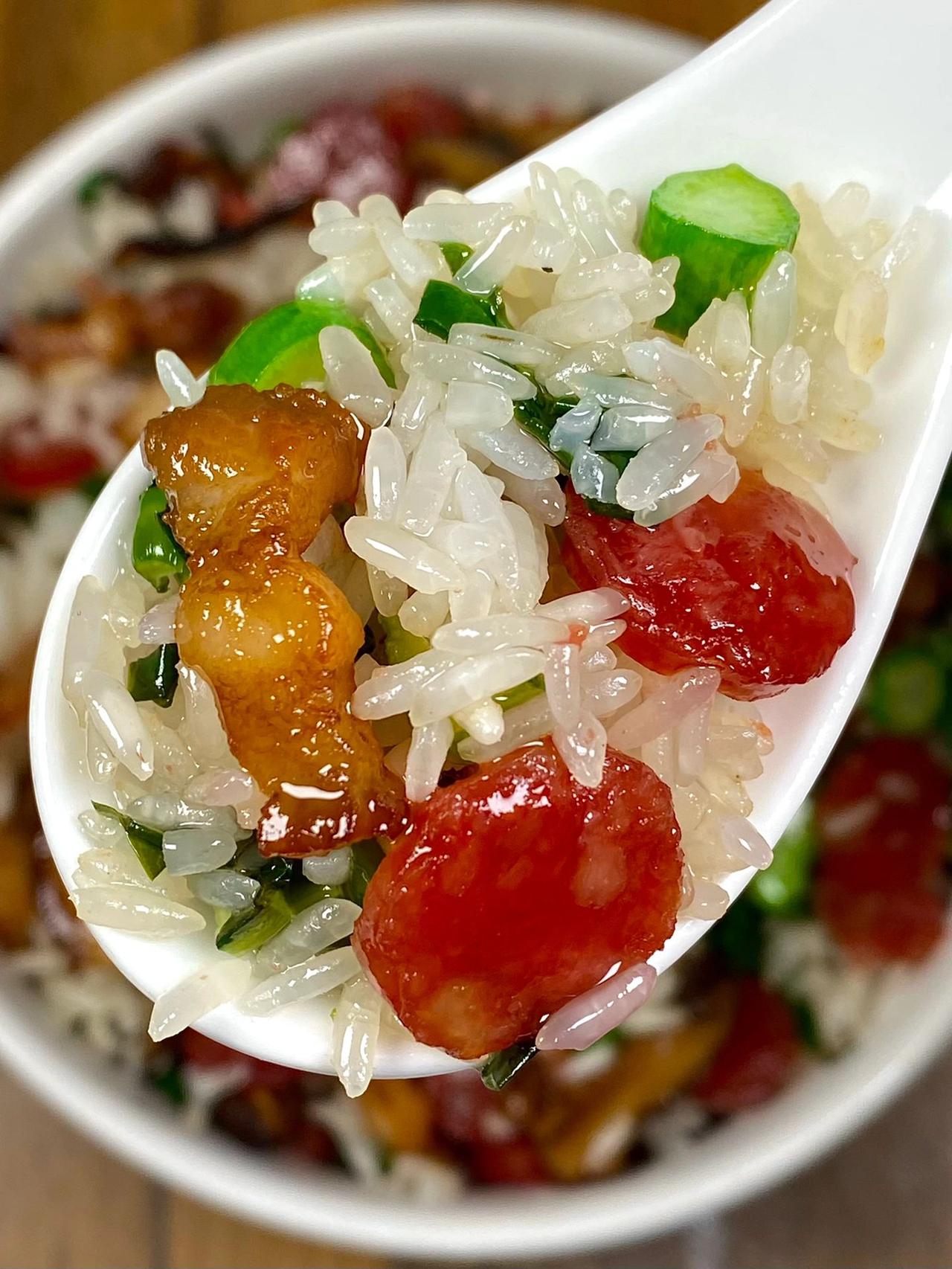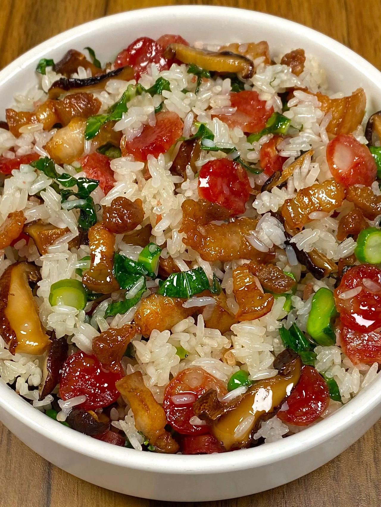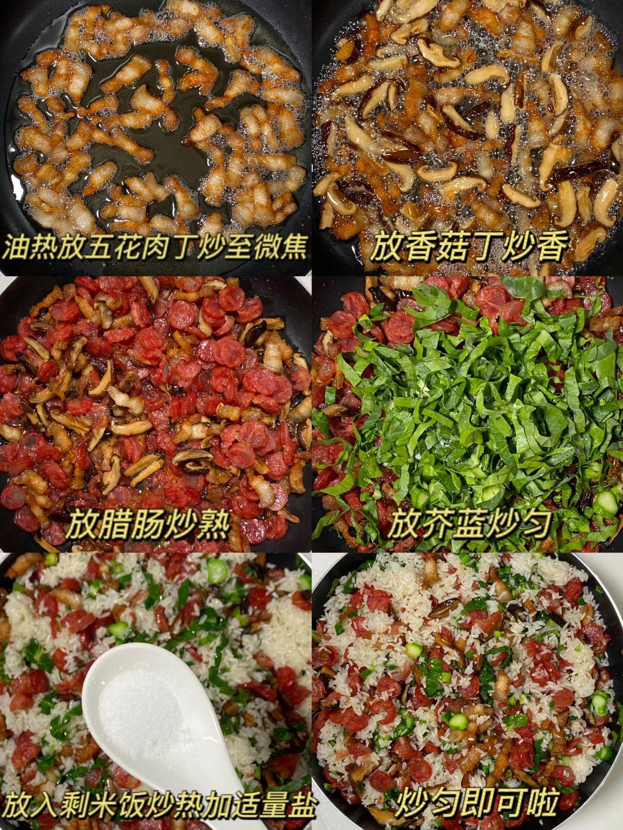 我妈做的菜饭!真的巨巨巨好吃!!! 今天吃我妈做的菜饭;是香菇腊肠芥蓝炒饭哦,真的巨好吃,焦香的五花肉丝、还有我爱的腊肠和香菇 料比米饭还要多;大家快去试试吧,我先吃啦 食材:五花肉、干香菇、腊肠、芥蓝、剩米饭 做法:1、干香菇泡水提前备用,五花肉切成丁,油热放五花肉丁炒至微焦,加泡发的香菇丁炒熟 2、放腊肠炒熟,放芥蓝炒匀,放剩米饭炒热,加适量盐炒匀即可啦