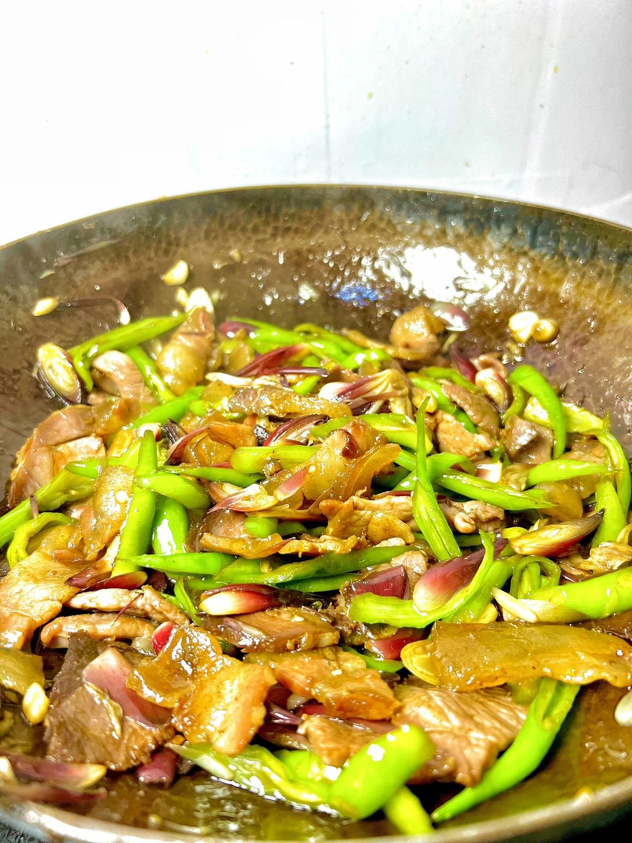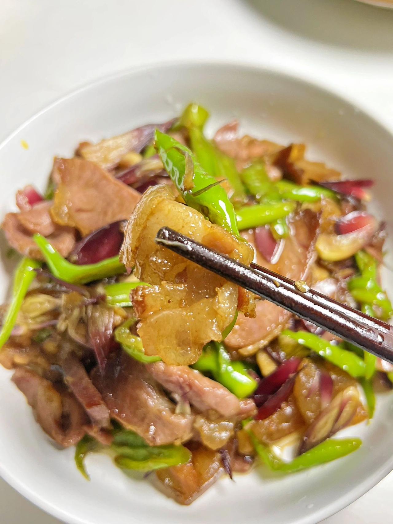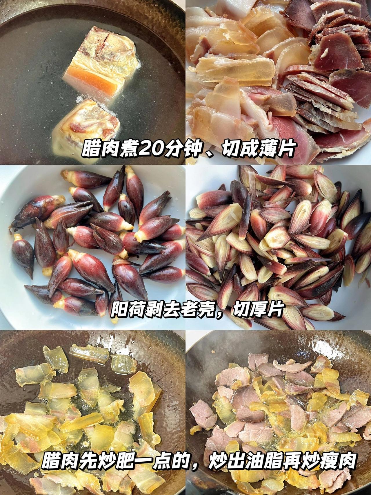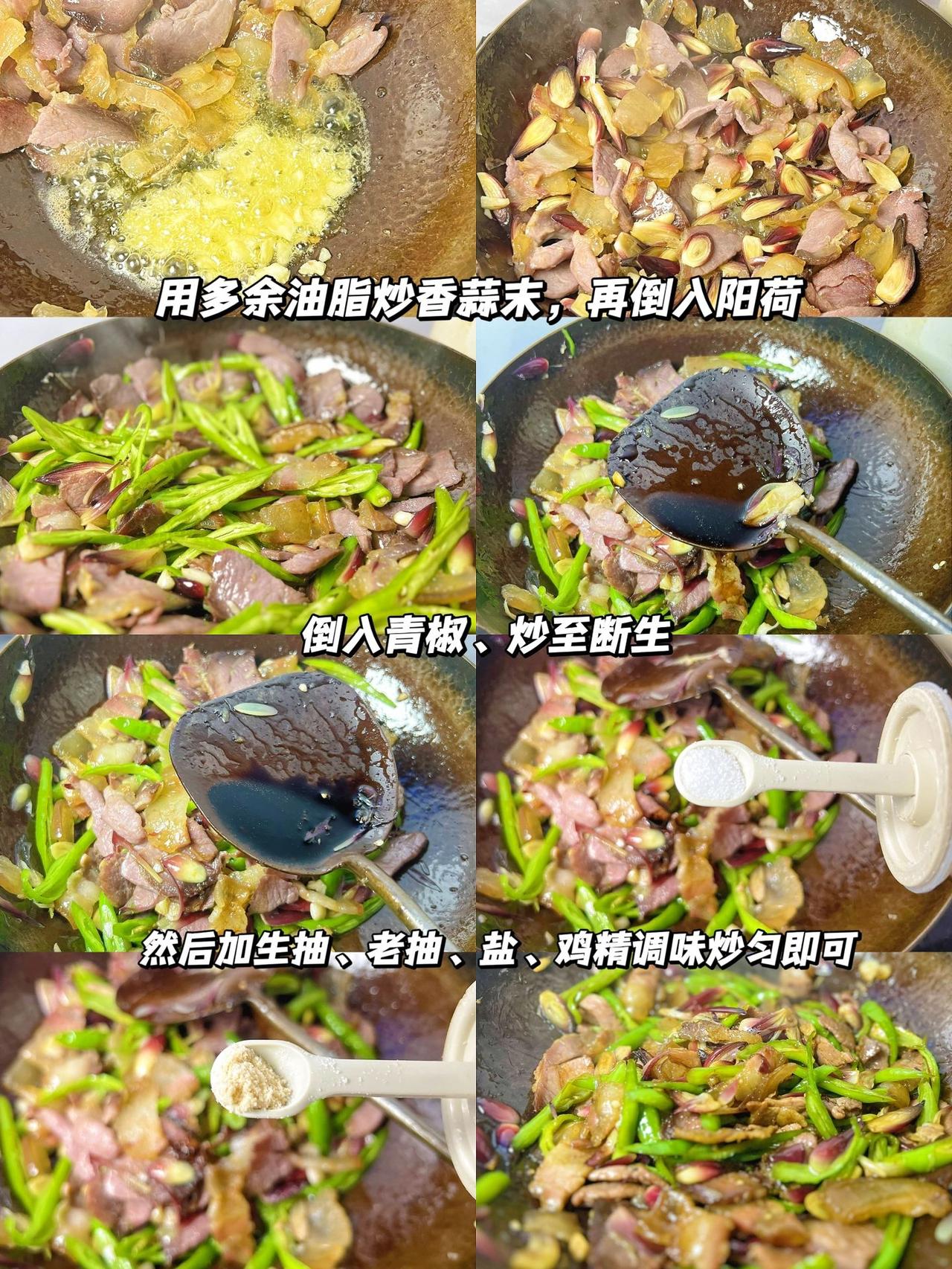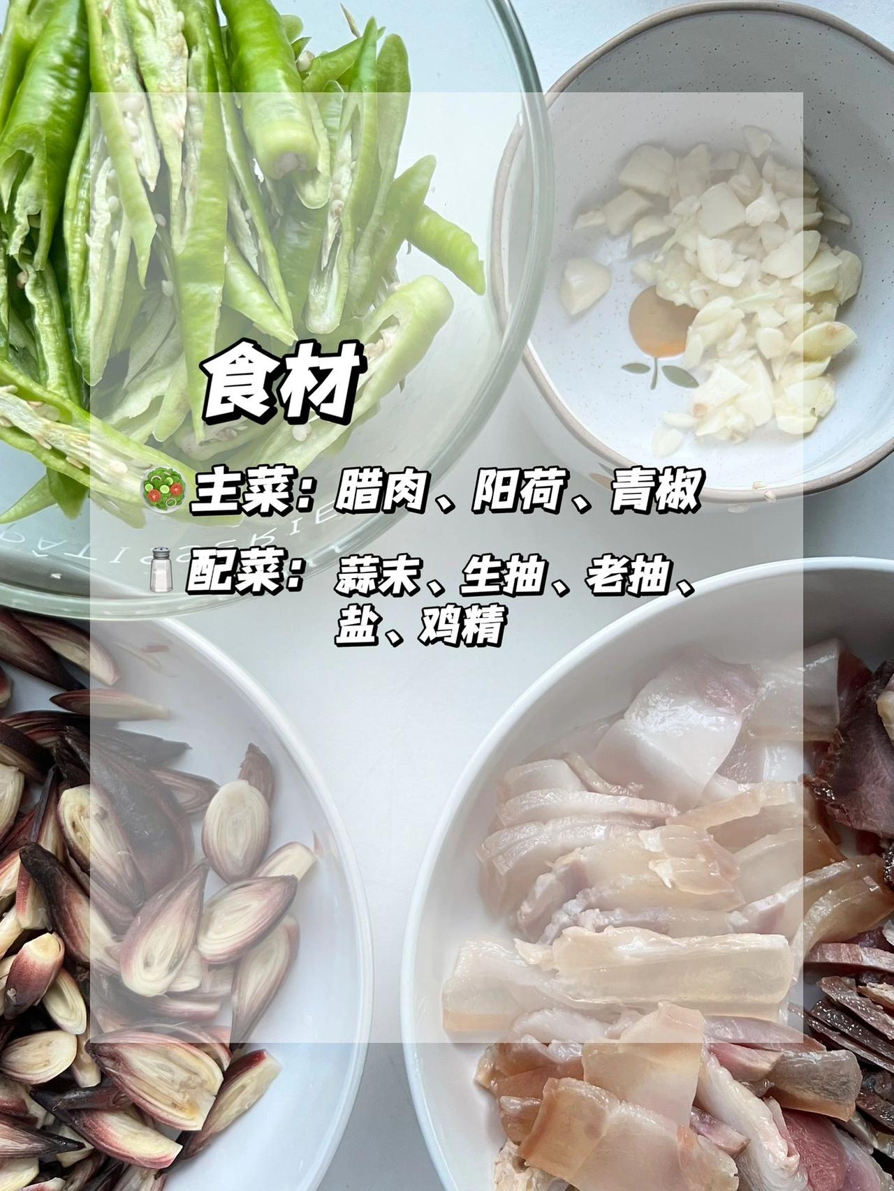 吃过这道菜的都是80/90后吧 小时候经常吃这道菜,小时候不喜欢吃,长大后反而很回味 食材:腊肉、青椒、阳荷、蒜末、生抽、老抽、盐、鸡精 教程:1、把腊肉清洗干净后,煮20分钟,然后切成薄片备用; 青椒切斜刀,切成长条;阳荷剥去外面一层厚壳,切成厚一点片。 2、把腊肉的肥肉先炒出油脂,再倒入瘦肉炒;倒入蒜末炒香、先后倒入阳荷和青椒炒断生。 3、加生抽、老抽、盐、鸡精调味即可。 腊肉煮一下炒的时候皮和瘦肉不会很硬难嚼。 辣一点的那种辣椒更香。