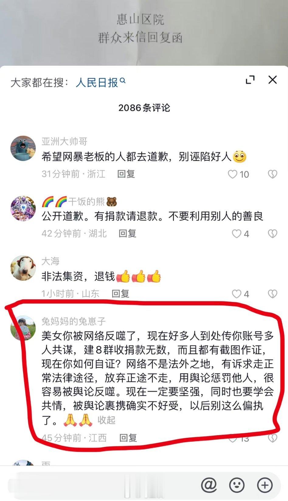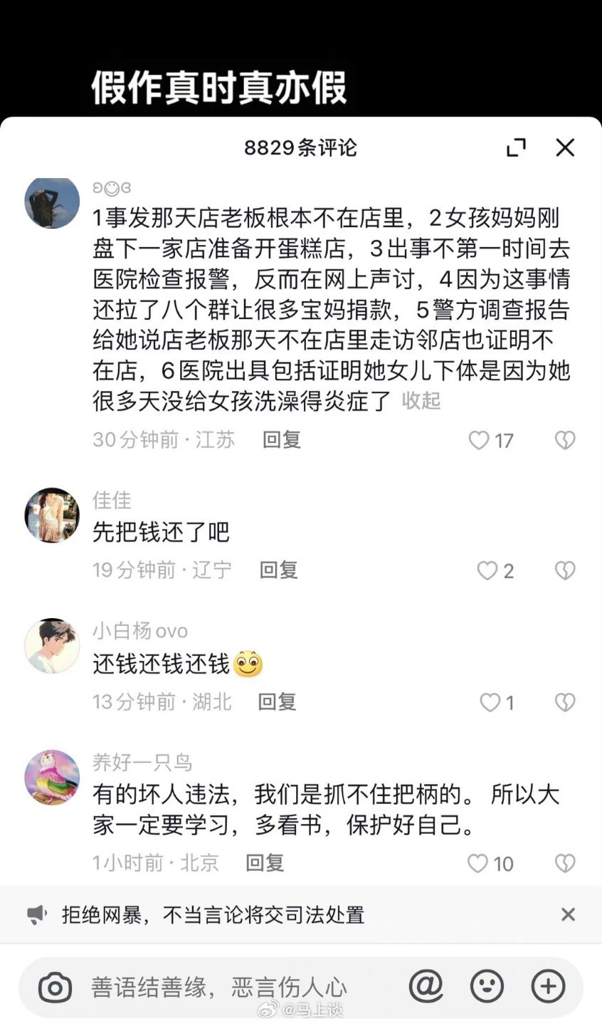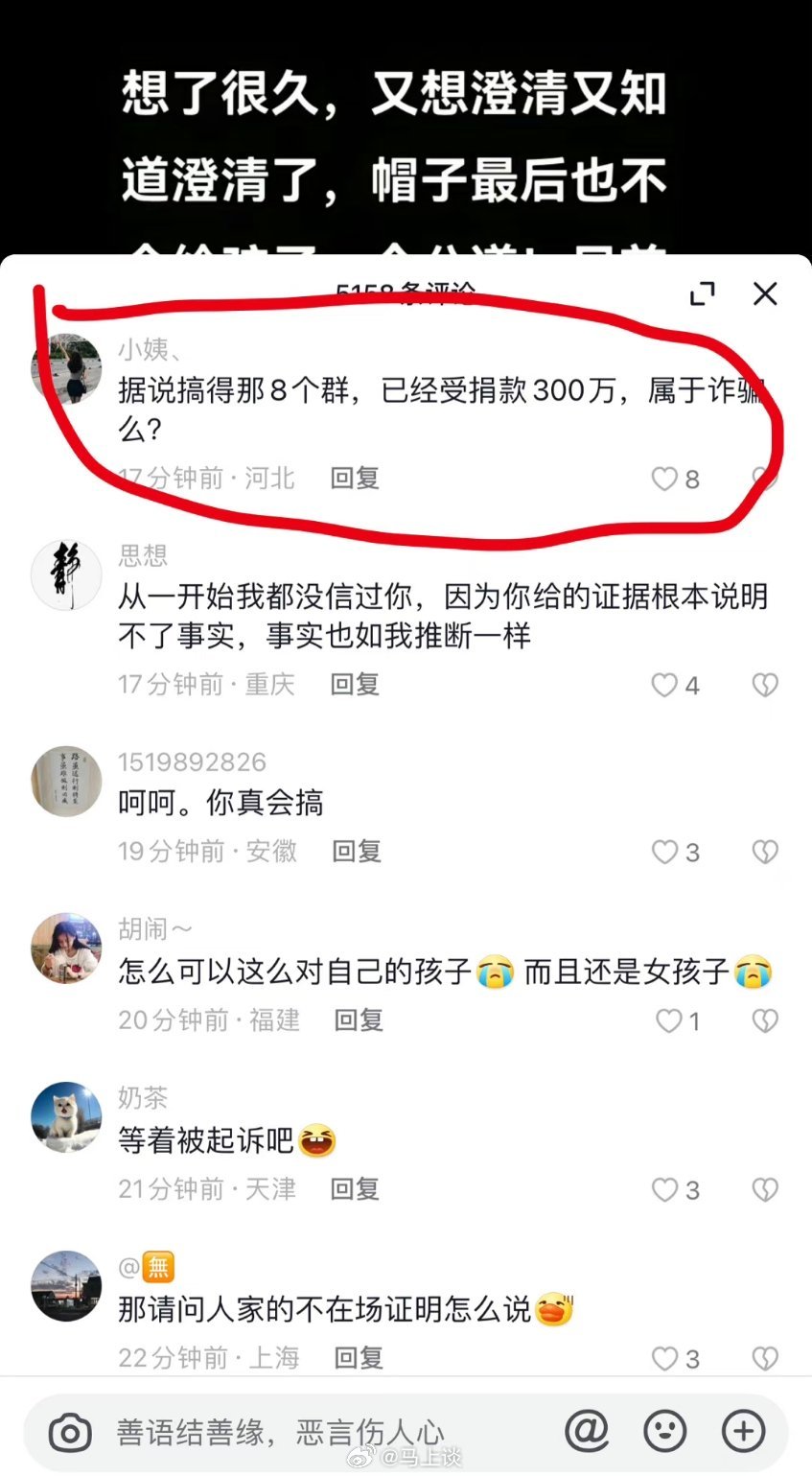 #无锡3岁女童事件网友要求退还捐款# 无锡女童事件,已经不是蛋糕店老板告不告女子的事情了,而是可能涉及到了诈捐诈骗。女童妈妈建了多个群,放出账号接受捐款,网友称单单自己弟弟捐了16万,现在都在她账号下面要求退钱……这是让我说的话,退啥钱?这是智商税!比如,你们捐给万亩林场孙国友的钱退了吗?[二哈][二哈][二哈]