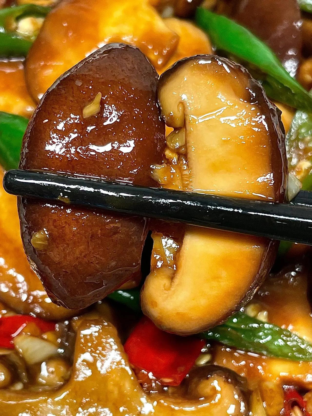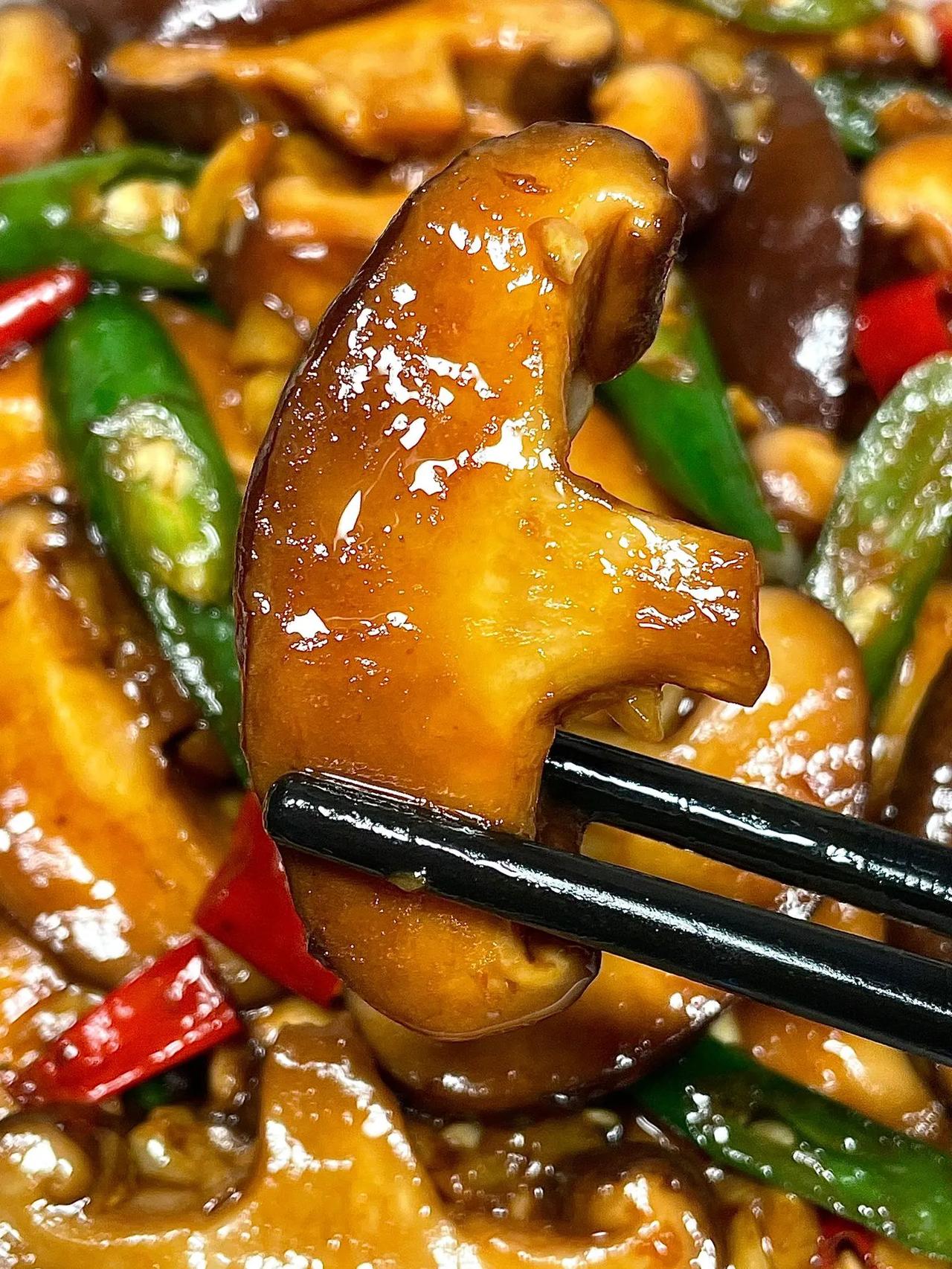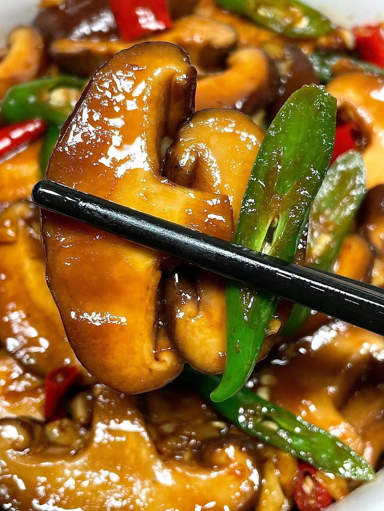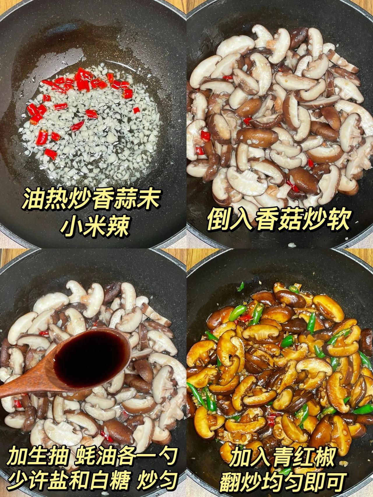 这是我家饭桌上经常出现的素炒香菇,香辣下饭,拿肉都不换! 做法: 1、油热炒香蒜末、小米辣,再倒入香菇炒软 ,加一勺生抽、一勺蚝油、少许盐、白糖炒匀; 2、加入青红椒翻炒均匀即可。