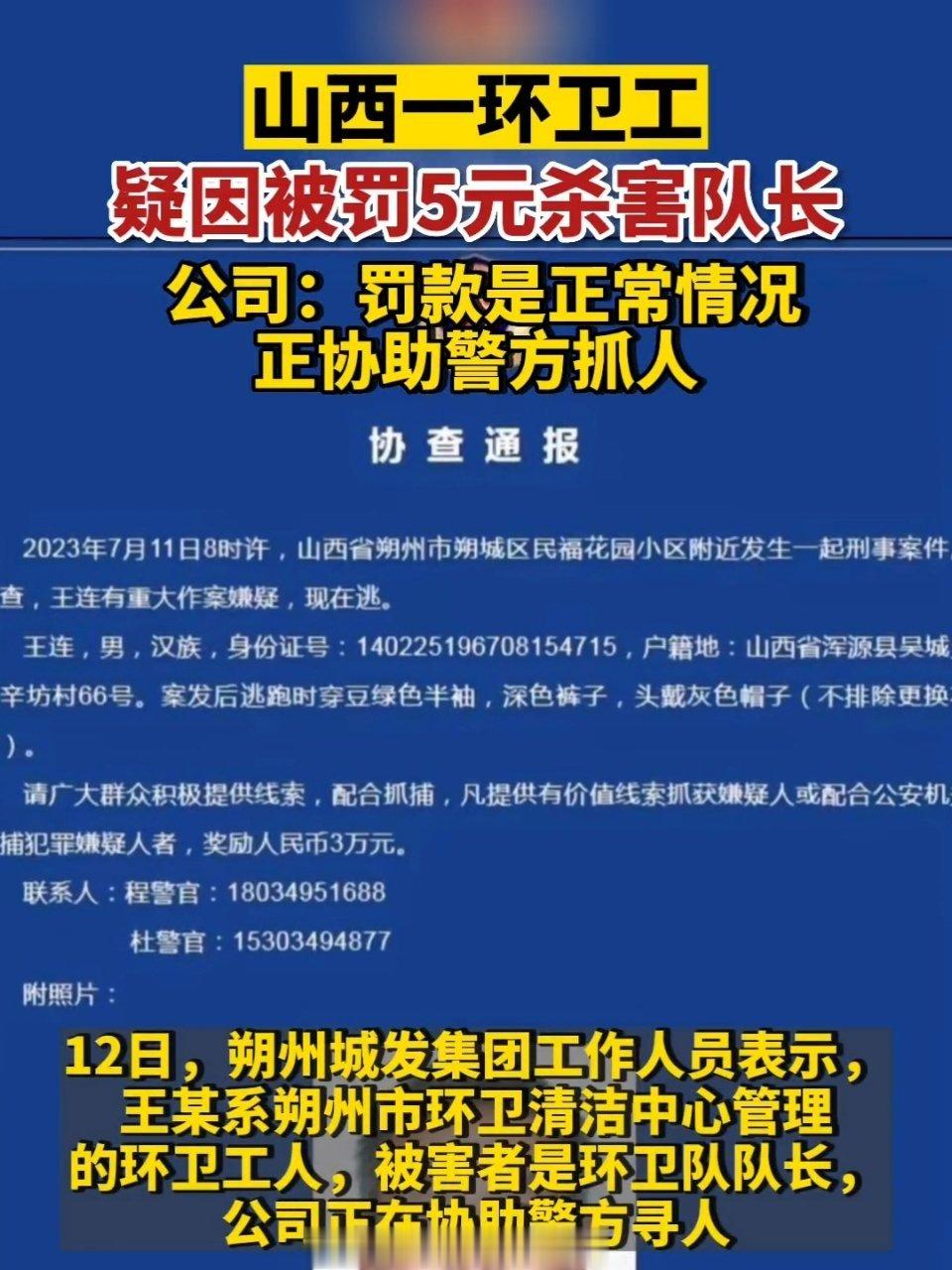 #山西朔州发生刑案警方悬赏3万缉凶##公司回应环卫工疑因被罚款5元行凶#