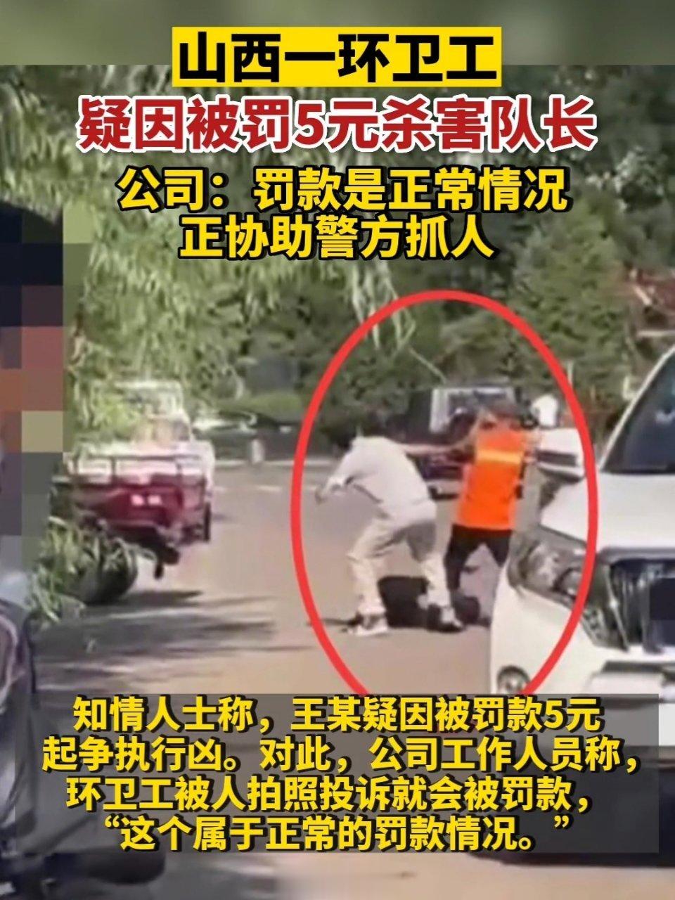 7月11日,山西朔州一环卫工疑因被罚款5元杀害队长,公司:罚款是正常情况。警方:悬赏3万元,正全力抓捕。
