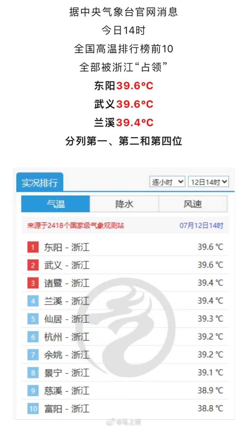 全国高温排行榜前十位全被浙江城市占领!分别是东阳、武义、诸暨、兰溪、仙居、杭州、余姚、景宁、慈溪、富阳。浙江,你别太离谱……[允悲]