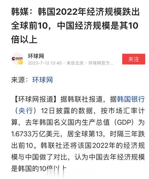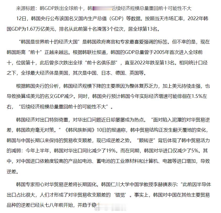 韩国央行:韩国2022年经济规模跌出全球前10,后续经济规模总量重回前十可能性不大。根据韩国央行的分析,韩国经济规模下降的主要原因为整体复苏乏力。