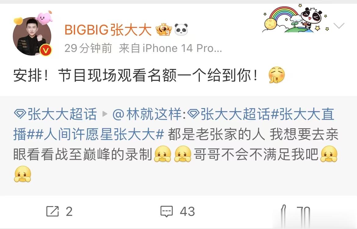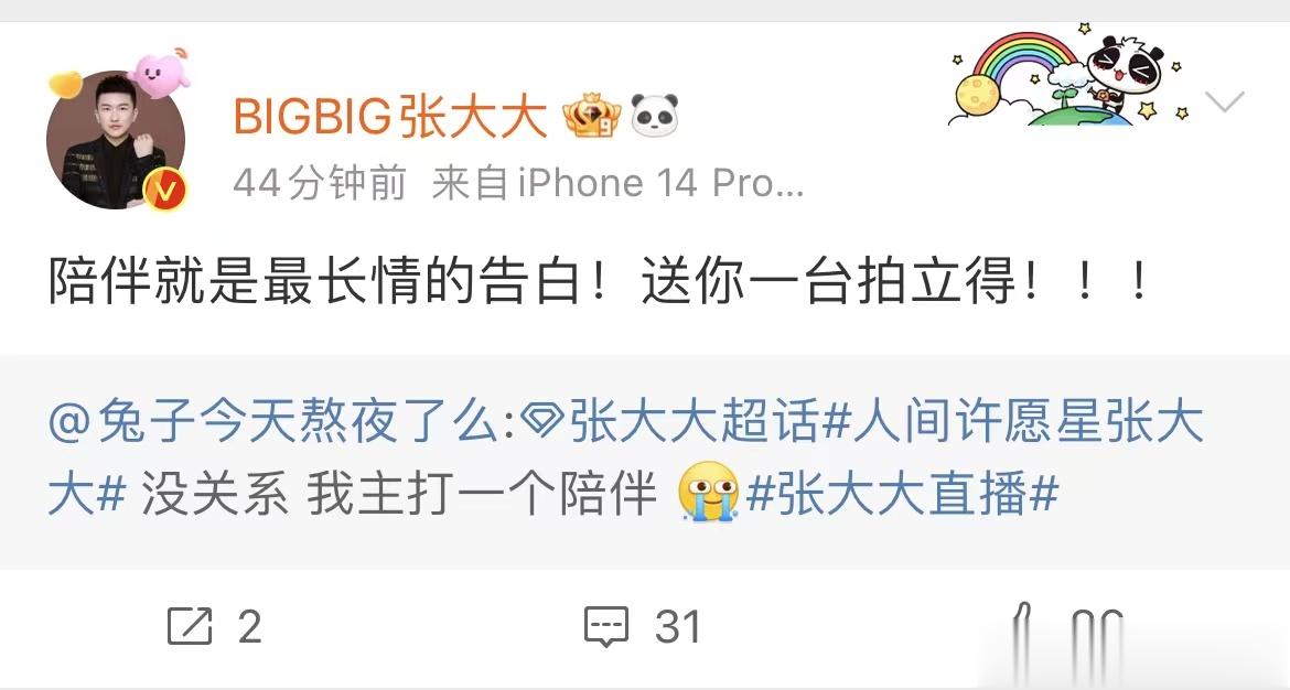 #人间许愿星张大大# 别的咱不说,就说张大大你是来真的啊,给粉丝送签名照就已经很棒了,怎么还能给粉丝找工作呢,人间许愿星这个称号你是实至名归啊