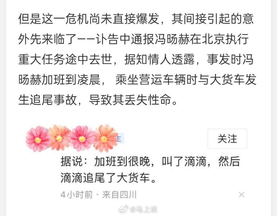 冯旸赫是怎么牺牲的?讣告中说执行重大任务途中遭遇车祸。什么样的车祸暂未有官方消息,网上有一未证实的消息称,说叫了一辆滴滴打车,结果竟追尾大货车?真的是这样吗?这也太离奇了…